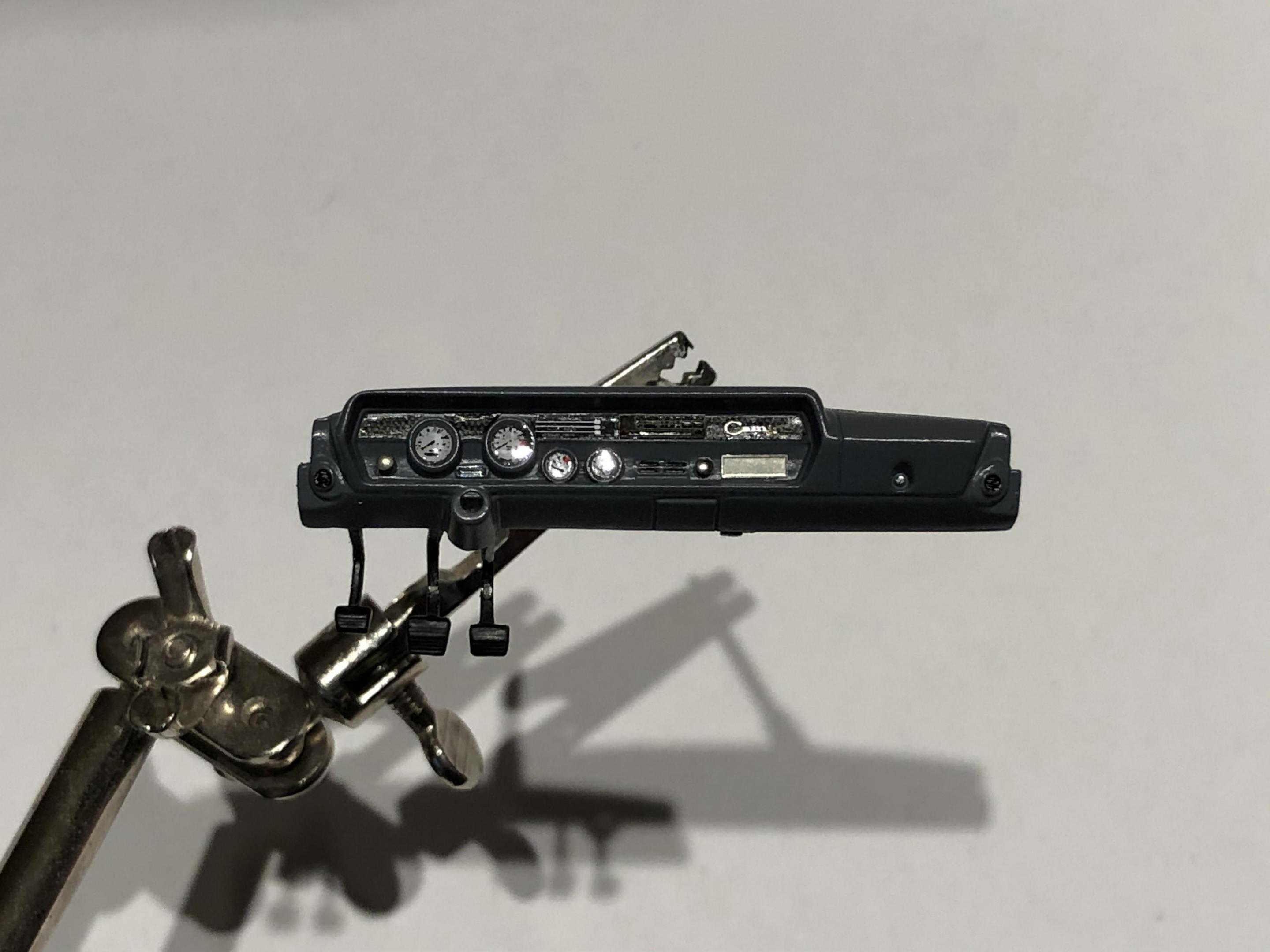 1. Another small update. Most of the interior is now in colour, I will have more photos in the next couple of days. The dash is nearly complete, you will have to trust me that it looks better in person than in the photo. I will take another photo in the next update. The gauge faces are from MCG, this is my first time using them, hoping for even better results next time around. I often use 5 min epoxy on my gauges for “glass” and did that, I will use a Molotow pen to add a Chrome trim ring around gauges. Added carbon fibre decals, photo etch CD player, a couple of pin heads for knobs, the photo etch “Camino” script got a bit warped but looks better than in the photo. I decided “Camino” was enough, still searching for a good name though....