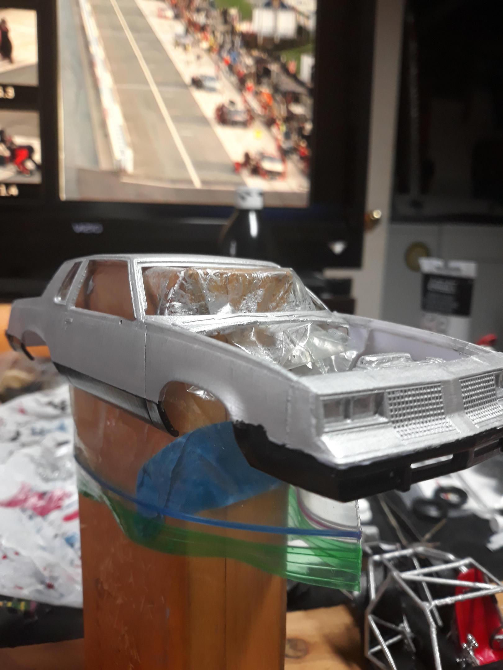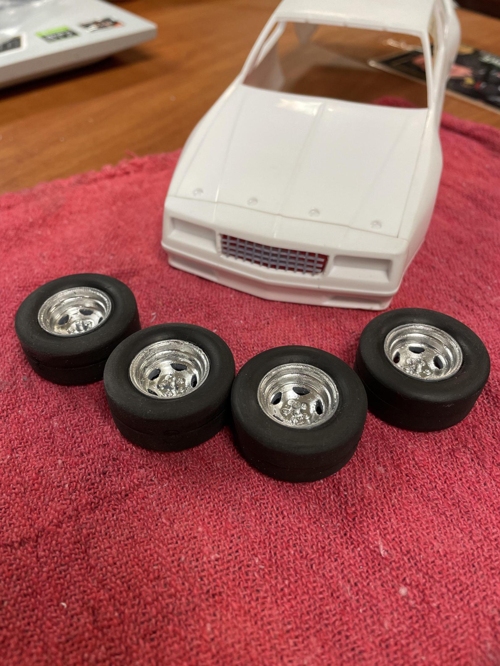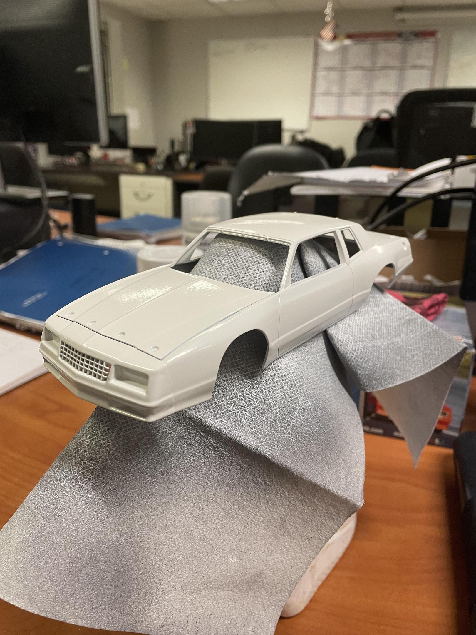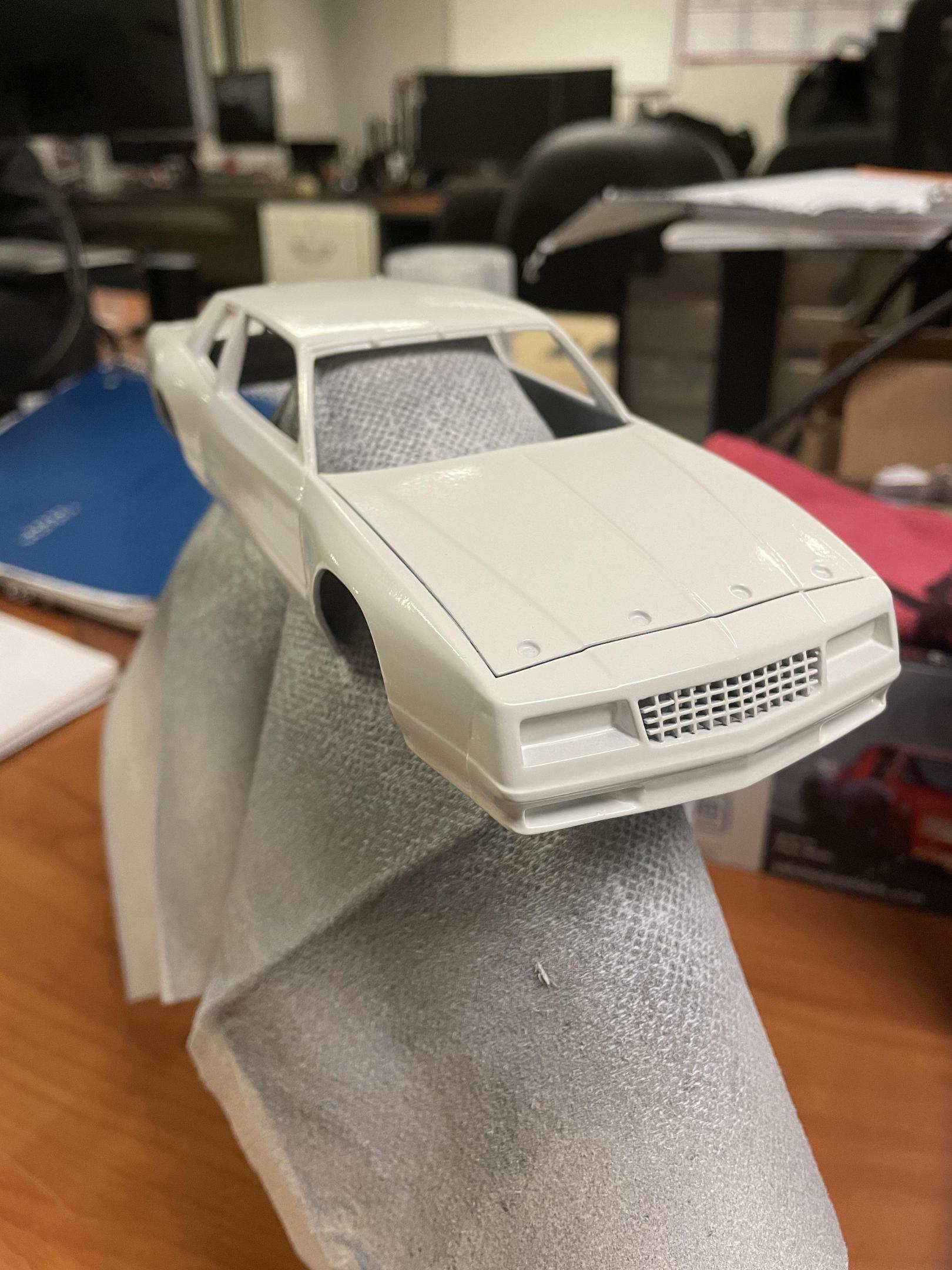 After sitting sideline watching model car videos, felt it was time to get back into the hobby with all new knowledge. 1983 AJ Foyt Monte Carlo used as a base with rims, exhaust, and grill insert bought from Salvinos'. Window net was made from masking tape per a video from Clay Kemp. Decals were from an independent seller. Front wheel wells were extended using a sheet of styrene and some putty, quite happy with how they turned out. I regret not putting down a base white coat on the rims before using Molotow chrome pen, but it will have to suffice. Body was shot with 2 coats of primer, 3 coats of white, and currently drying is 1 of 2 clear coats before decals are applied. All sprays are rattle can and the white is Dupli-Color GM bright white. If you have any questions on methods, paints, or assembly I'm more than willing to share. Thanks for looking!