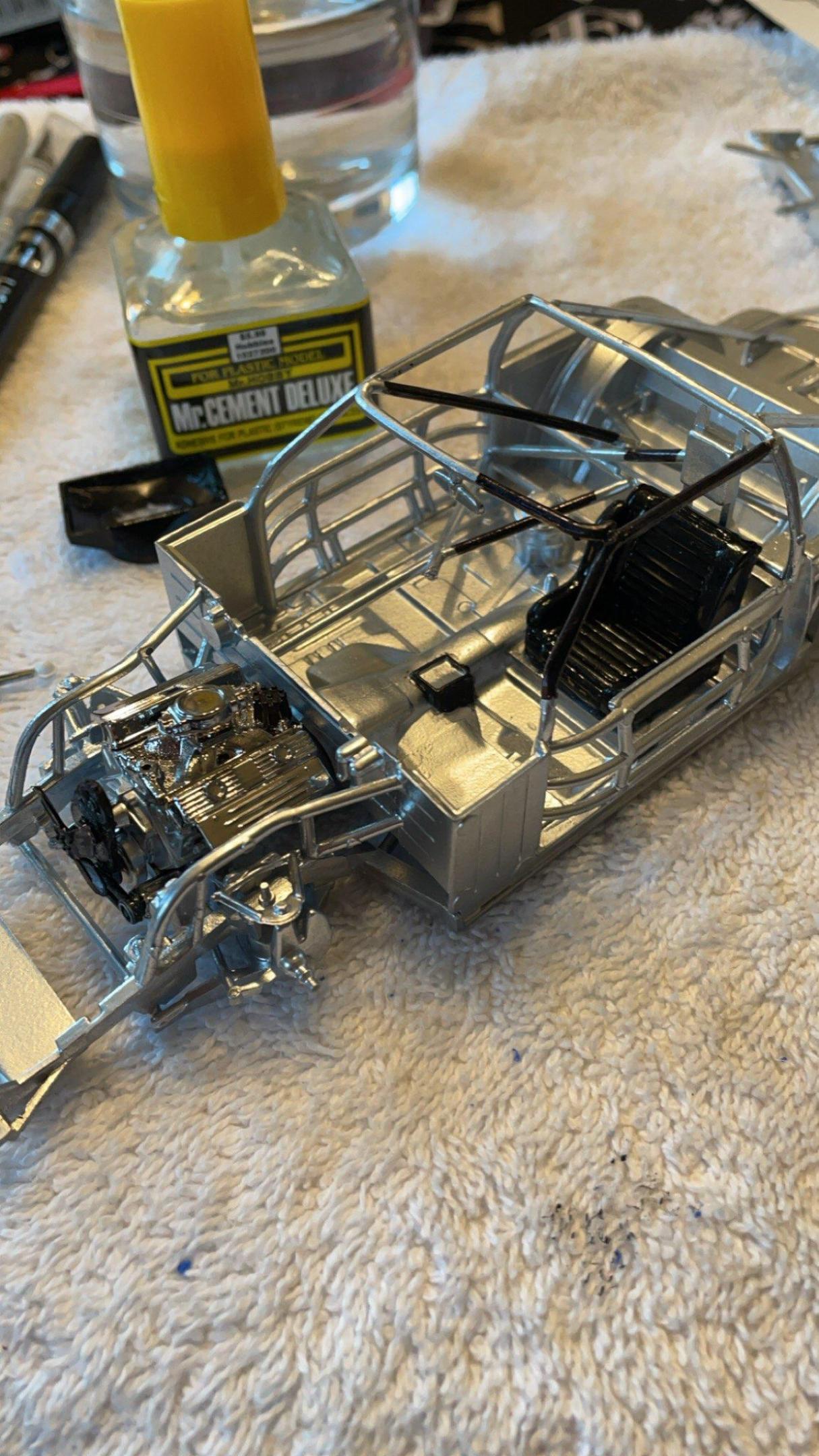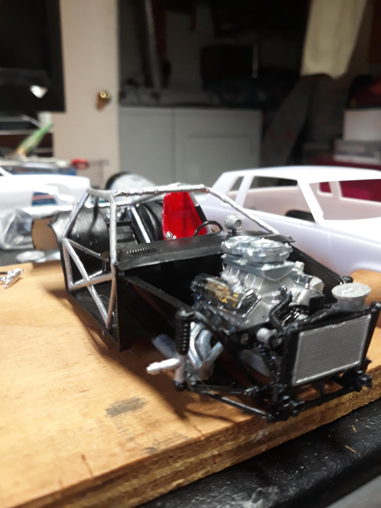 Thanls for the advice SSNJim. Huge update incoming. Roll cage is finished and was able to get the hood bulge flatten by cutting out the old one, and using the roof of the Chevy. Engine and the radiator were also installed. Next order of business is rear axle and wheelie bars. -