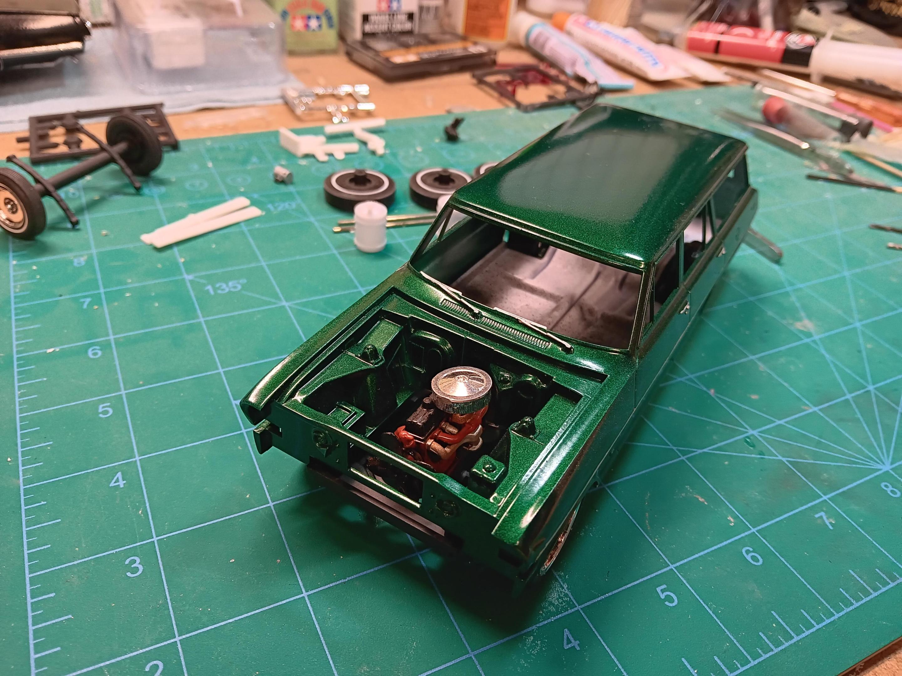 Two years later, and I've finally got some progress to show. Got the body on the chassis for another dry fit. Engine is ready to go in. I am happy with the wheels and stance. Another opportunity has risen, with the chrome air cleaner, the hood won't sit flat. I hadn't even thought to check that. So, have to figure out what to do there.