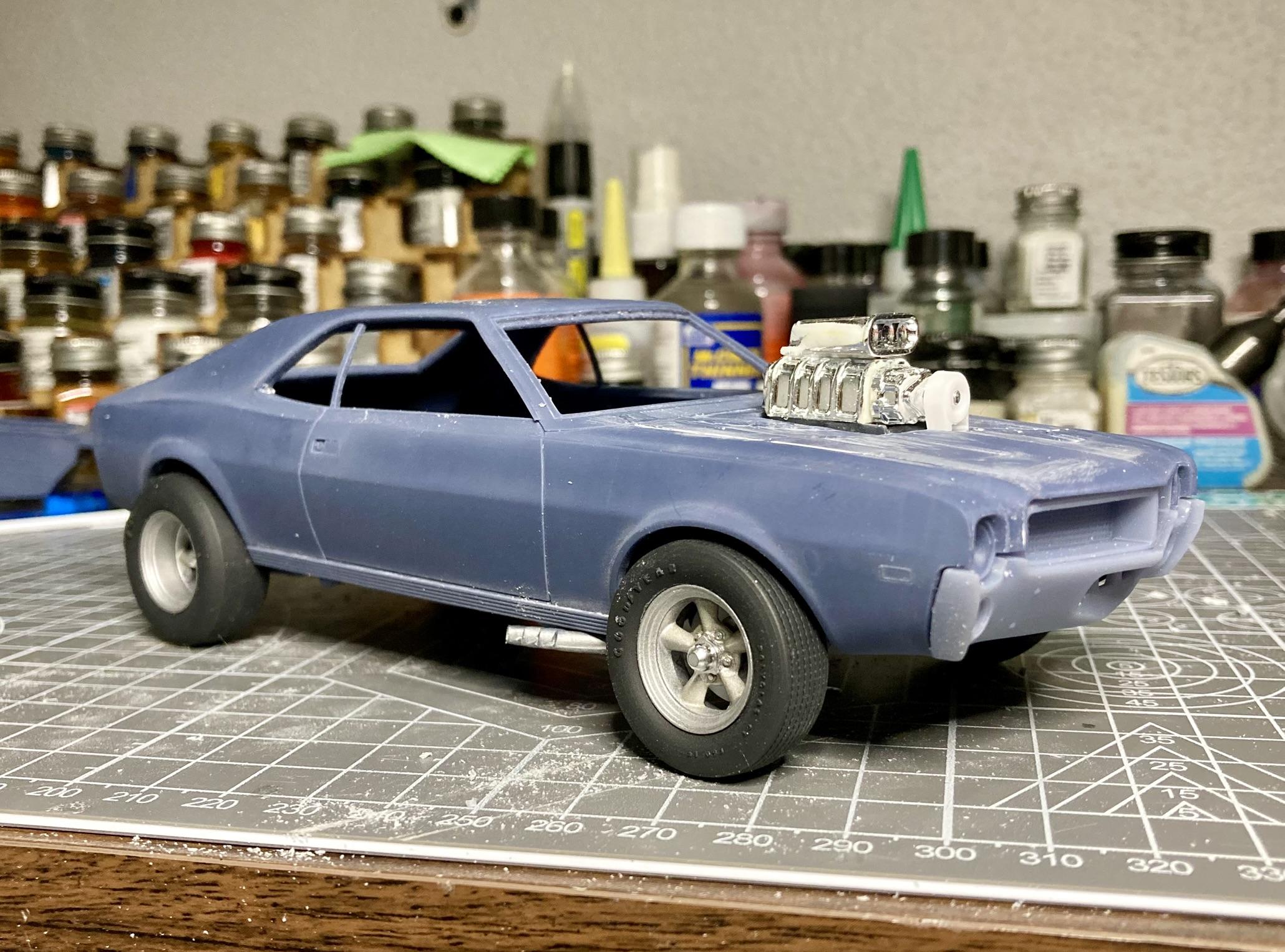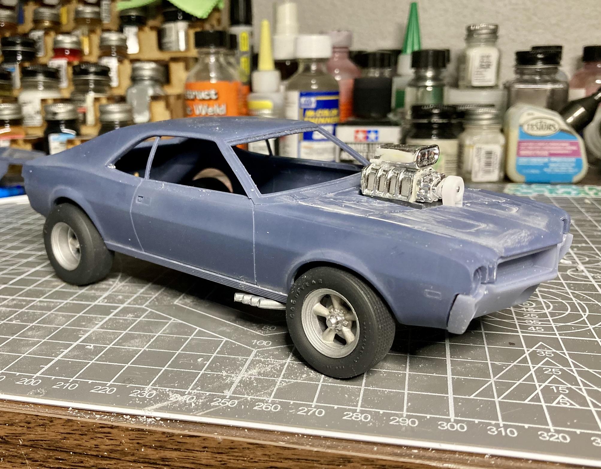 The ebay seller ghosted me after he said he'd send another hood...never showed up, then he "was away" on ebay for a month. But I didn't push it either. Then I cracked the hood -again- trying to tweak it and decided to just glue it all back together on the body, bodywork it in place and forget about any engine. The blower and hat are from a Revell Charger funny car. I cut the hole in the hood then glued a piece of styrene to the bottom side to support the blower. I filed the intake until it sat at the right angle and added a pulley/belt piece from the parts box. The zoomies on the car in the ad are certainly fake (I mean, the blower too I'm pretty sure), so I didn't feel bad about just cutting the ends off of the headers from that same funny car engine and fitting them to the floor of the car. Added shackles to the rear springs. Finished sorting out wheel mounting, but I'm still not happy with the wheel offset or tire size on the front. Might keep working at it, might roll with what I have.