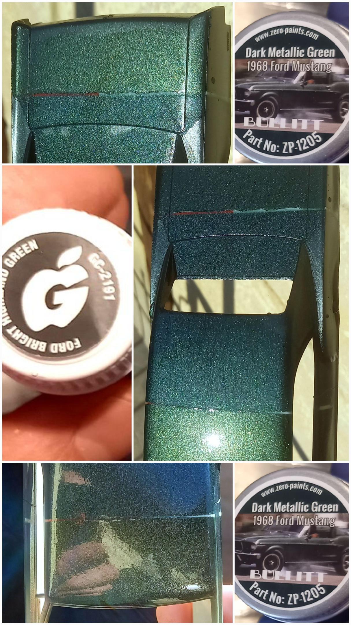 Did a paint test with the highland green colors I bought years ago for this project. Gravity "GC-2191 Ford Bright Highland Green" has a blue-ish but otherwise nice dark tone to it. Zero "ZP-1205 Dark Metallic Green 1968 Ford Mustang Bullitt" is a greener, lighter color. Both have way too much metallic "flake" in them. Tried using them unstirred, but that makes both of them very dark. I might buy automotive paint custom mixed without the "flakes". Edit: my phone's camera makes very grainy pictures, so that is a factor to the photo, on top of the metallic paint.