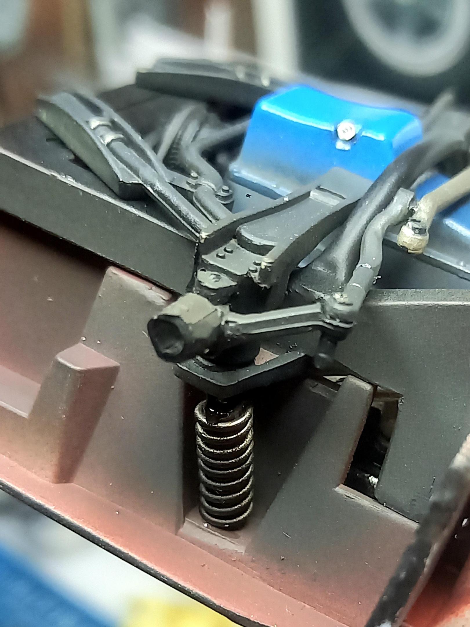 A little update: almost forgot to replicate the front side of the radiator, which was necessary since I did not cut an opening in the radiator support. I used a piece of tulle(?) ribbon and heat shrink tube slices on both sides. I also made "cheating hood hinges" out of beercan material ? and some coil spring from a 4-color pen. These hinges will not operate properly - did that on my '70 Dodge Challenger build, not this time. So the hinges will just sink into the engine bay when the hood is closed, and will rest on a pair of flanged studs at each side when the hood is up. Managed to blue tack the hinges in the lowered position, then glue the hood onto them on one model so far. Also had highland green paint custom mixed without the metallic flake, and semi gloss 2-part clear to go with it, though haven't tested them yet.