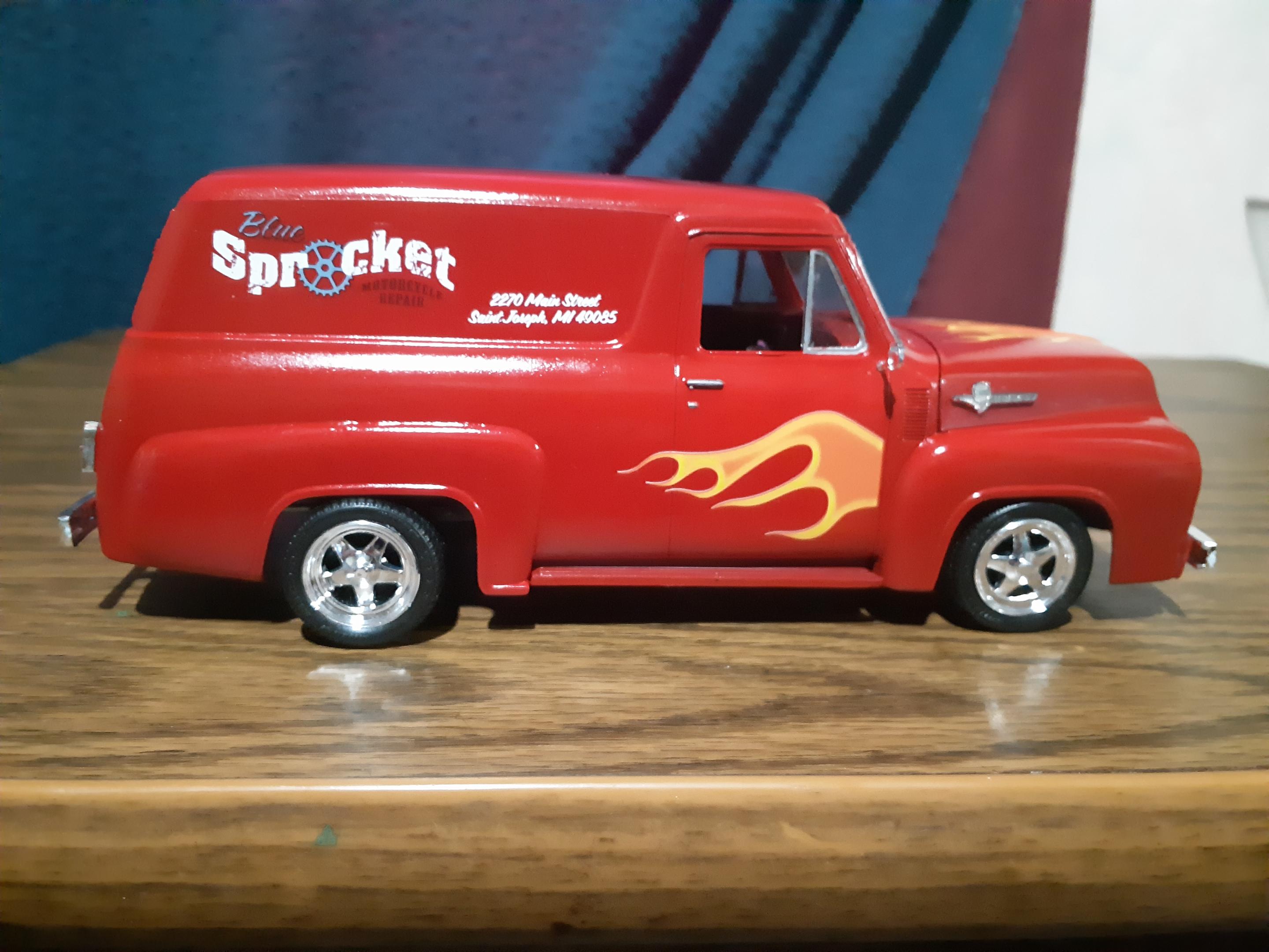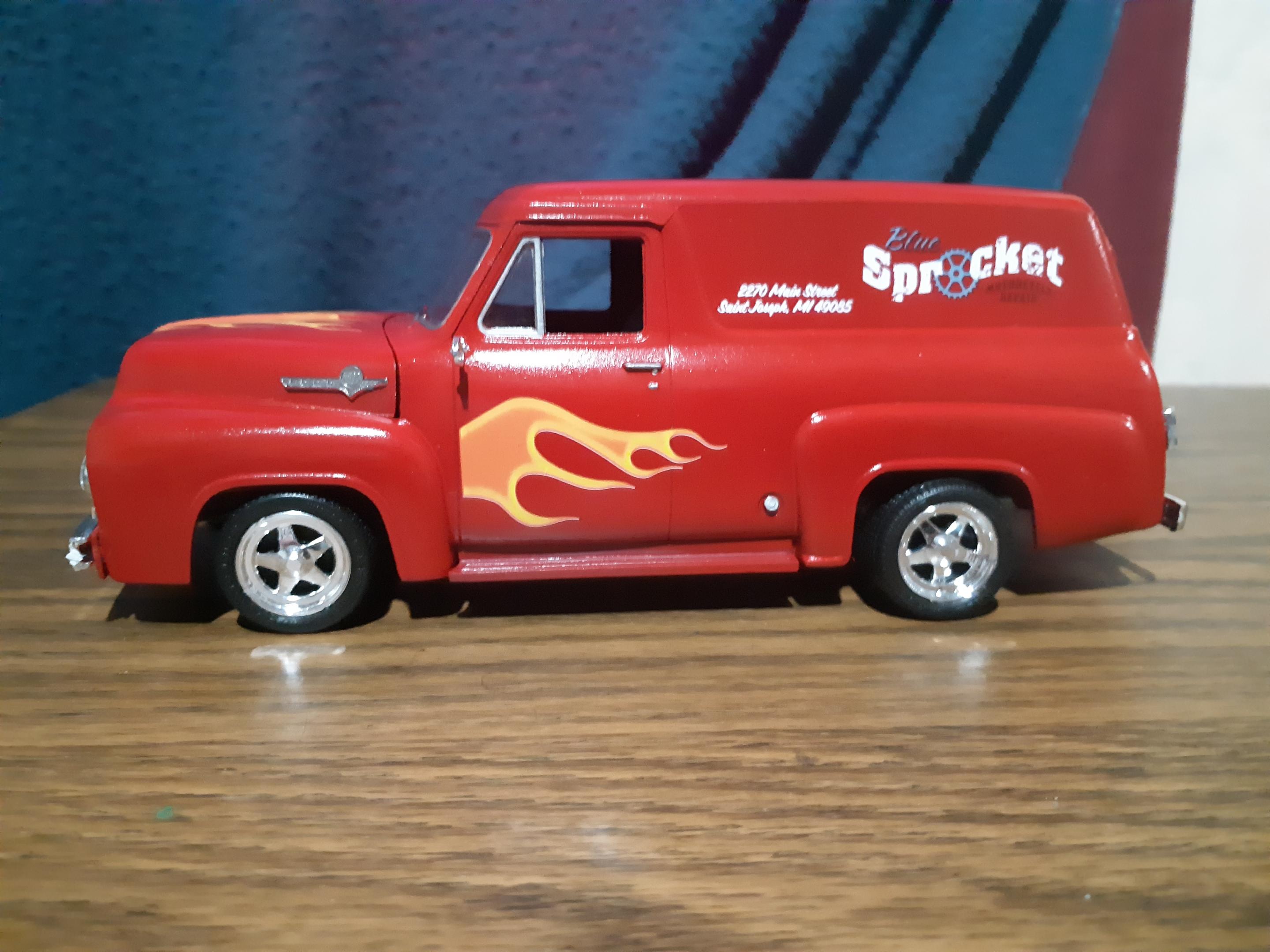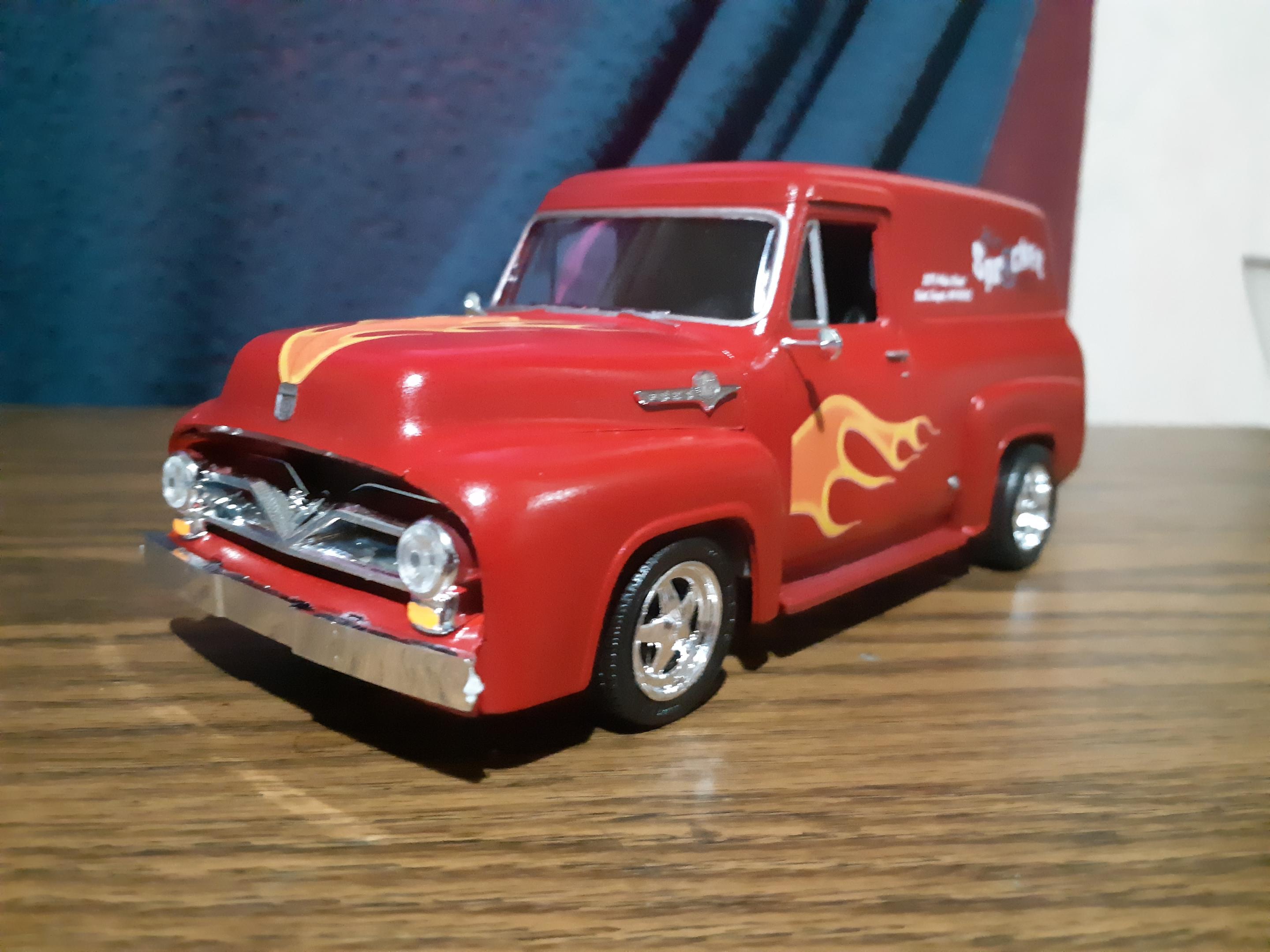 Just finished up my latest build, a 1955 Ford Panel Truck. Build went together well, had to strip off the previous builders 5 different paint colors and the excess glue that was used to attach everything together. Wanted to make it stand out so decided on some flames and parts box decals to break up all the red paint. Overall I'm happy with how it turned out, went from a basket case to something that would get my attention if I seen it rumbling down the highway.