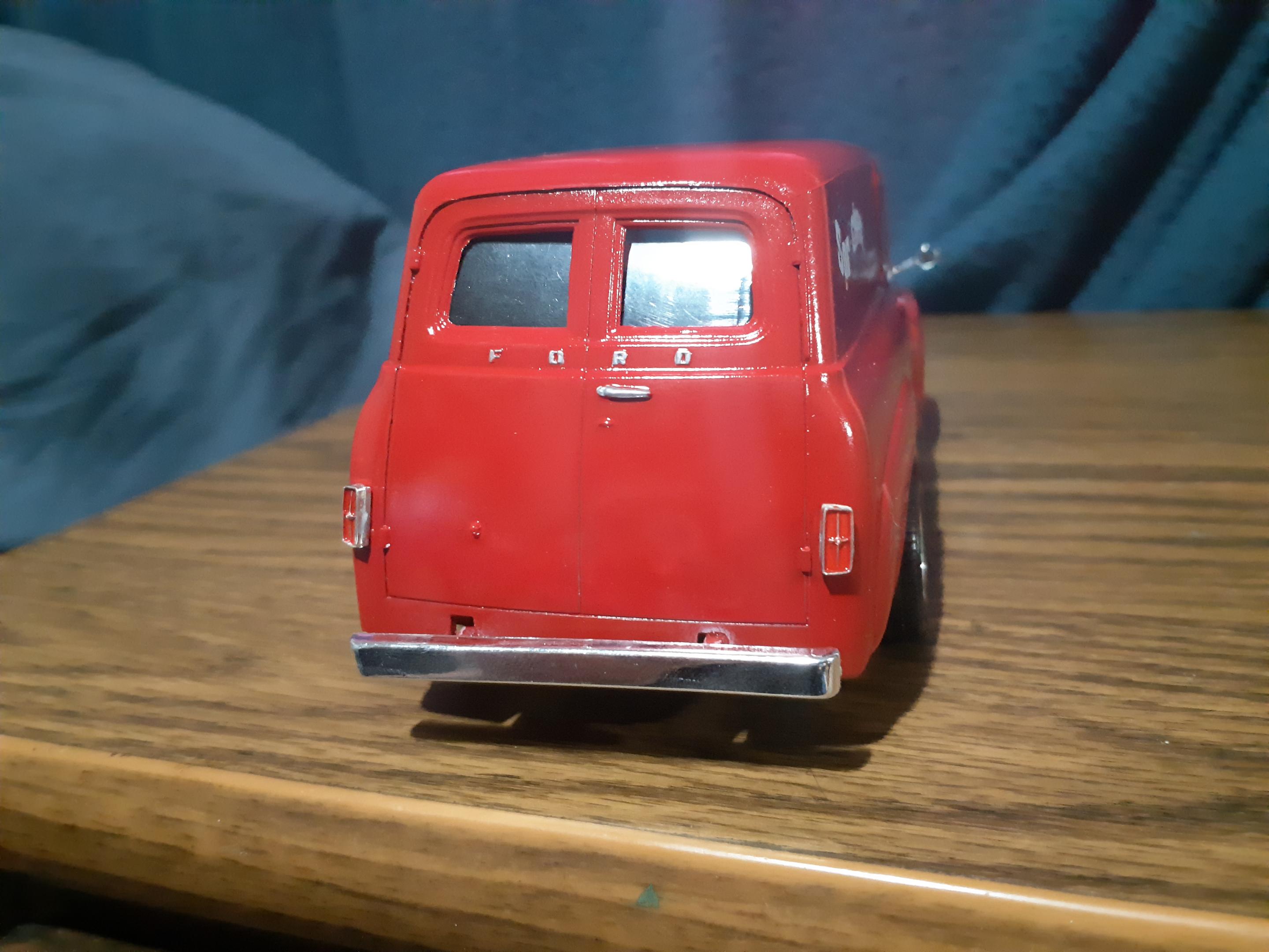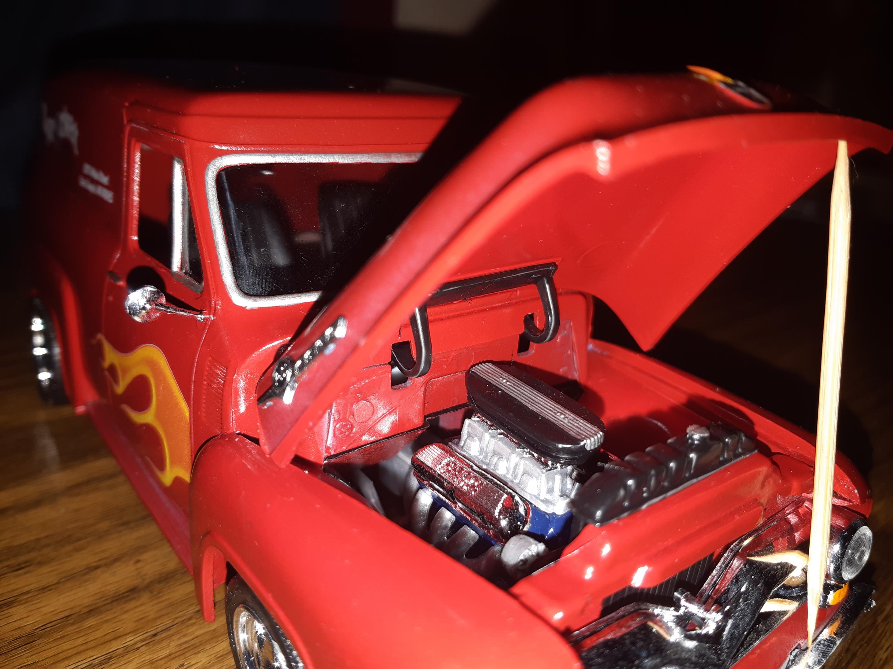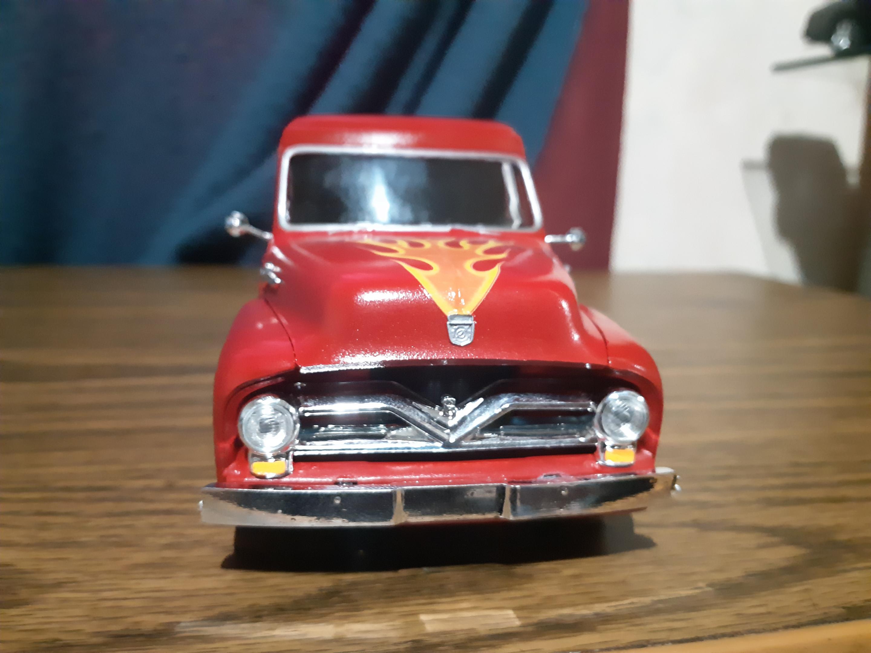 Just finished up my latest build, a 1955 Ford Panel Truck. Build went together well, had to strip off the previous builders 5 different paint colors and the excess glue that was used to attach everything together. Wanted to make it stand out so decided on some flames and parts box decals to break up all the red paint. Overall I'm happy with how it turned out, went from a basket case to something that would get my attention if I seen it rumbling down the highway.