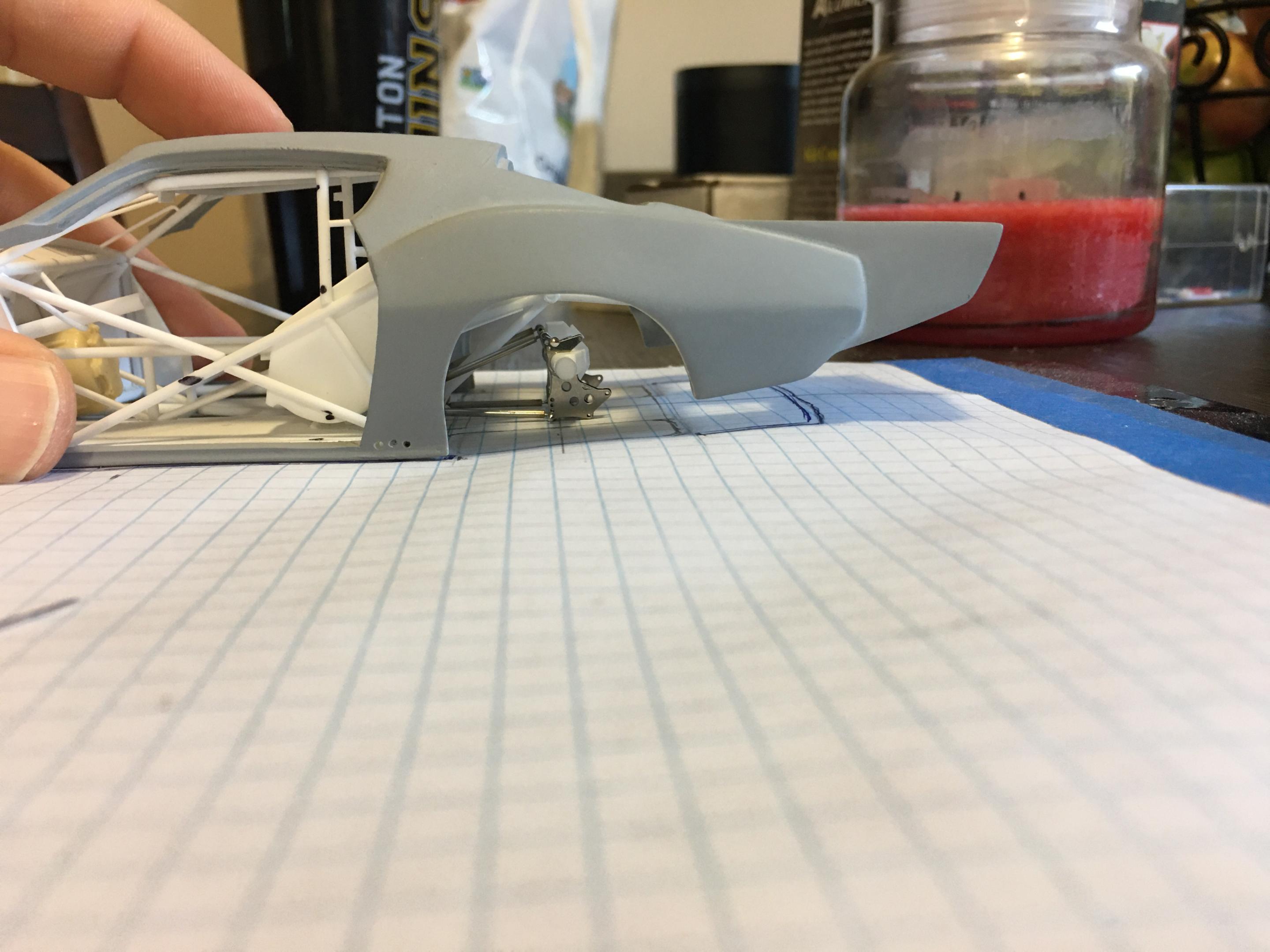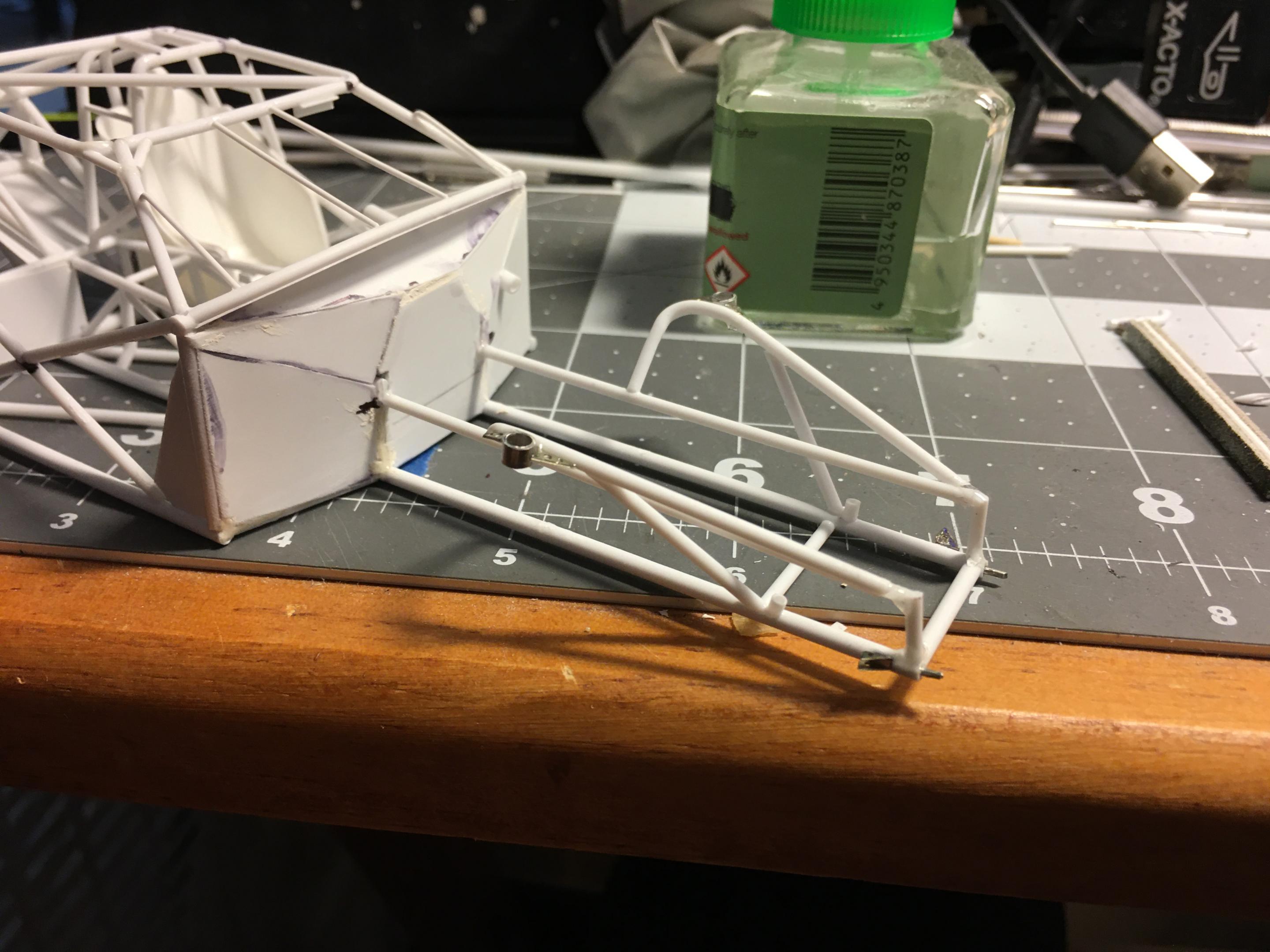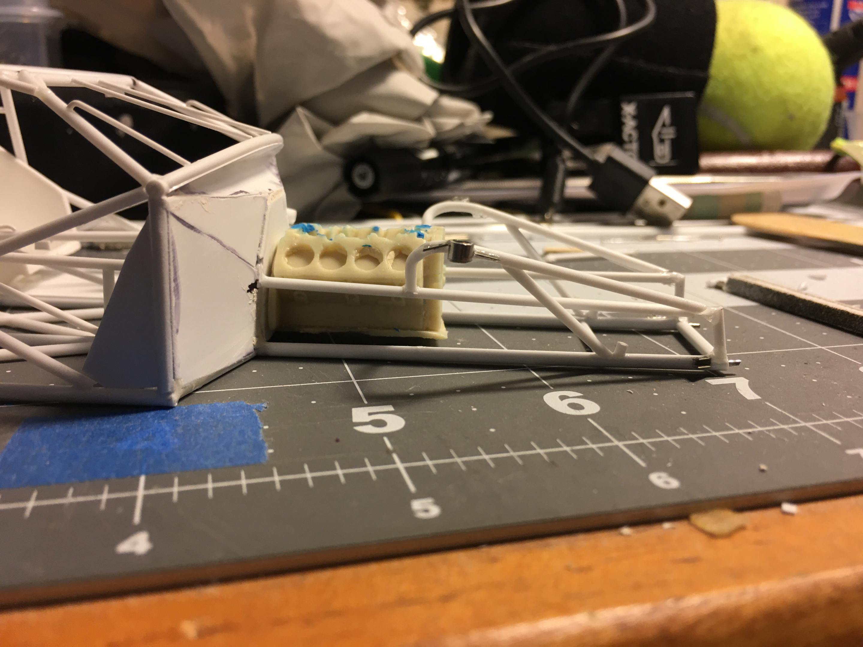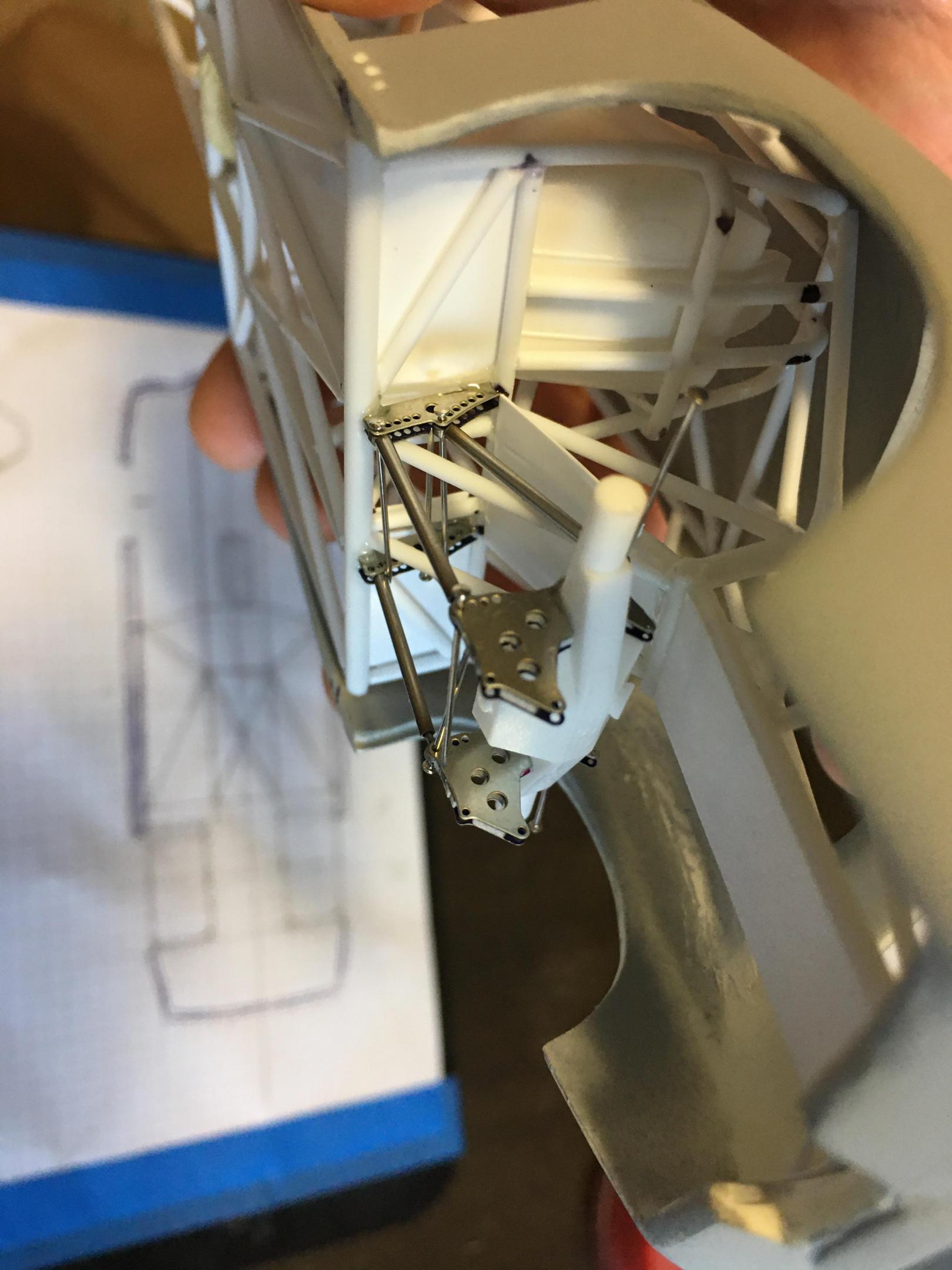 13. Hello, yesterday I did start mocking up the rear suspensions for this project, now I need to scratch build my suspension shocks for this setup, later on will be the wheelie bars to get this area ready for paint