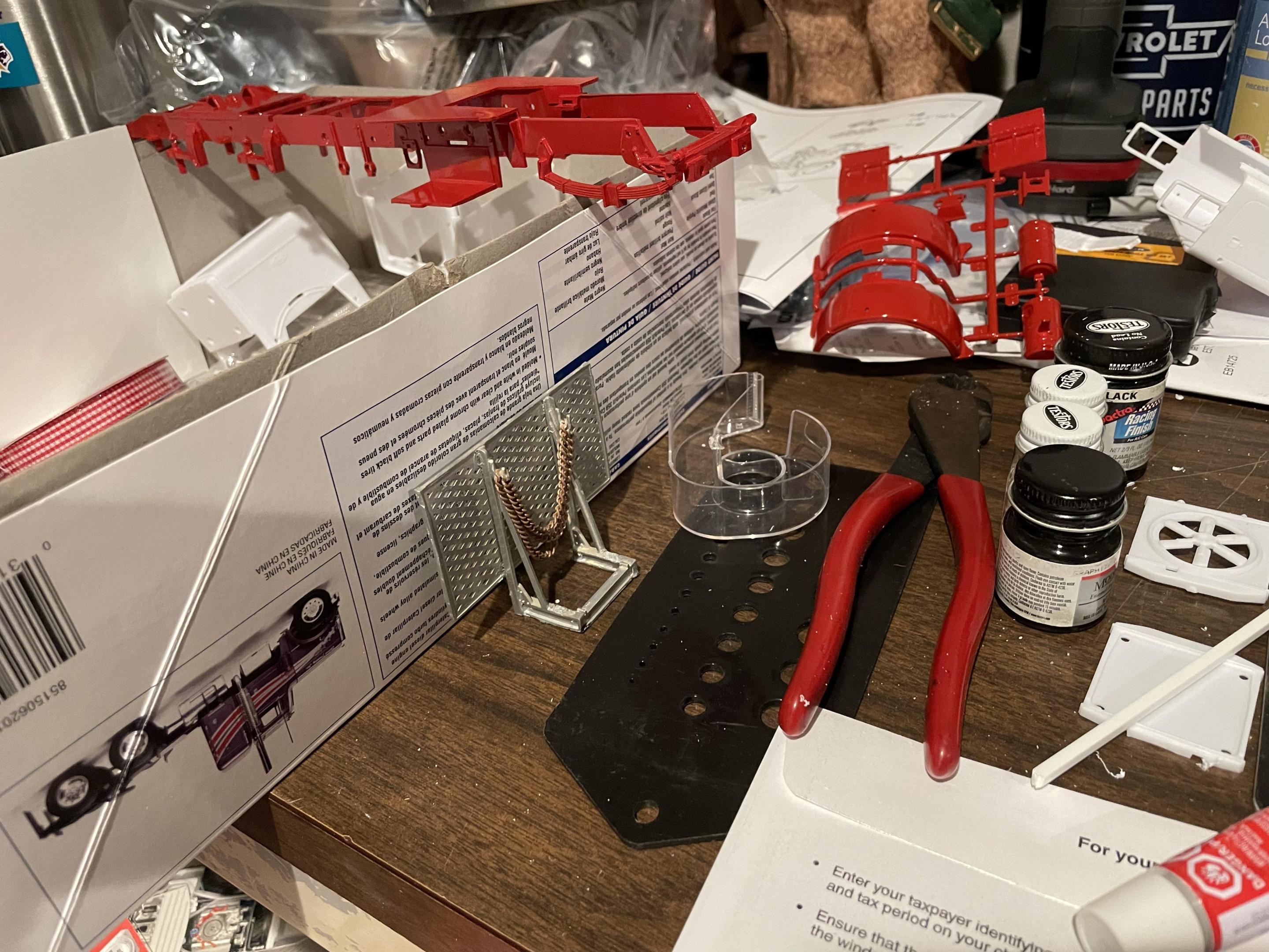 Chassis is in paint. Krylon colormax gloss banner red. Will be two toning it. Not sure I want black on top. Maybe gray. From a build long ago, I have a headache rack off of an Alaskan Hauler. -