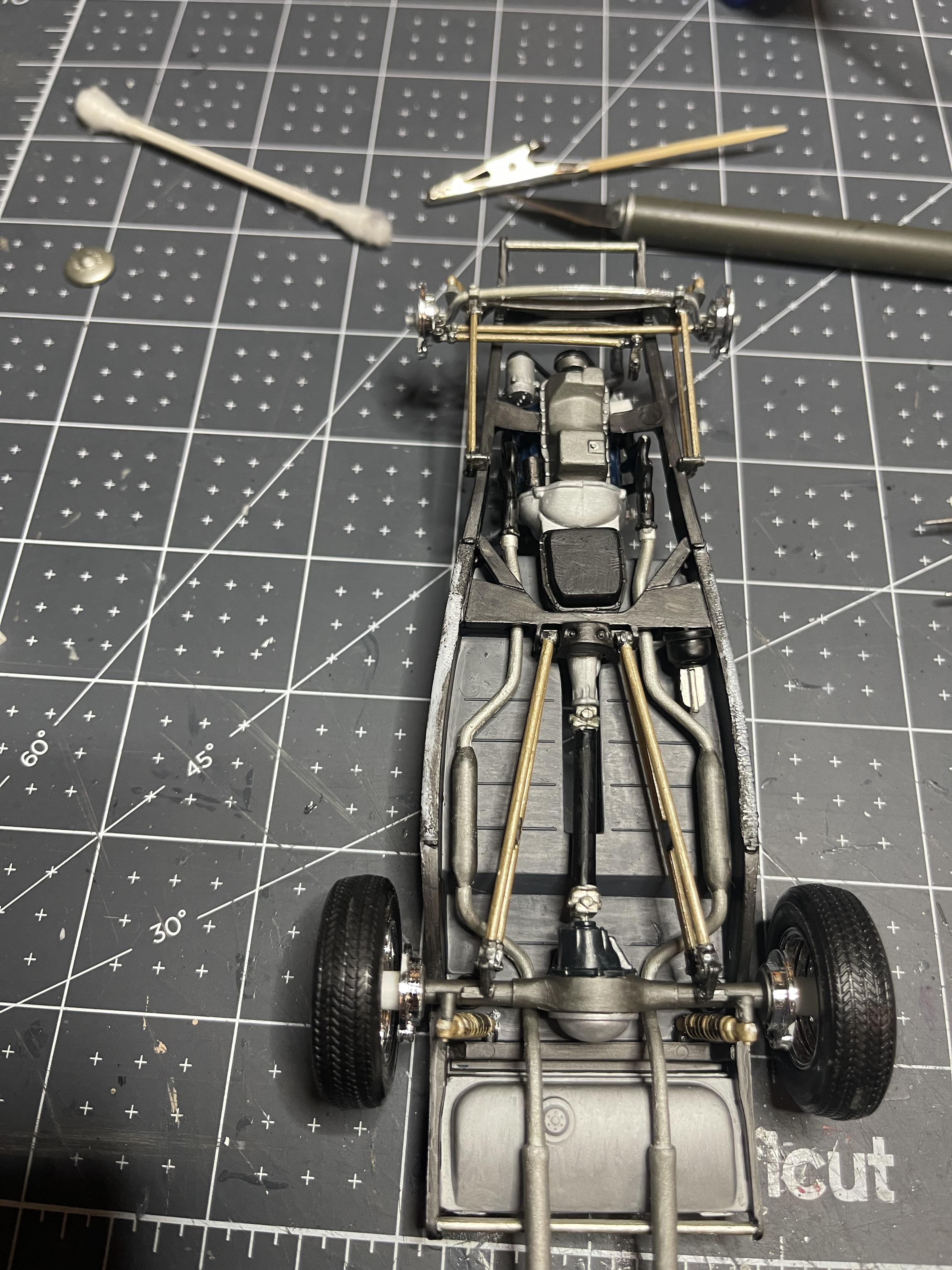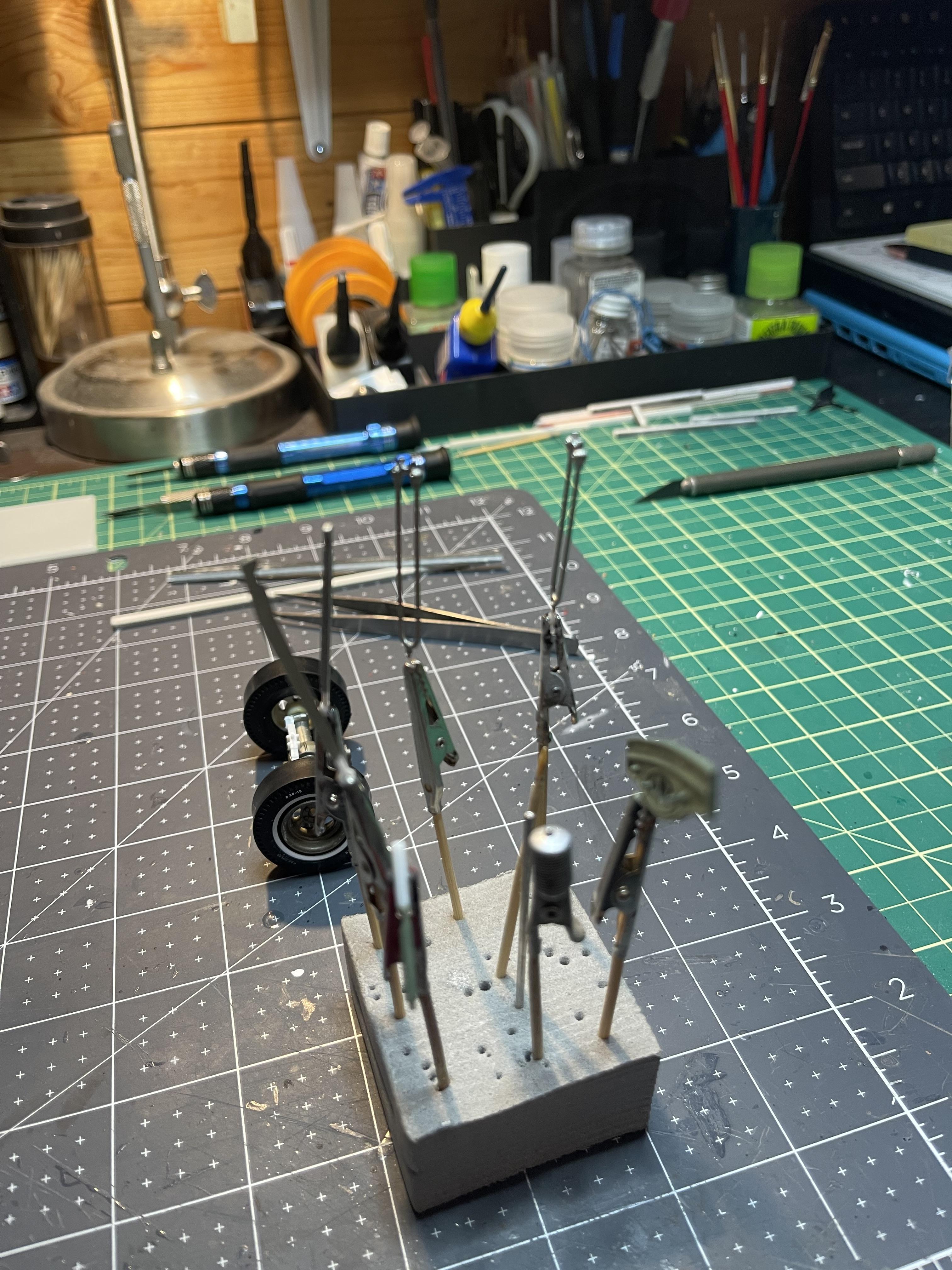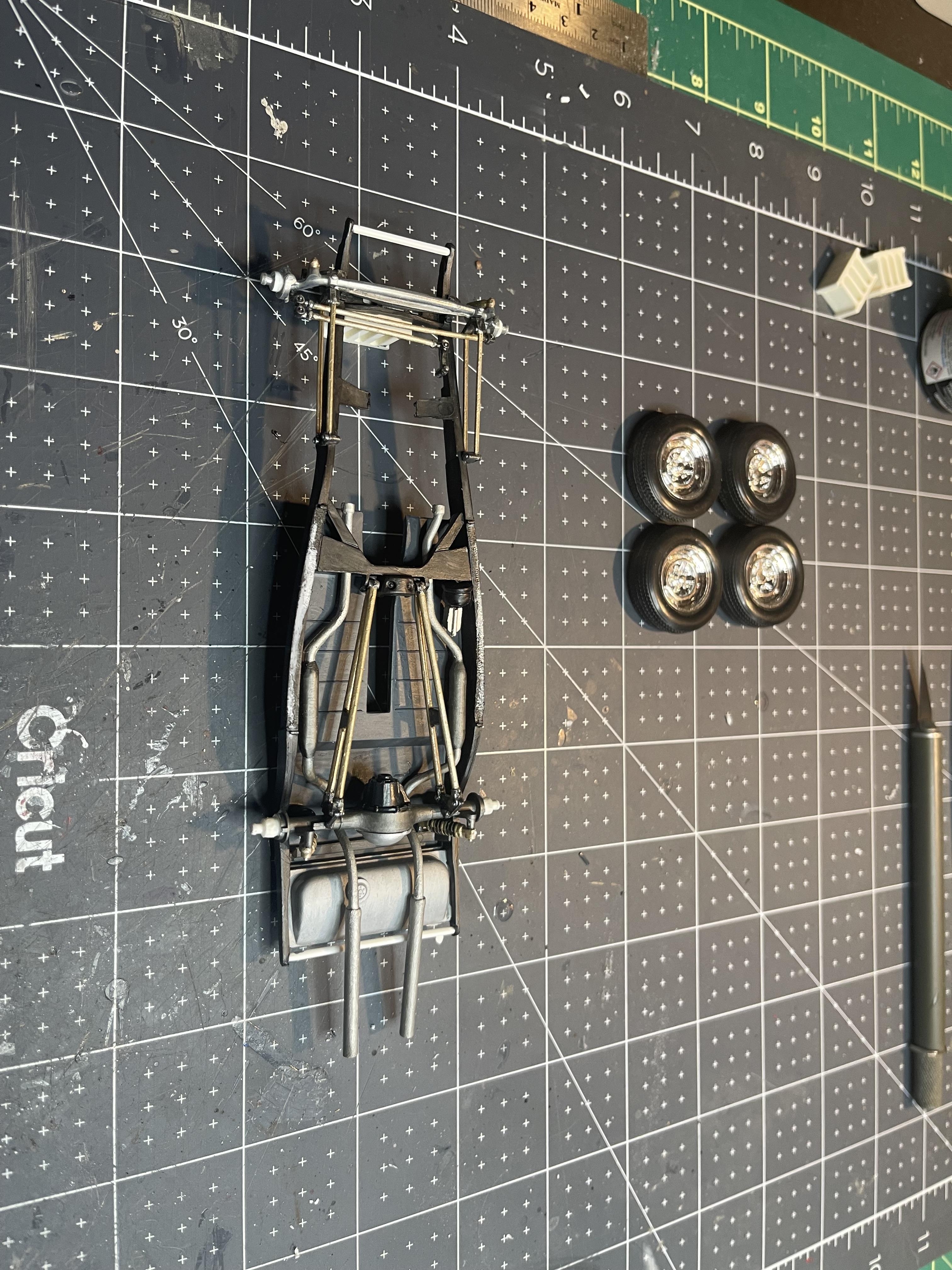 Added some positive locating points to the frame for the rear buggy spring and the front hairpins, rear radius rods. They are a little crude but will suffice, some trimming and sanding will occur once the cement sets and they have hardened to the chassis. Meanwhile some parts are drying after some detail painting. Hoping to have it on four wheels soonish, thanks for looking.
