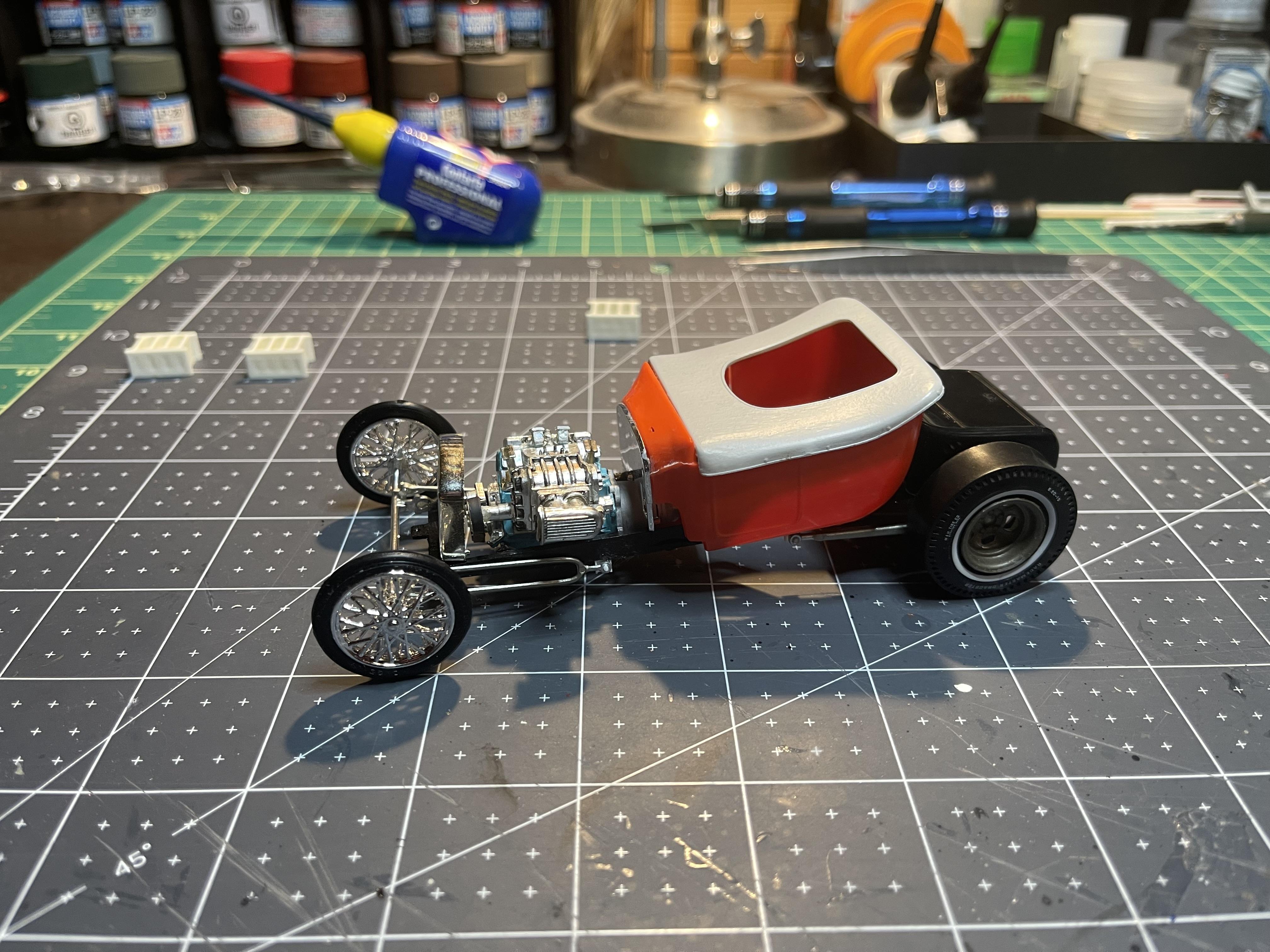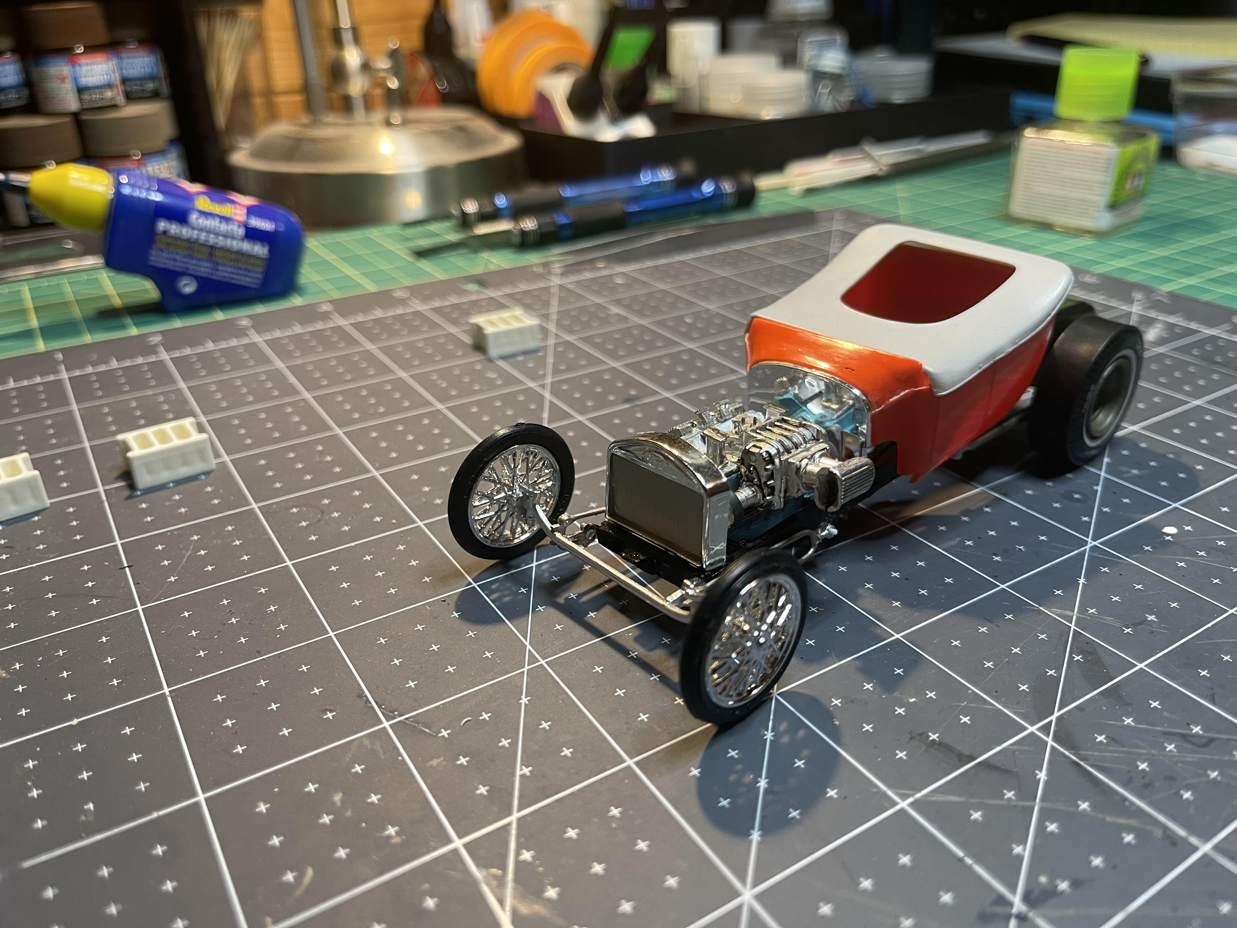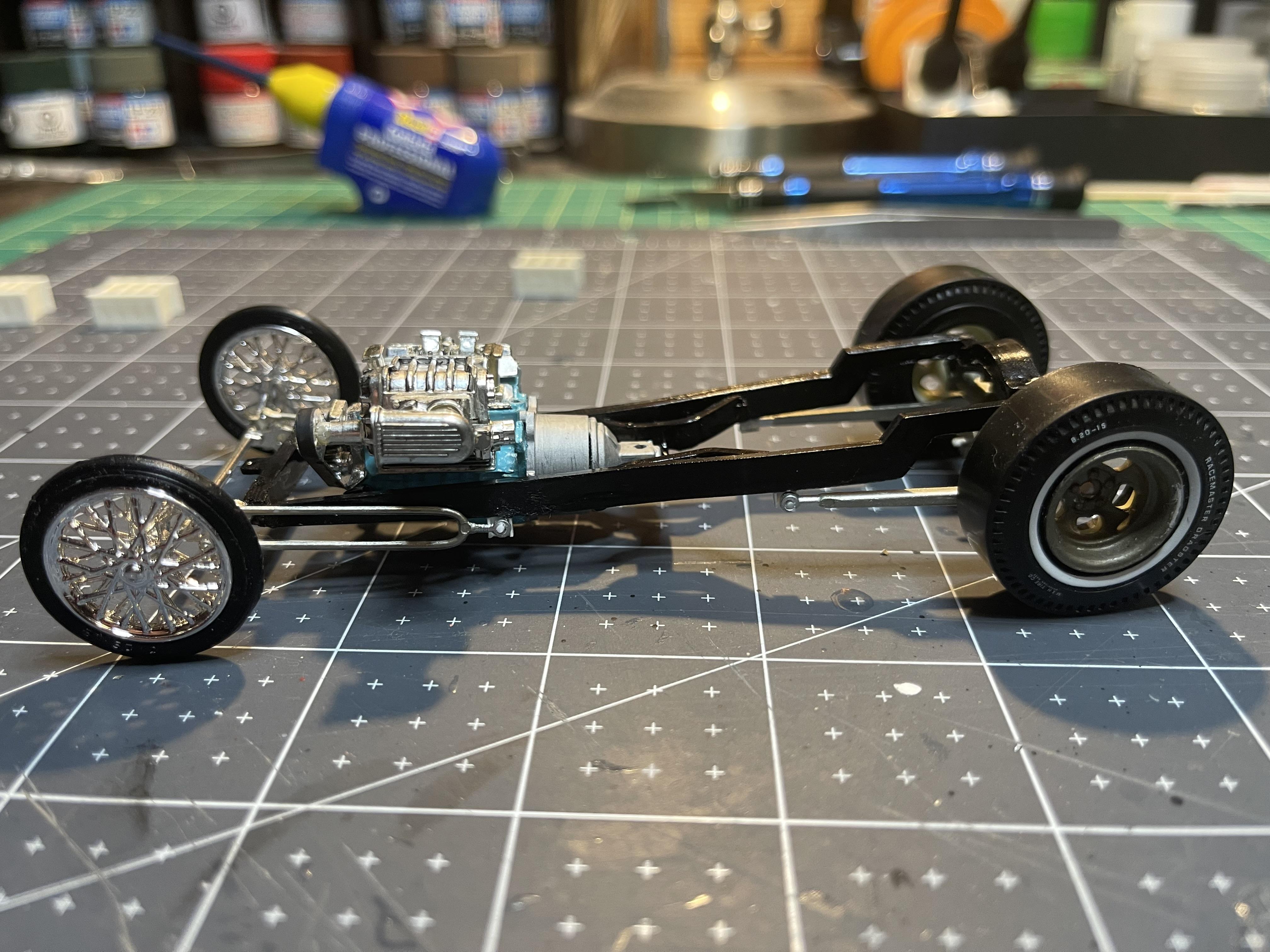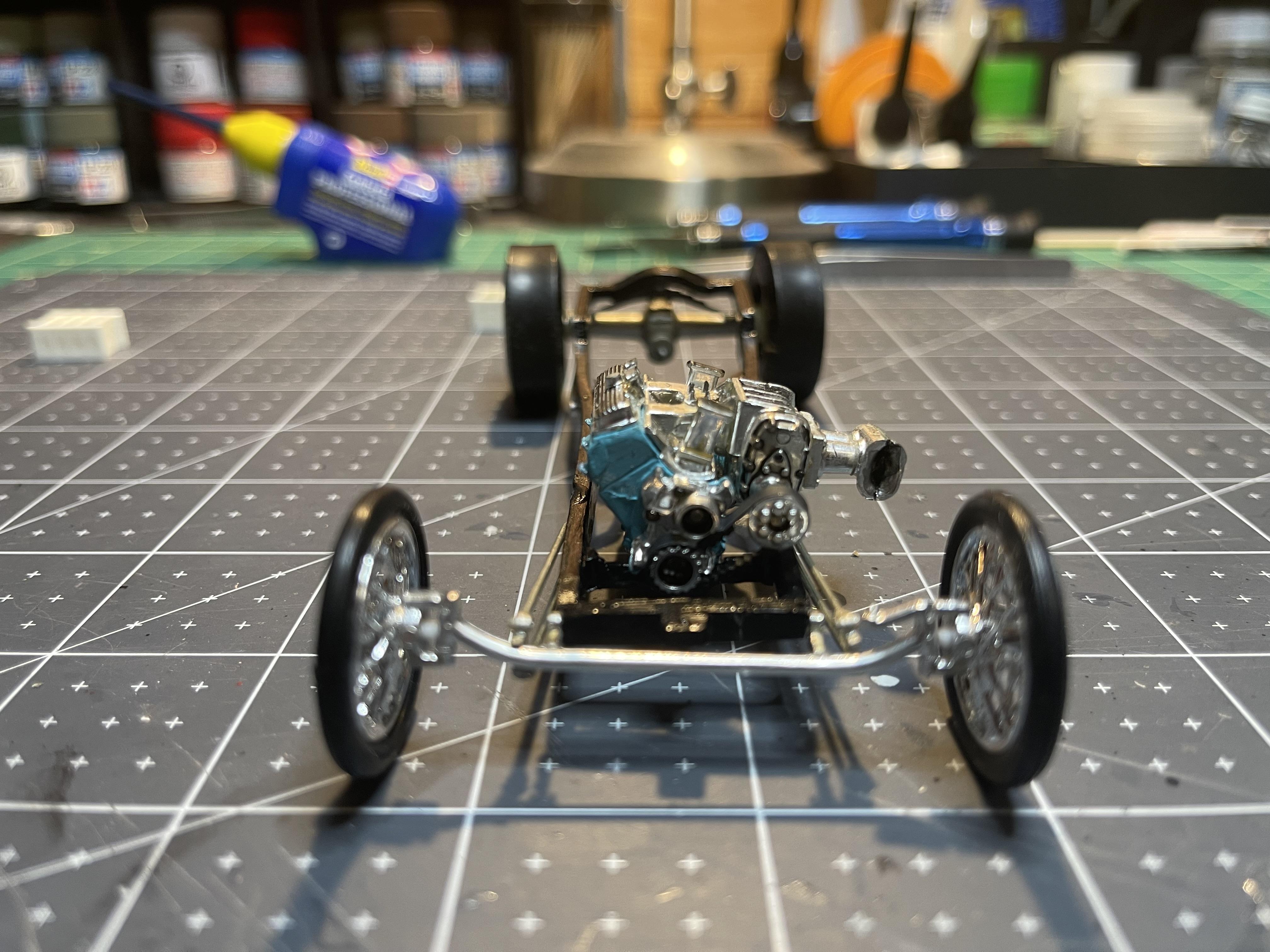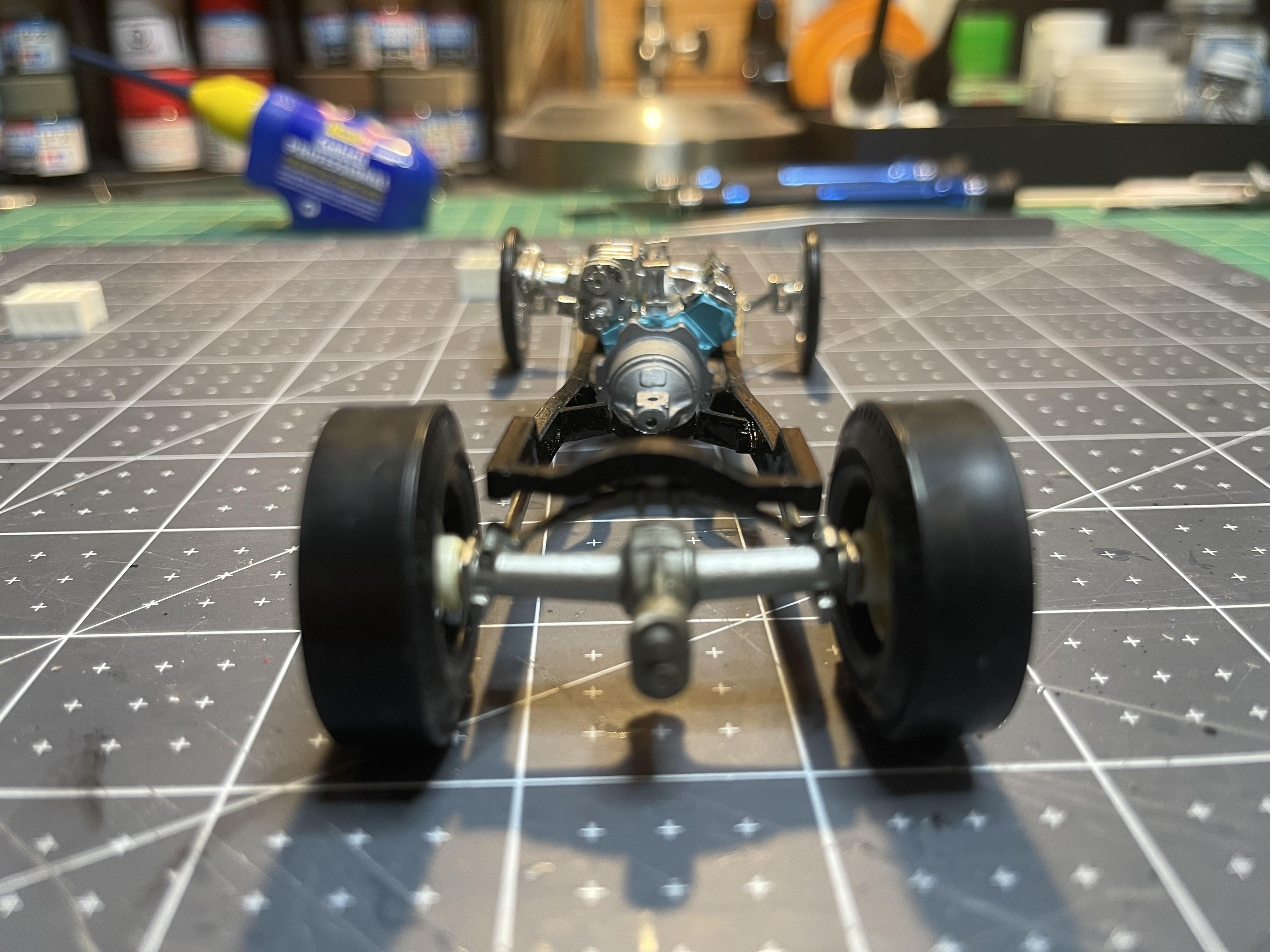 Itās starting to take shape now, forgive the misalignment of the rear axle and the dangling hairpins, this is just laid together loosely atm. Iāll move along with finishing the engine now. This has more drag flair than street cred now though.