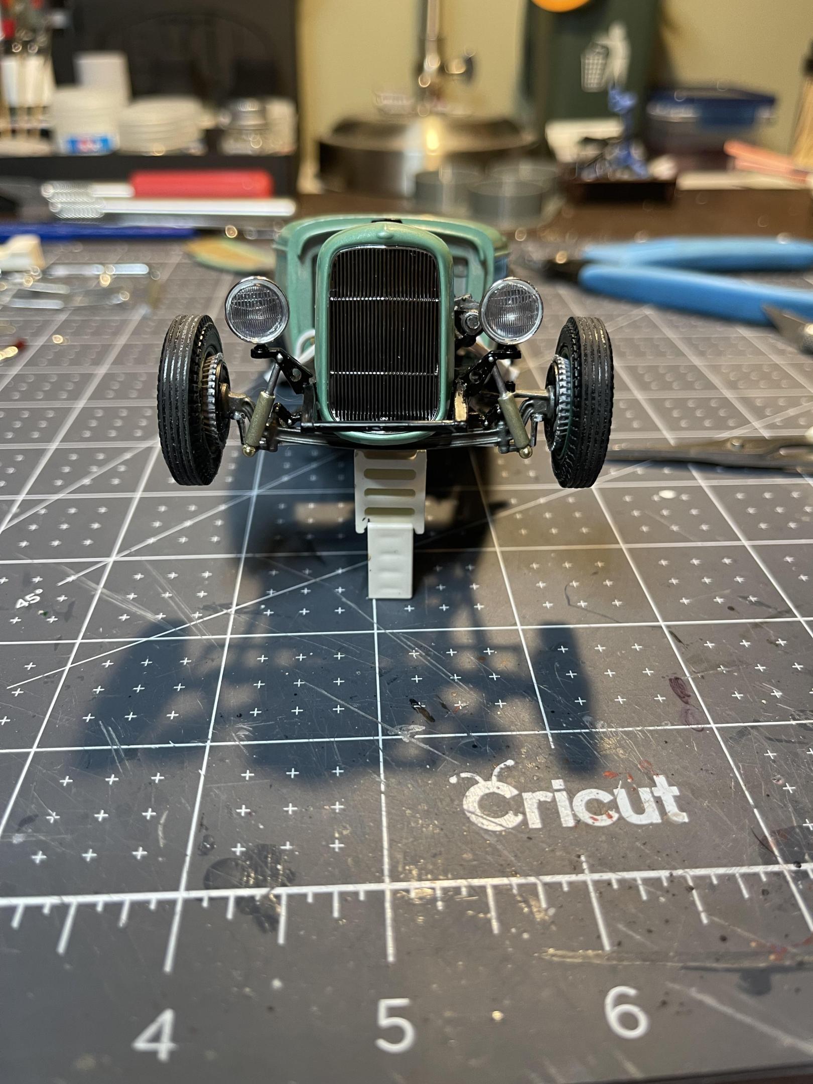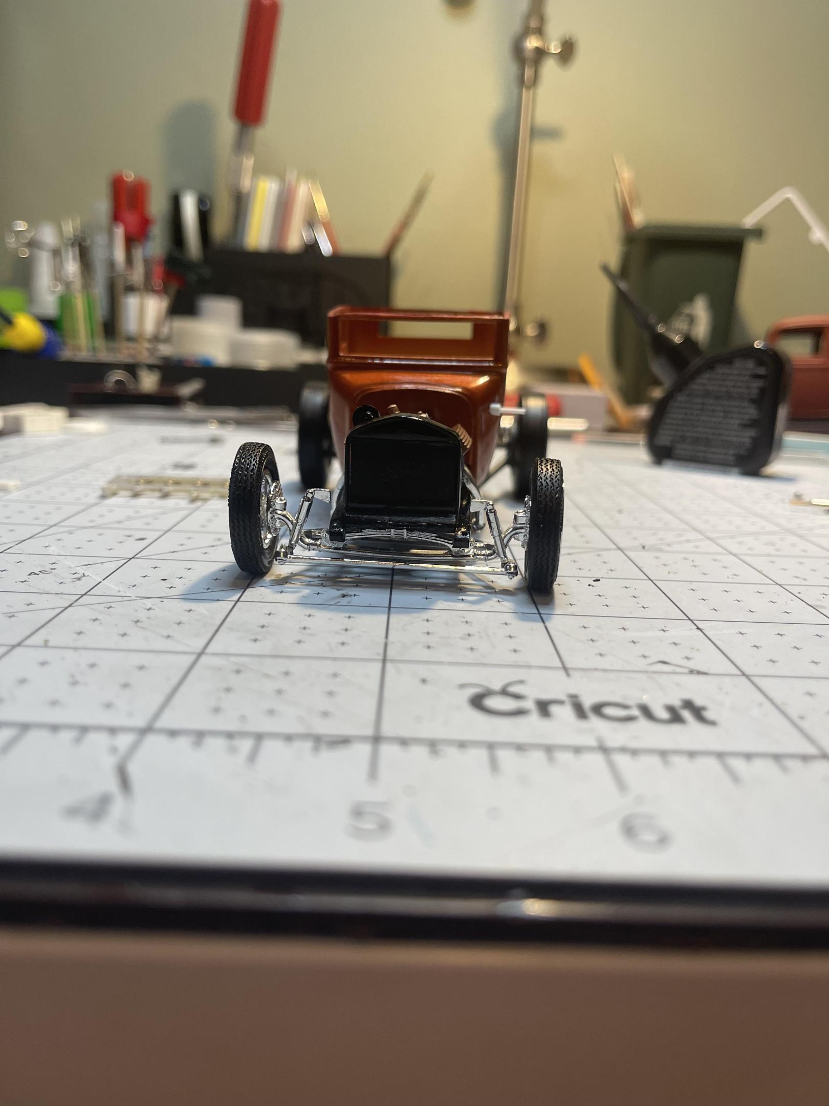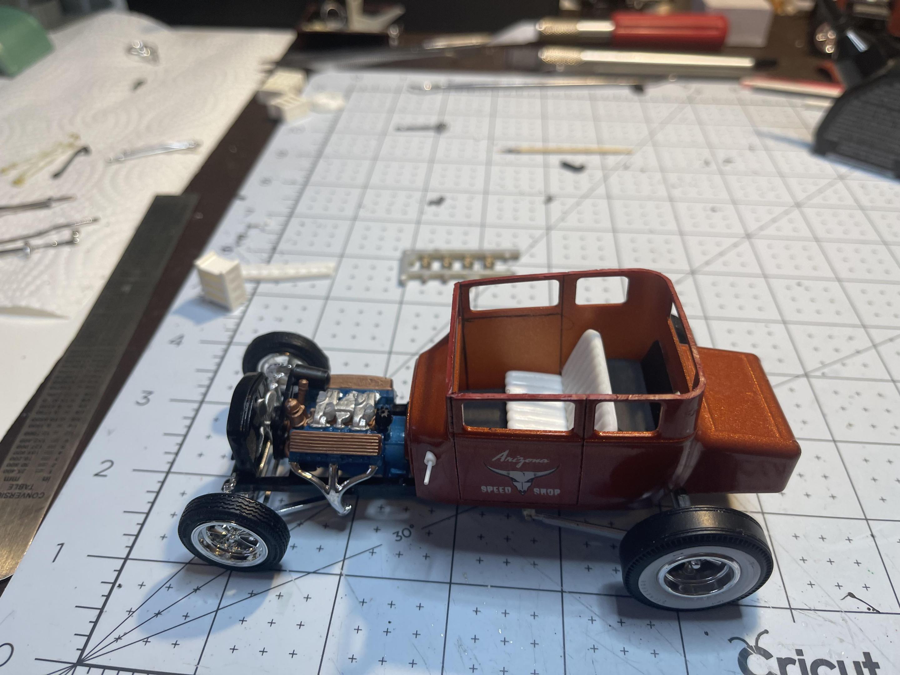 Well let’s see where we left off. Started marrying the engine to the driveline once the glue sets I can then get the front suspension mounted then the body and interior. Well you know like I was following instructions haha. Still a little parts box searching for some suitable head and tail lights. If all goes to plane this will slide off the project bench tomorrow l, then the deuce roadster will move to finish as well. There is another project that has been started and is waiting in the wings for its turn for some more attention.