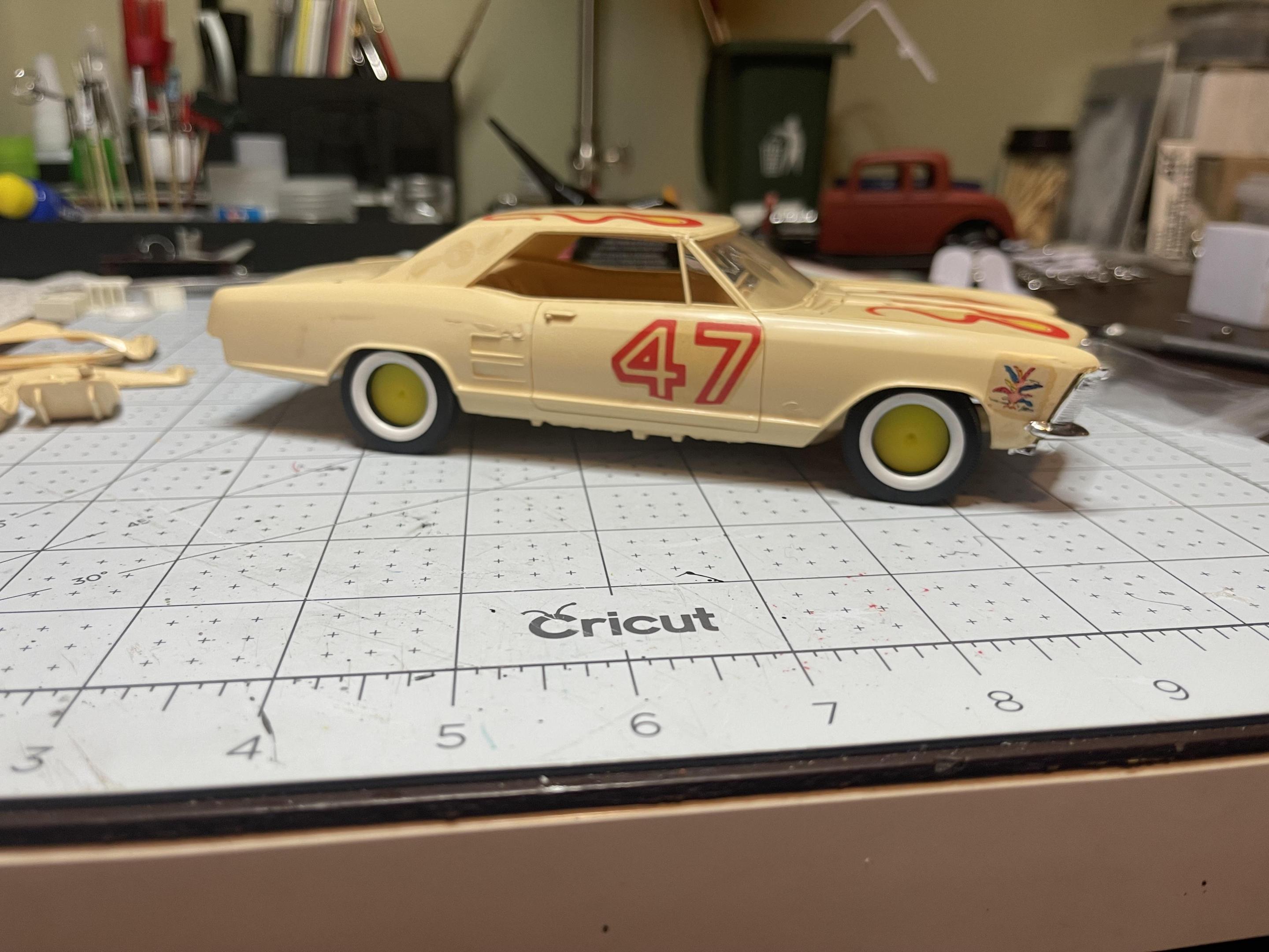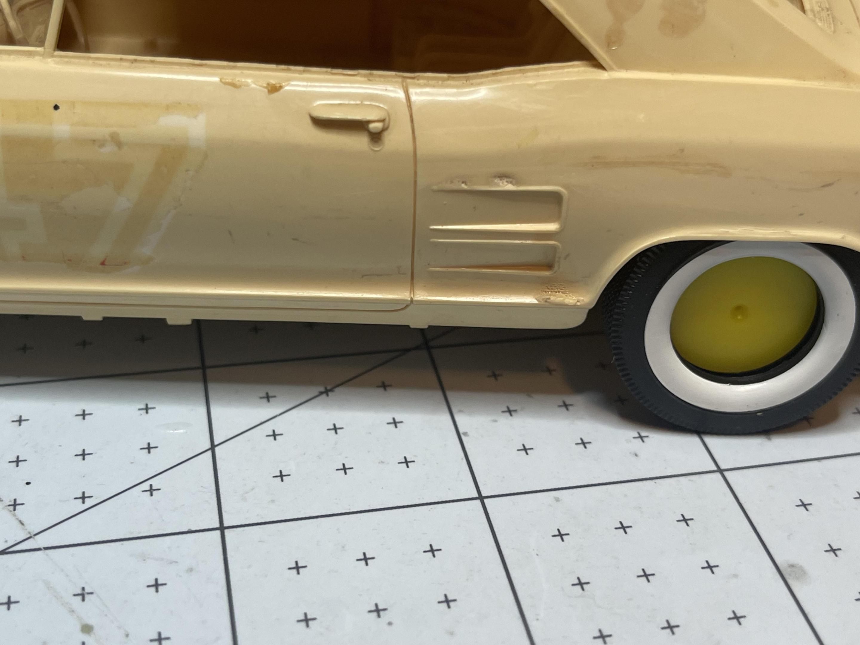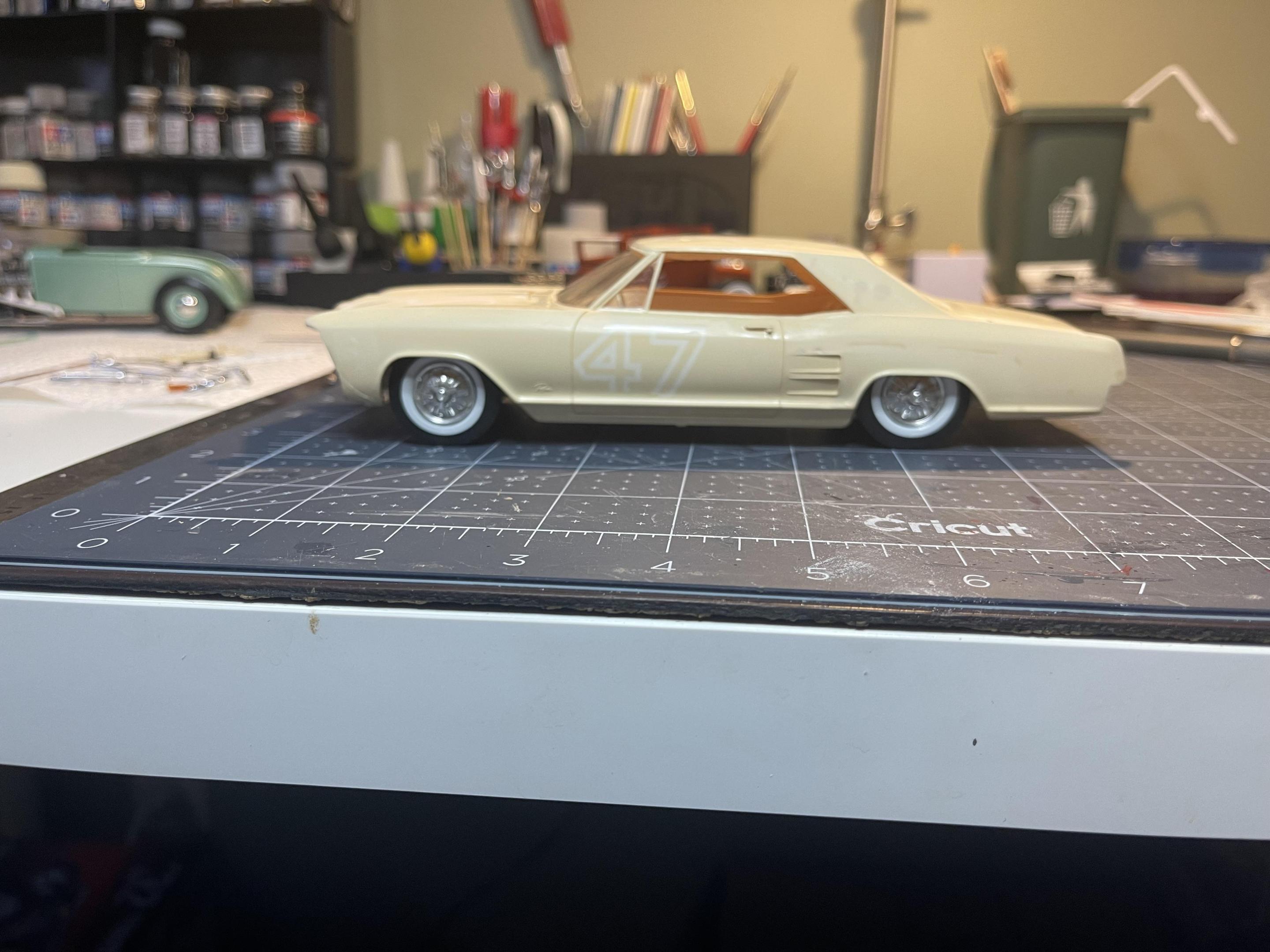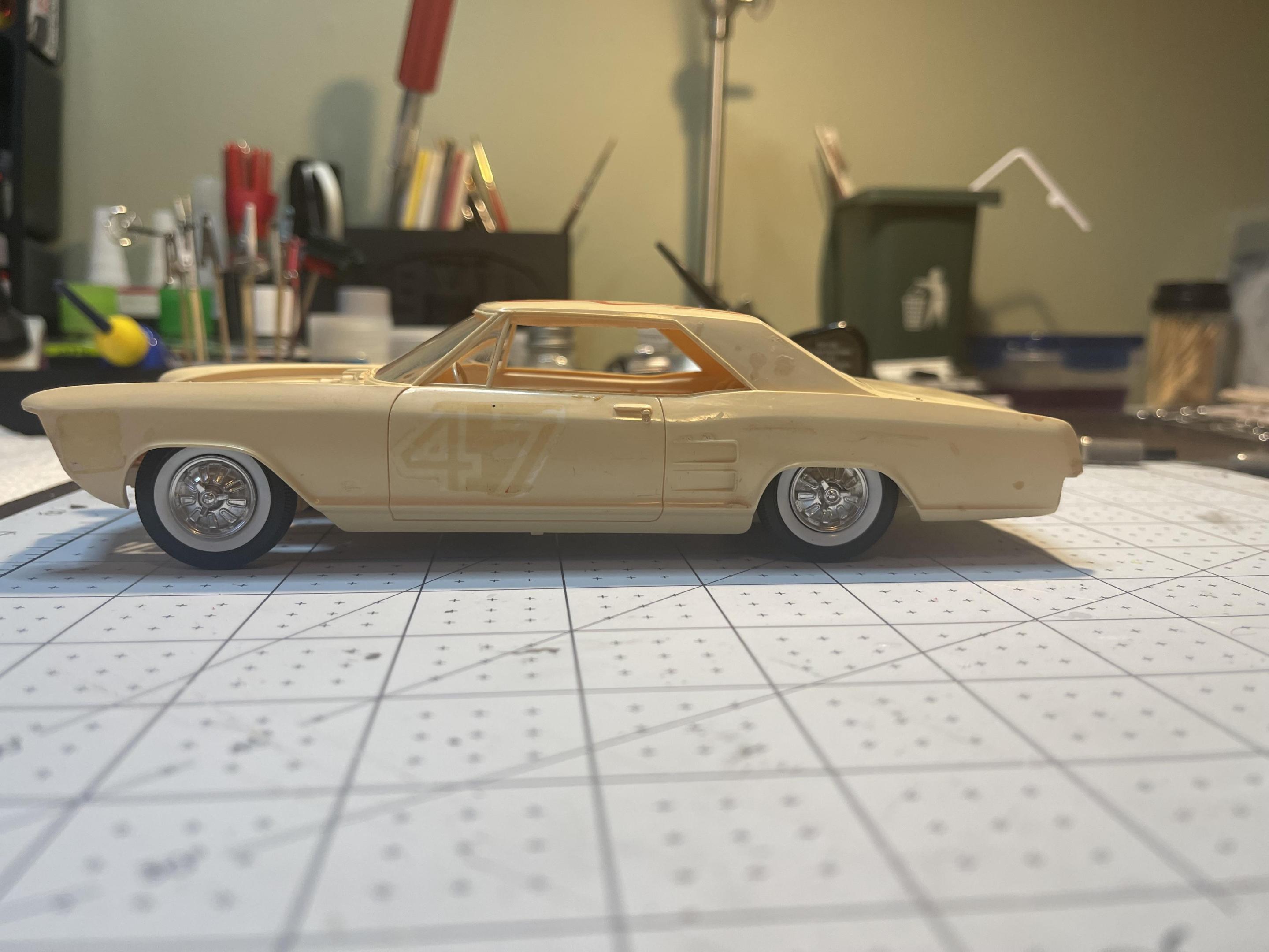 Well I’ve been watching these face book auctions for a while and every now and then I bid and win some old plastic. Well two weeks ago I bid on a fairly decent rivvy. It’s rough needs some love and a lot of parts but the base kit of body, interior and chassis is there. Now this will not be a restoration but a mild custom combining some styles from the 63 and 65. I have wanted to do this for a very long time and I may attempt a slight homage to the Silver arrow concept car. But first it will need some body work to cover the sins of the original builder, glue marks decals and a broken A pillar. I’ll need to find a donor for some of the items I want for my vision of this car. so far I’ve added some parts box hubcaps and white walls to try to capture the vision in my head to plastic on my bench. I’ll update this hopefully soon as I am off work til the middle of January now so I’ll have a fair bit of bench time.