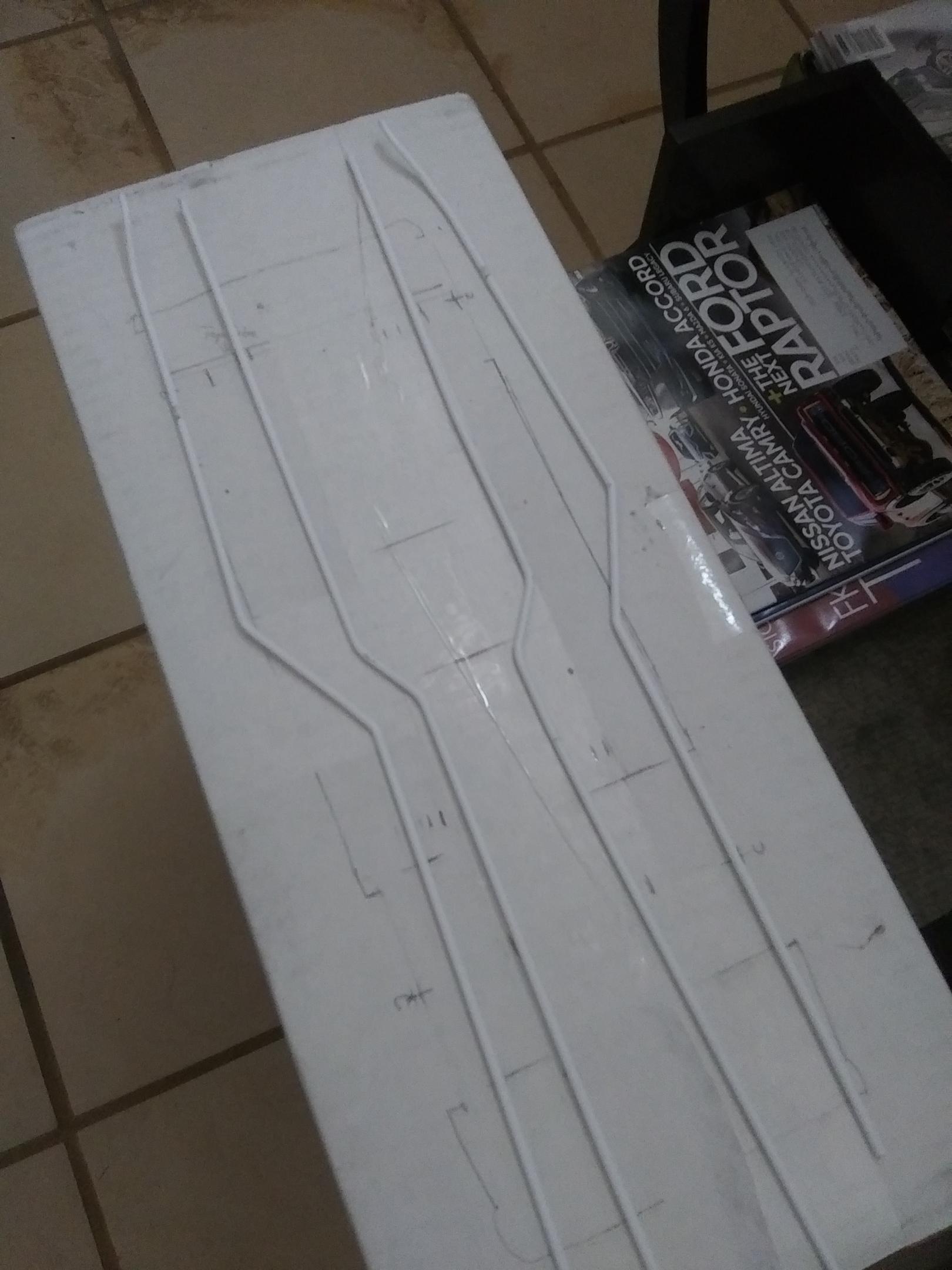 Sorry it took so long to get back & post more. To make my space frame chassis I started by taping (using scotch tape) two rods together, then made my bends for the back half of the top rails, after making my bends removed the tape & flipped one rod over, now I had my two top rails. -