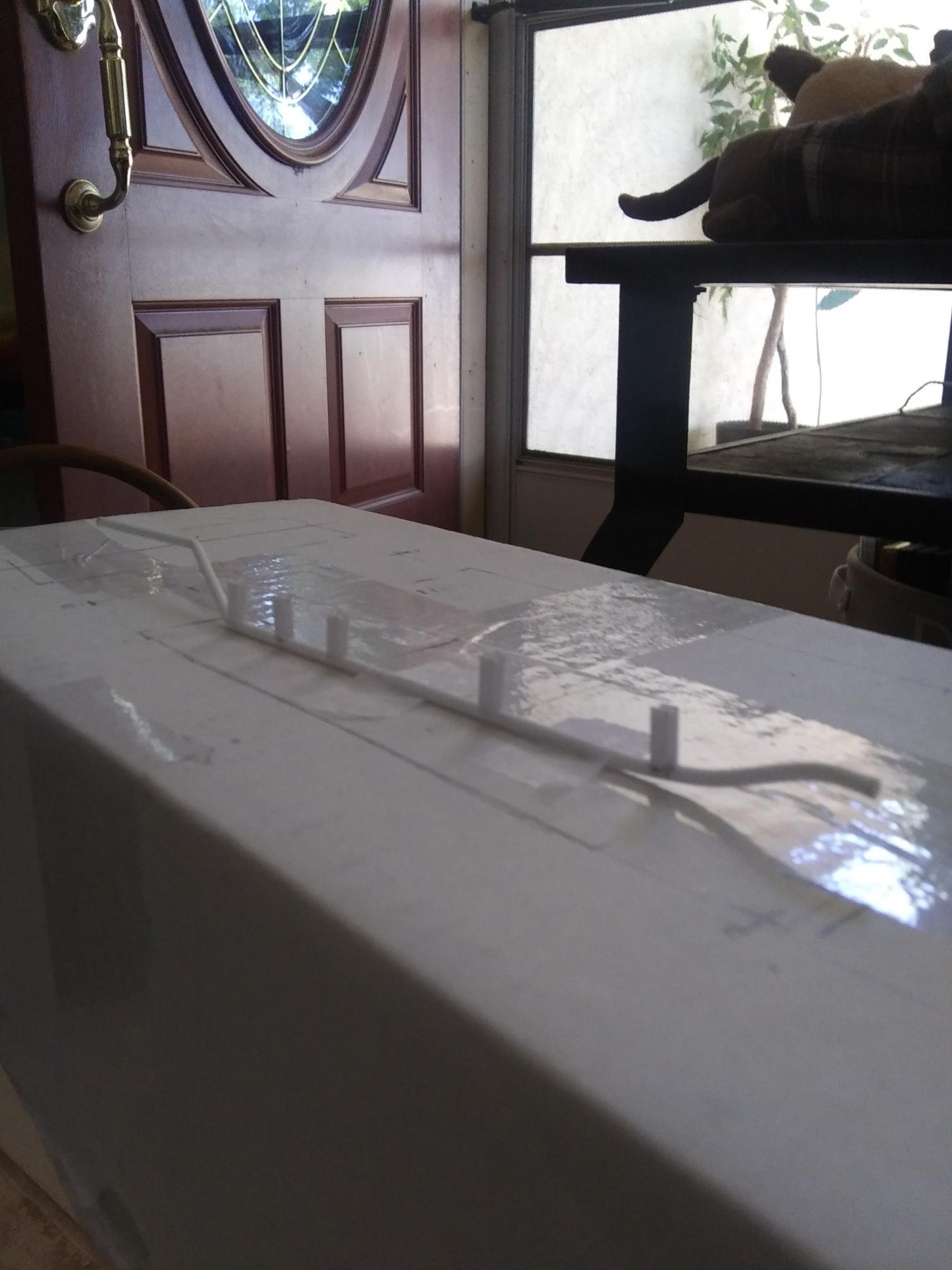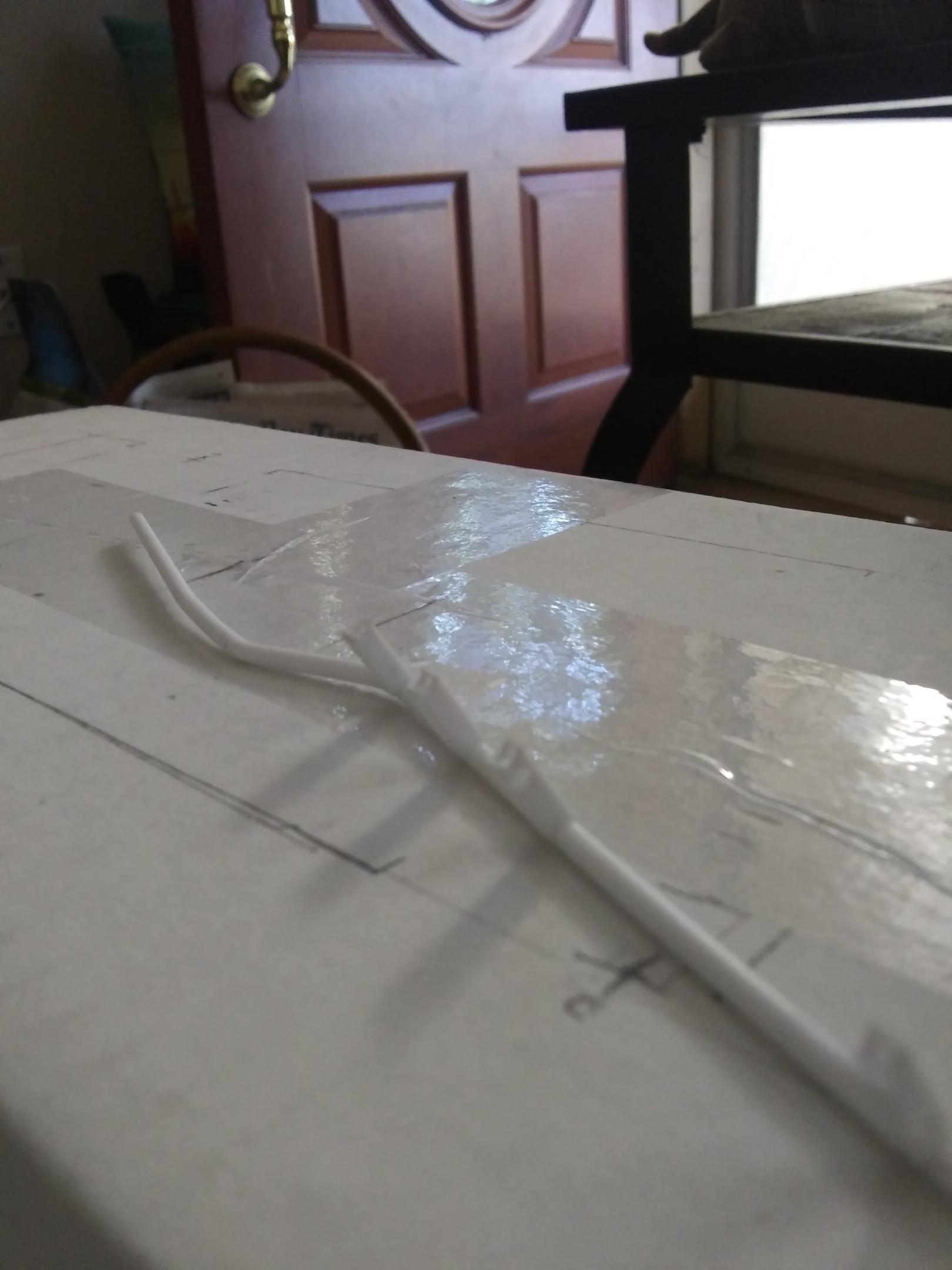 When I decided to try & build this, I wanted to try & make the chassis as accurate as possible, which meant to me making that "S" bend in the front on the bottom rails, not like the Polar Lights Funny Car chassis. To do this I once again taped two rods together, and made the first bend back a little on the rod, then did the 2nd bend leading into the rods going straight, I then trimmed the front back to leave the length I wanted. After that I made the bends in the rear individually, any adjustments to the rear bends would be made after attaching the top & bottom rails together. -