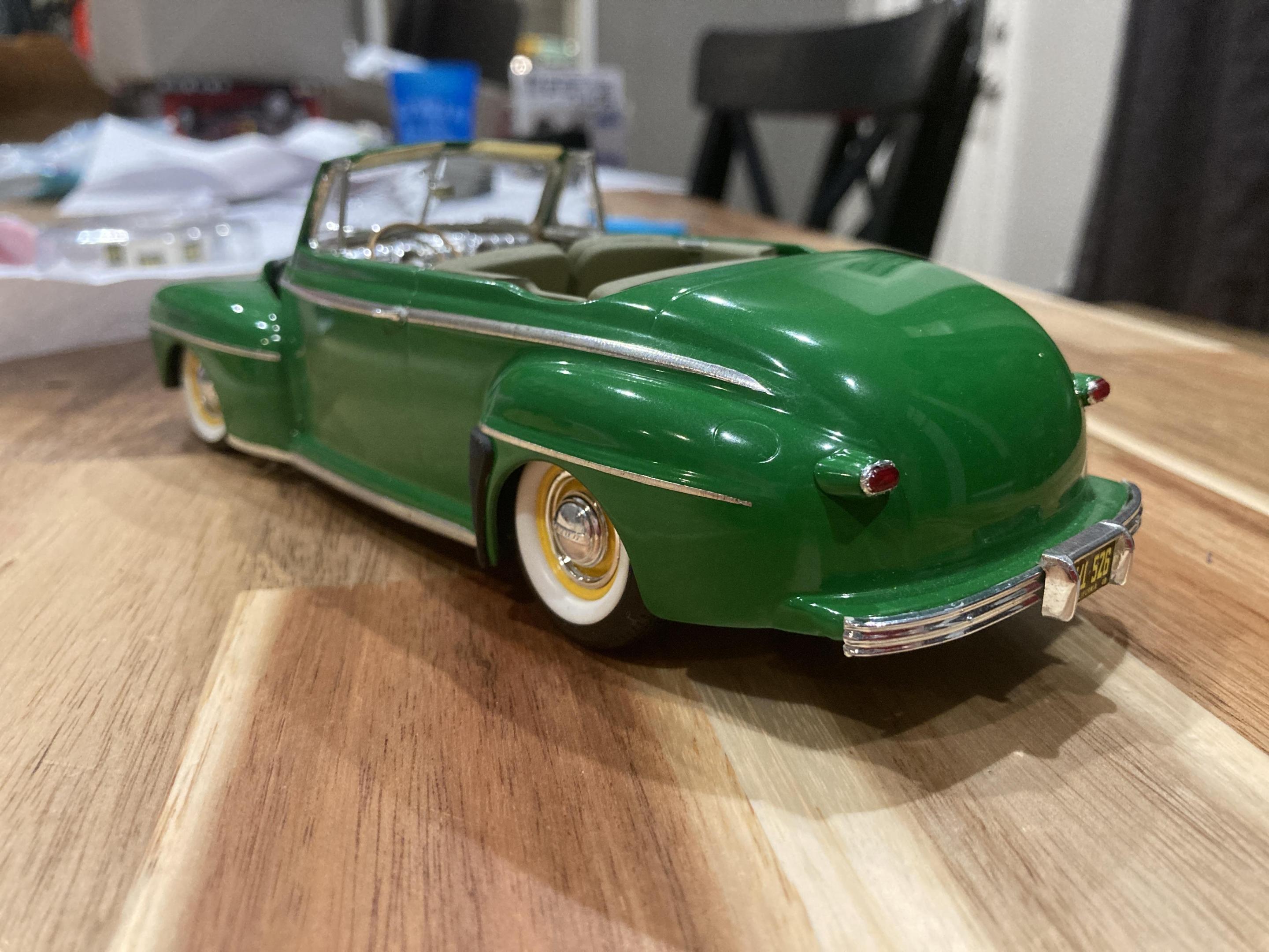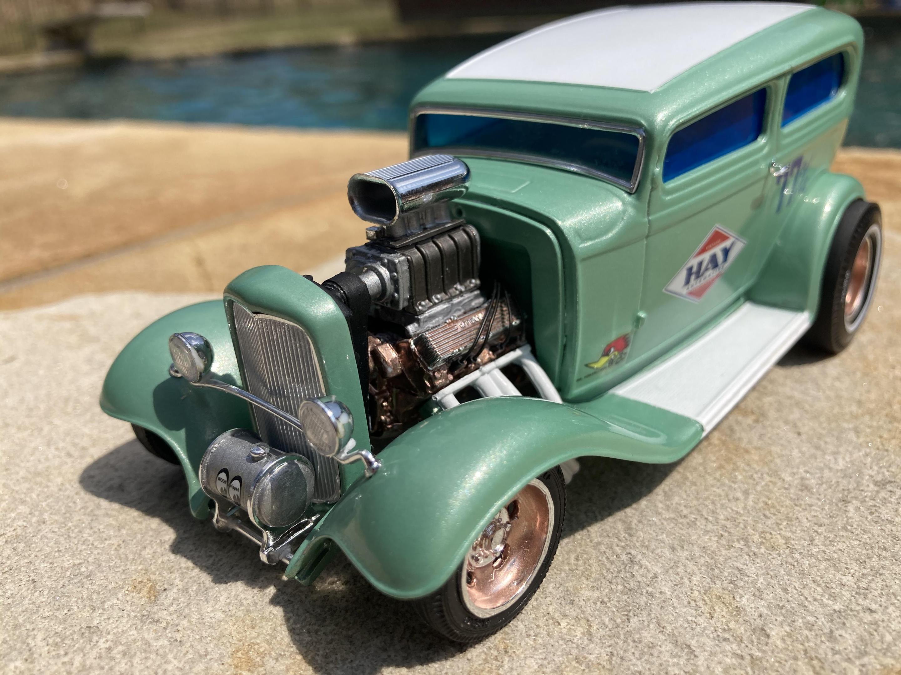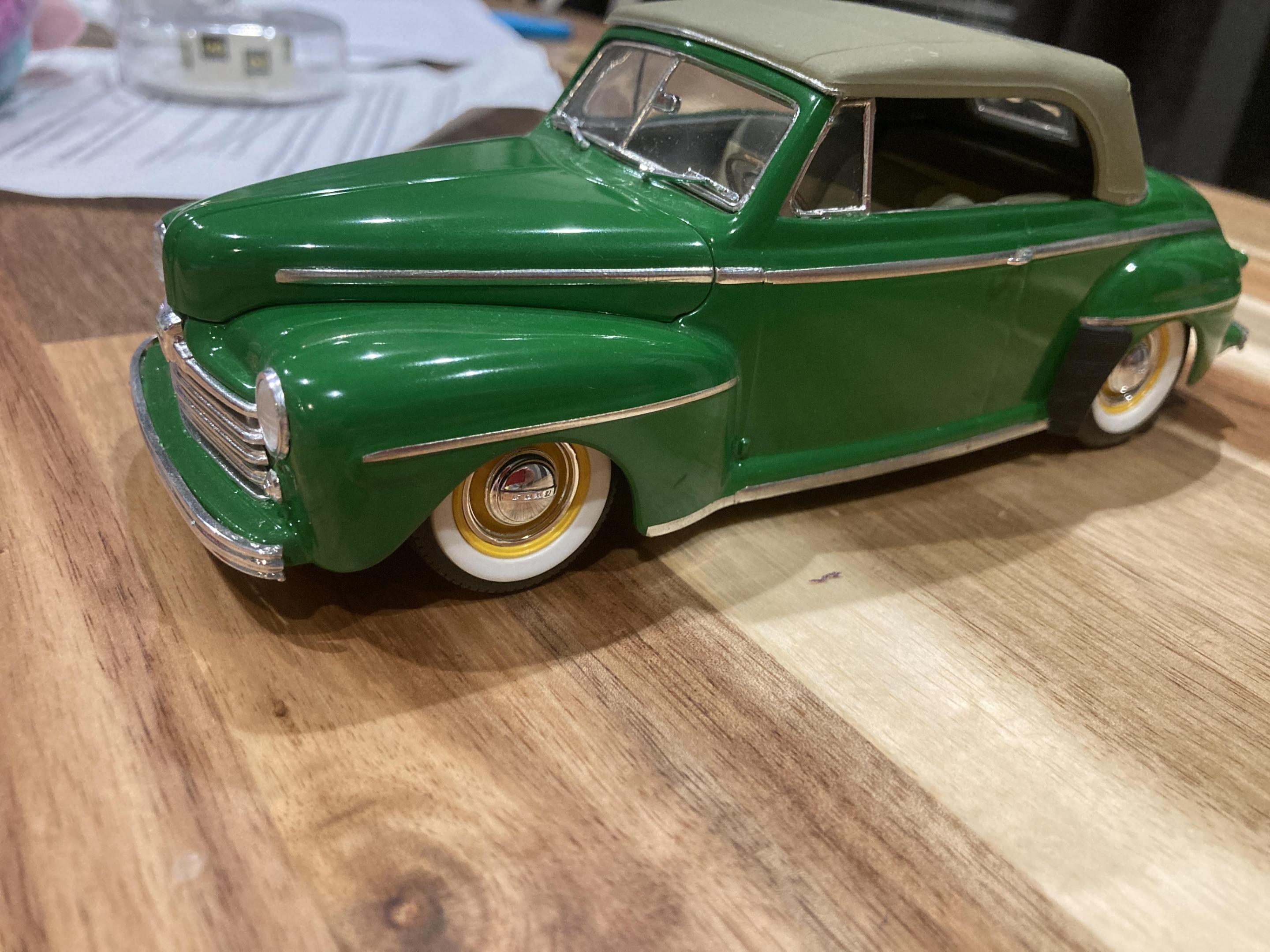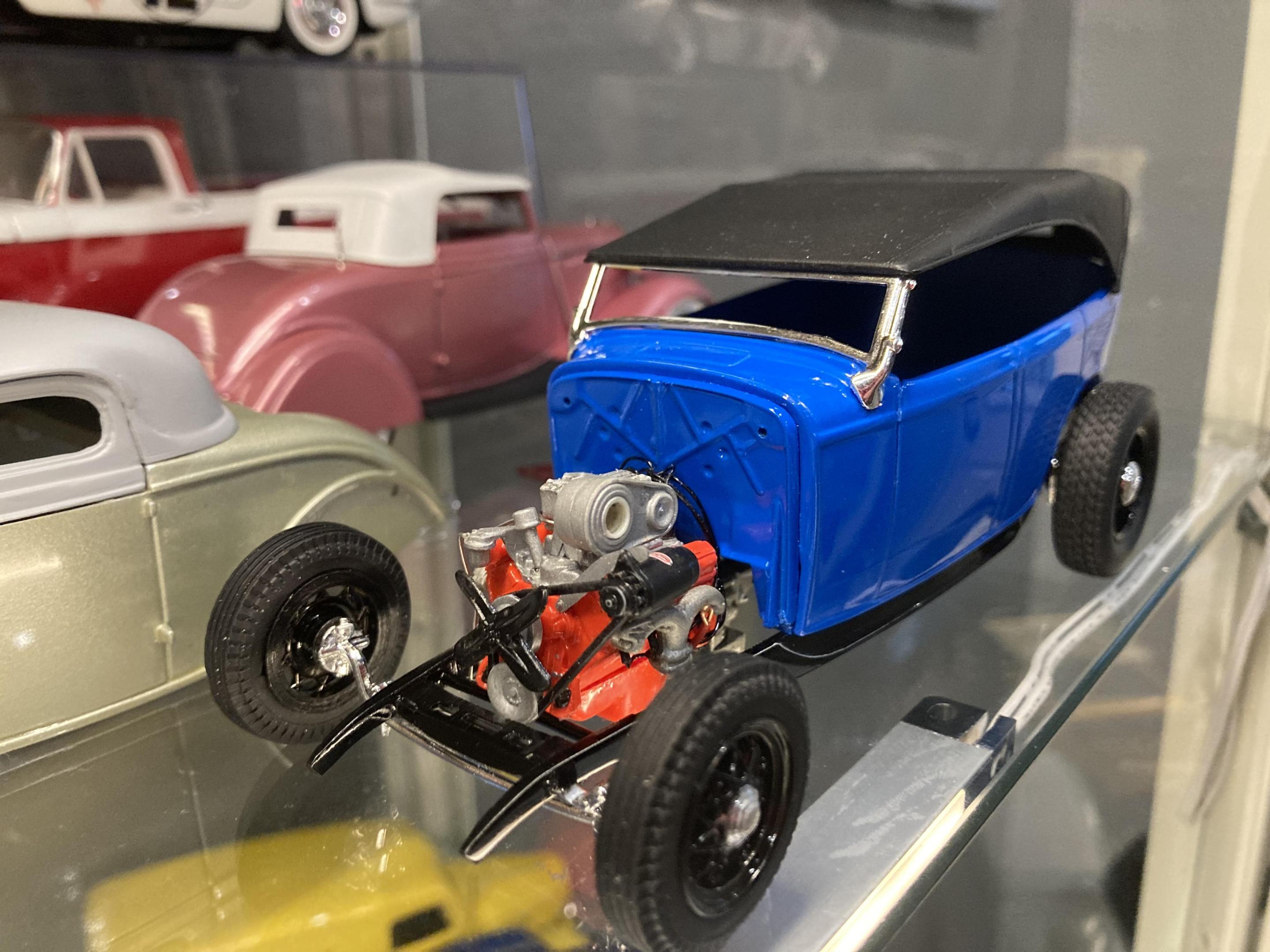Really cool Tim. I’ve only built the convertible and woody, and only the convertible has survived. I have the custom chopped coupe kit but I’ve already robbed the tires out of it so I need to stop doing that and build it. You mentioned others saying the chop was funky, and I concur, probably why I haven’t built it yet but your builds look great so I should just dive in. I painted this vert Testors green from an airbrush, Corvette FI small block, I used 1/24 32 Ford bumpers to replicate those 3 rib “Briz” bumpers that were so popular 20 years ago.