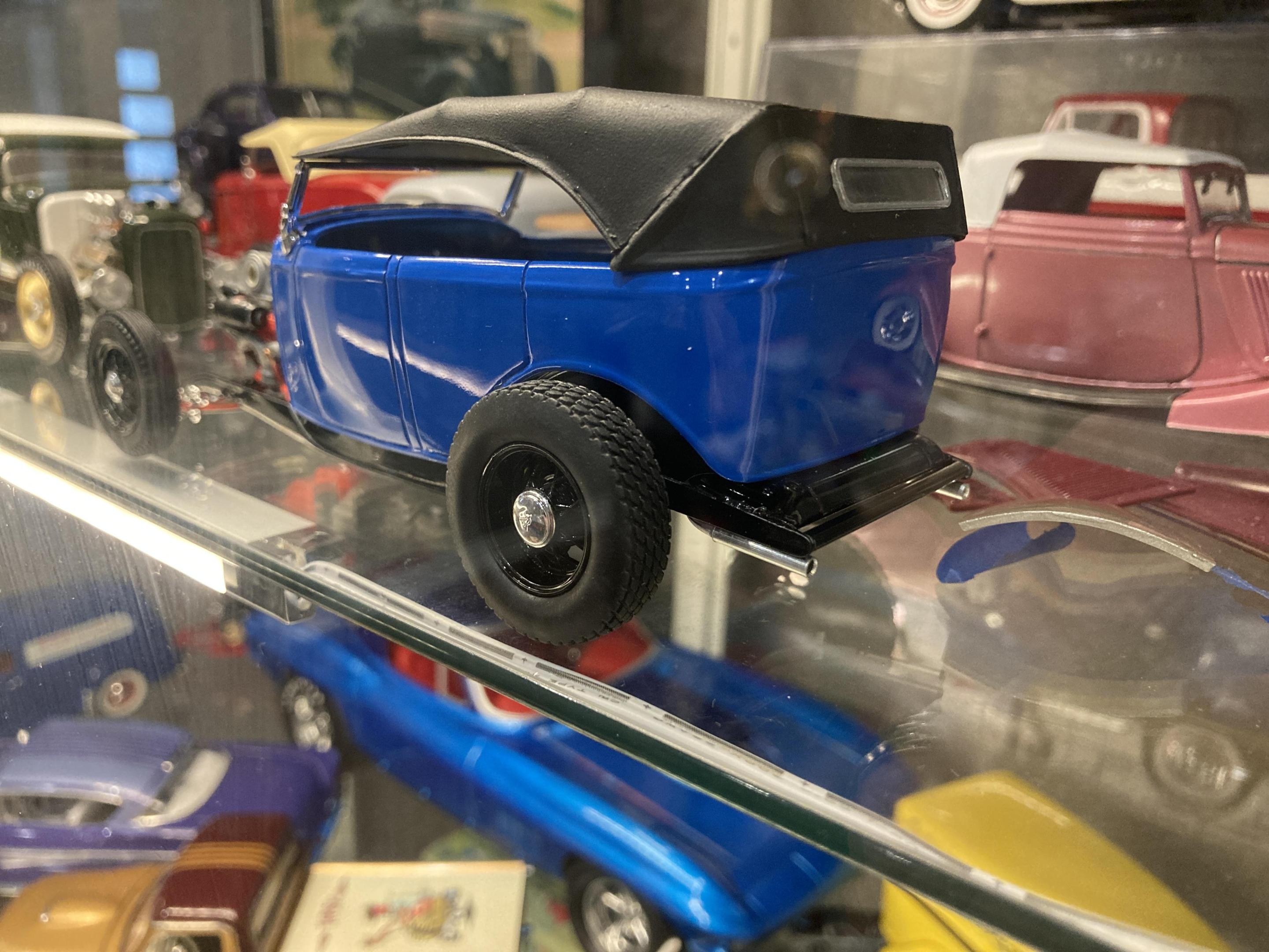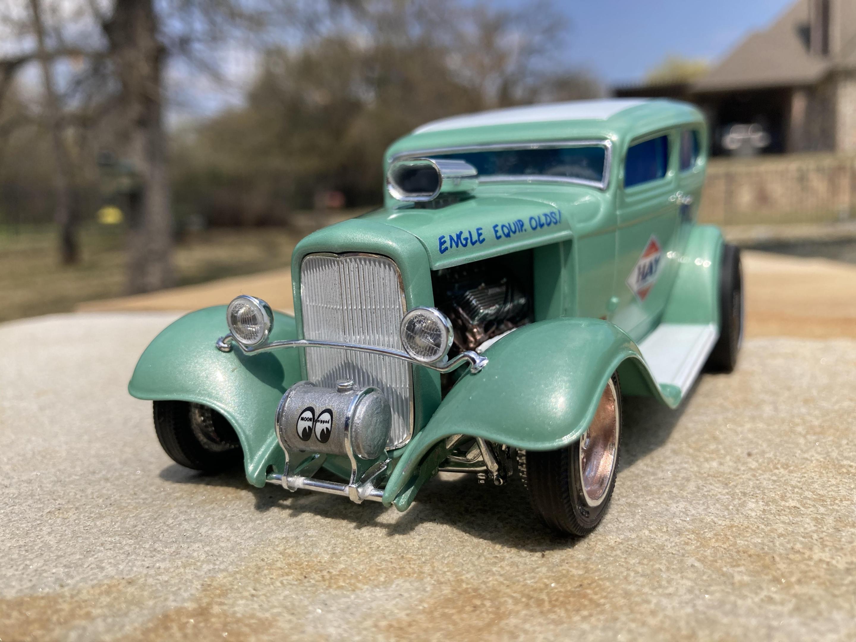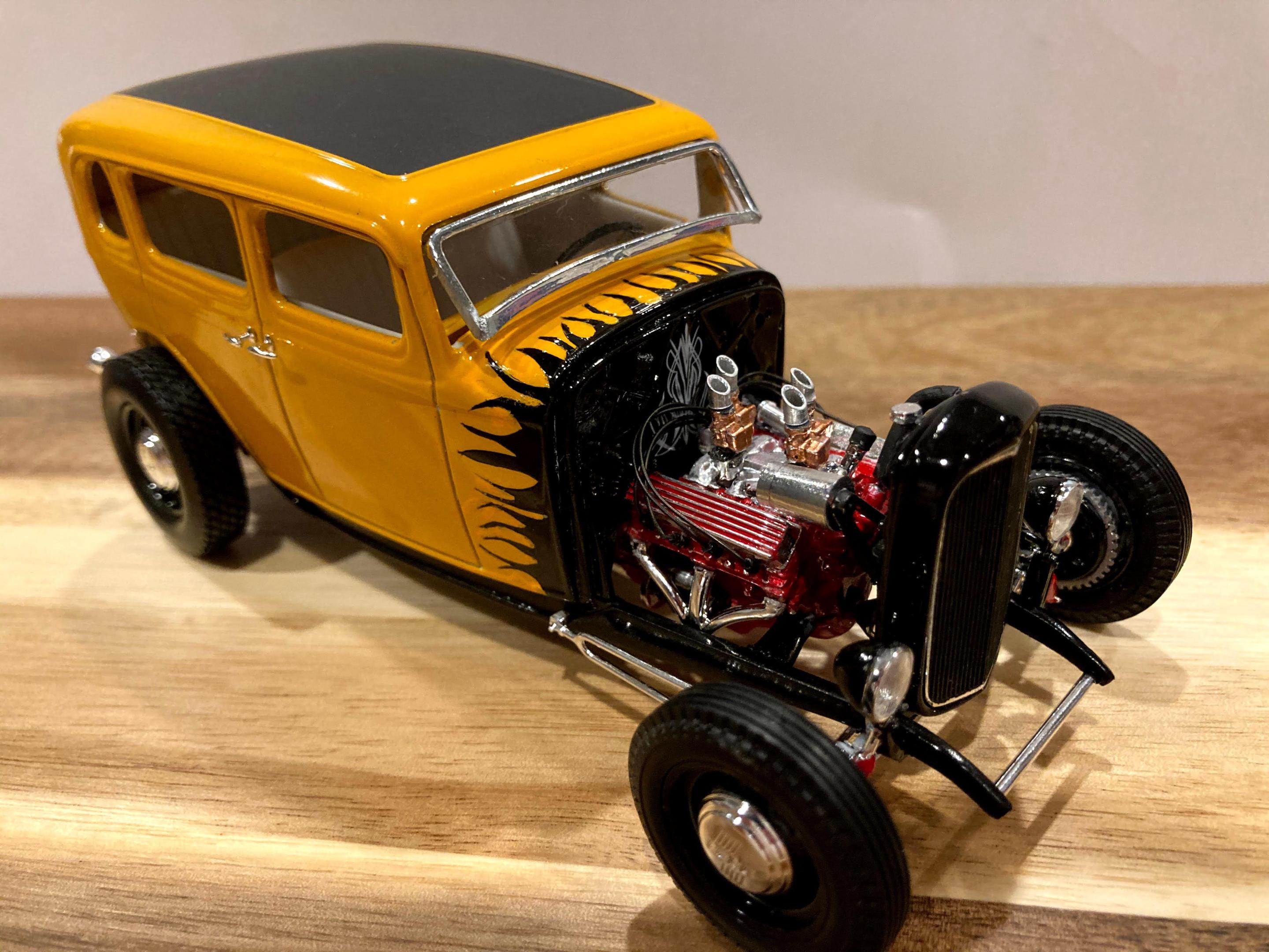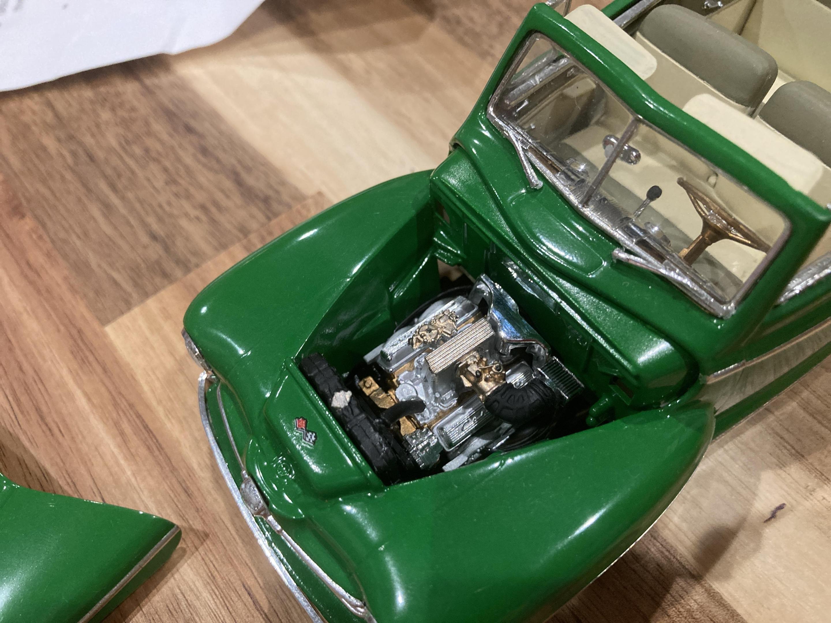 Really cool Tim. I’ve only built the convertible and woody, and only the convertible has survived. I have the custom chopped coupe kit but I’ve already robbed the tires out of it so I need to stop doing that and build it. You mentioned others saying the chop was funky, and I concur, probably why I haven’t built it yet but your builds look great so I should just dive in. I painted this vert Testors green from an airbrush, Corvette FI small block, I used 1/24 32 Ford bumpers to replicate those 3 rib “Briz” bumpers that were so popular 20 years ago.