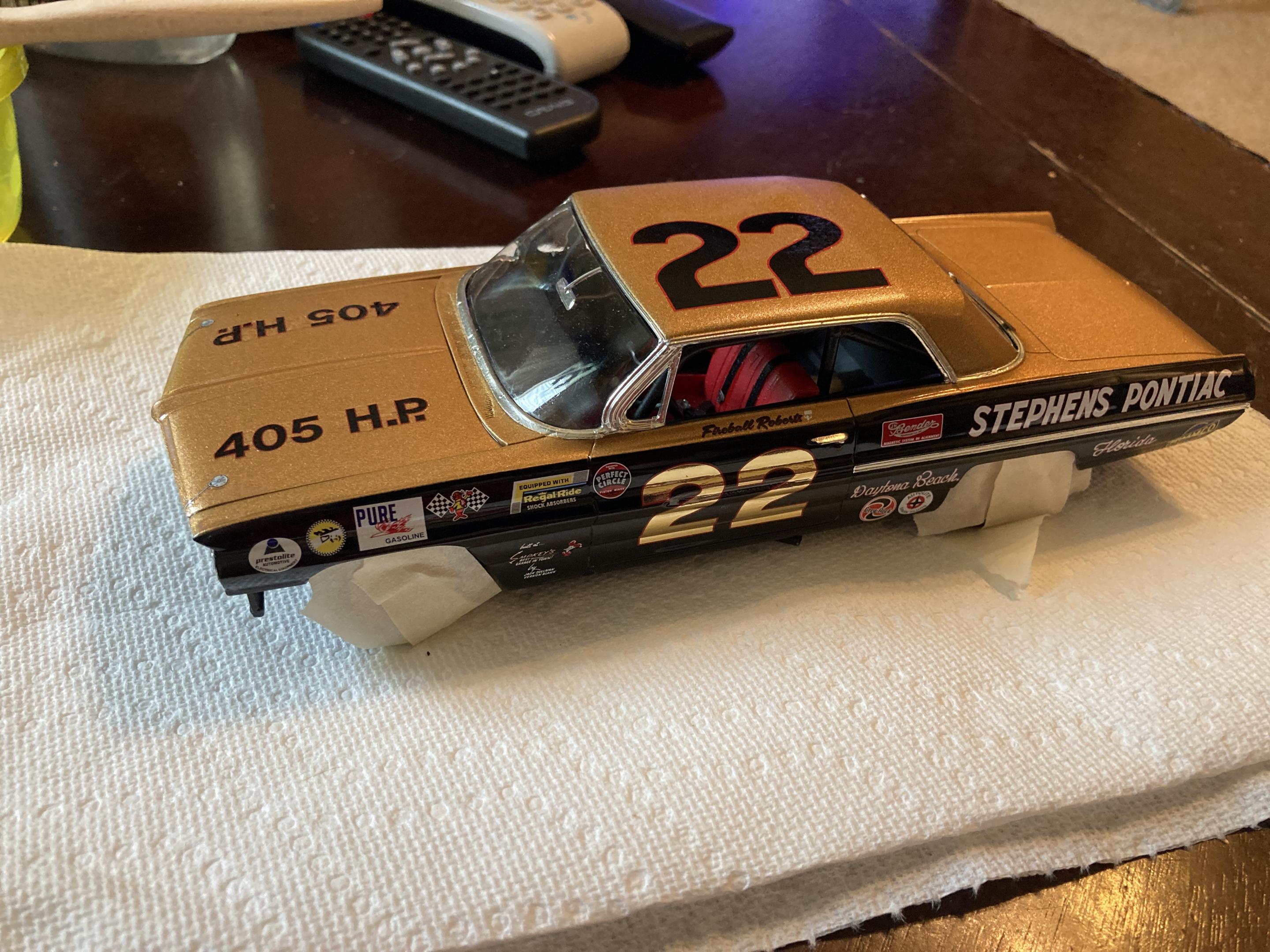 I bought a decently built AMT 62 Pontiac on eBay that was built to the Fireball Roberts/Smokey Yunick livery. It had decal and paint issues, but was a nice build beyond that. I paid way too much for it, but thought I could fix what was wrong and have a nice piece for the shelf. Here are the pics from when I bought it. The decals were poorly applied, peeling, and it looked like the roof came in contact with a heat source. The hood also had a weird spot on it, and was dusty from sitting.