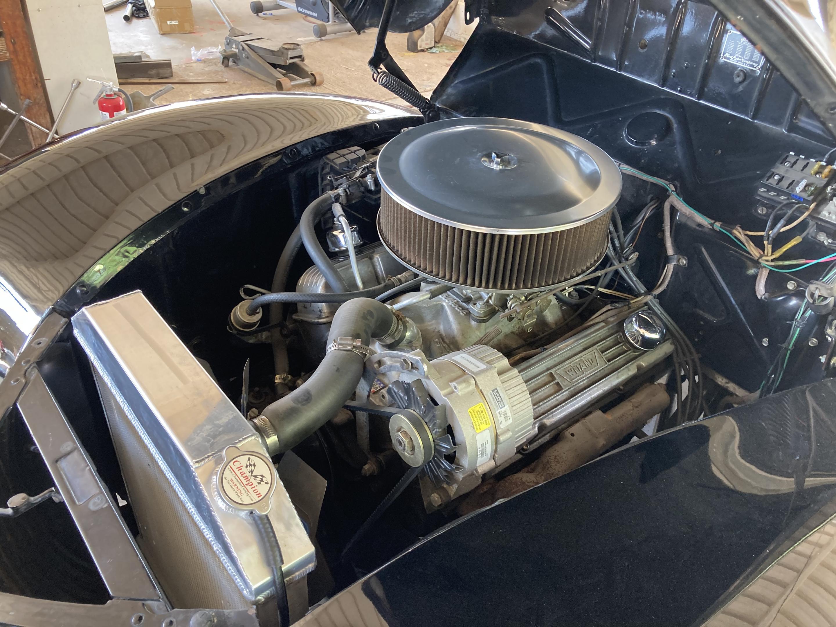 It has new Lincoln brakes on the front and stops pretty good. I might just live with the wide 5's for a while, but I'll paint the drums black or gunmetal gray. But yeah, 40-48 wheels would be a lot better. I don't know much about it. The numbers on the block say it's a mid-80's 305. It might have a slightly bigger than stock cam, a little bit of rump on the idle. It runs good, has good vacuum and good oil pressure.