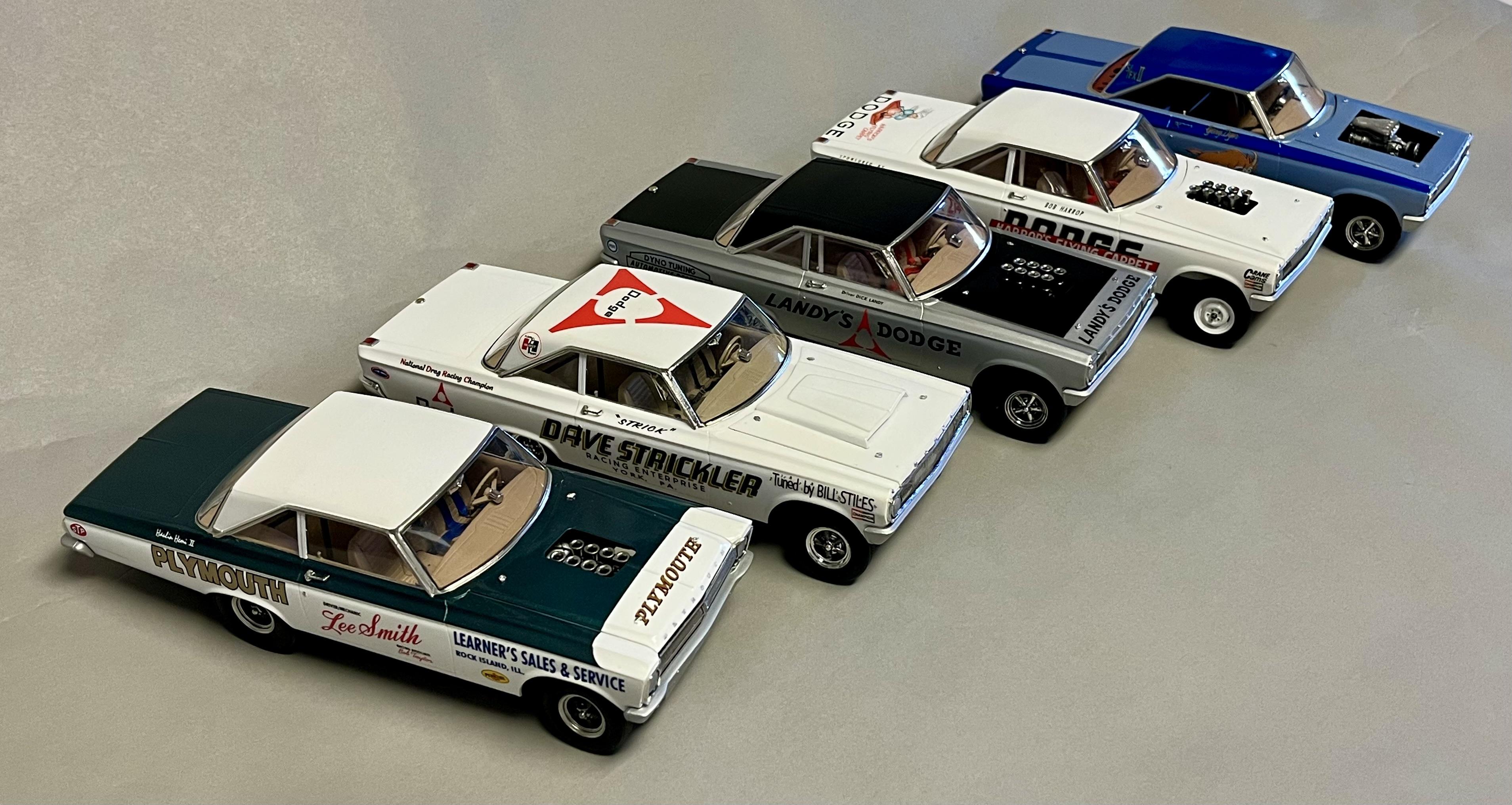 It's been ages since I posted anything here in the way of drag car builds, hoping this report on my summer project, a "Moebius AWB Mopar Assembly Line", will make up for my lack of posted builds. I'll never catch up with Mike "Building the Covers" Elky (who will!?!) but this five kit build is new personal record for me. This assembly line consisted of the last AWB '65 Plymouth that was in my stash and four of the new AWB '65 Dodges. As always for me, decal availability drove my picks. Here's my latest AWB fleet: Here are some picks of the '65 AWB Plymouth A/FX Lee Smith car below, I'll post the others on separate postings. Decals were from Fremont Racing Specialties (thank you Joe Curtis!), I airbrushed ScaleFinishes Plymouth Dark Turquoise Metallic base lacquer over Tamiya Pure White lacquer, it's more green than turquoise but I like the color with these decals. Some Detail Master parts and wiring/ fuel lines and Gopher racing harnesses were added, otherwise OOB.