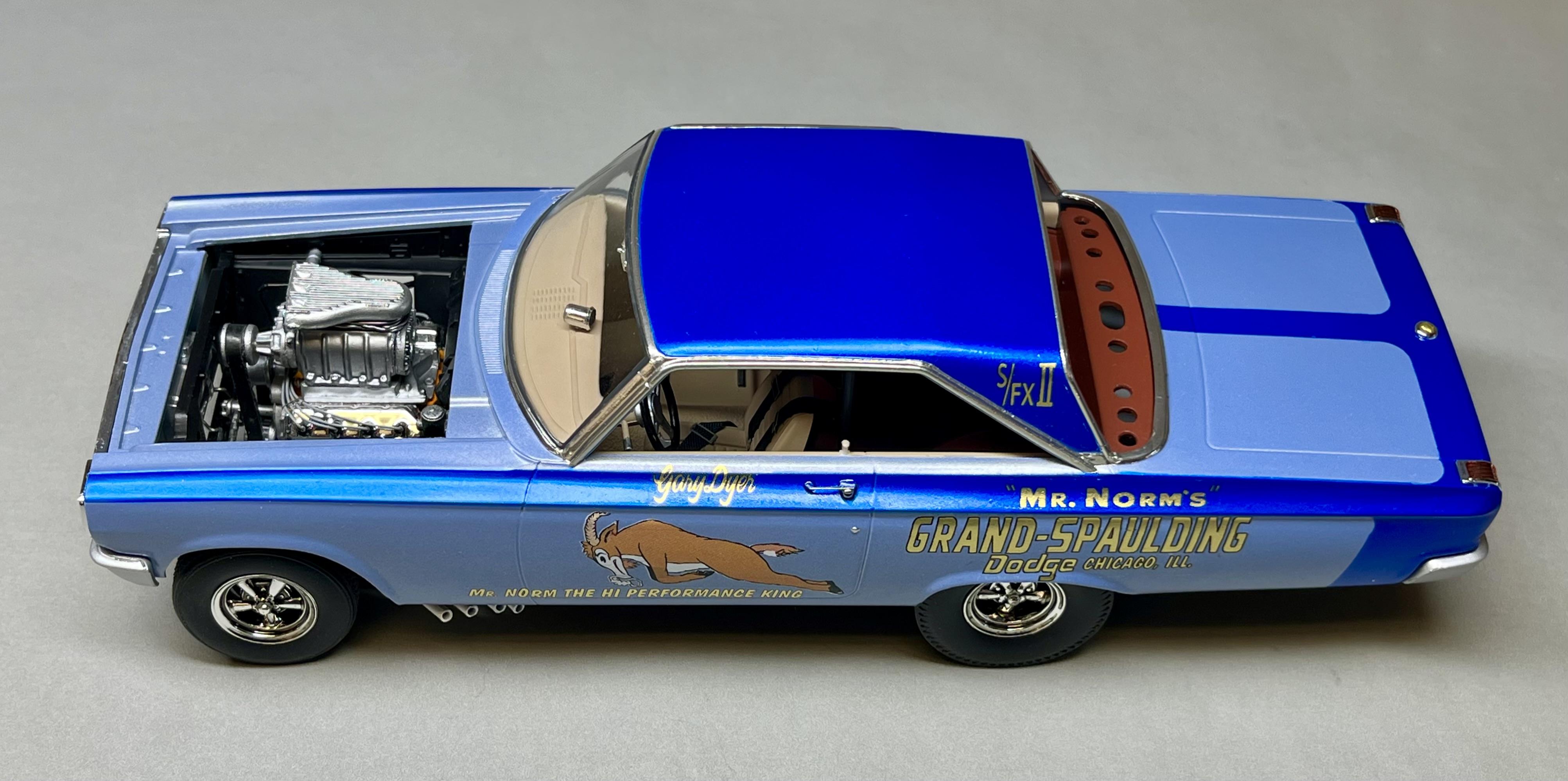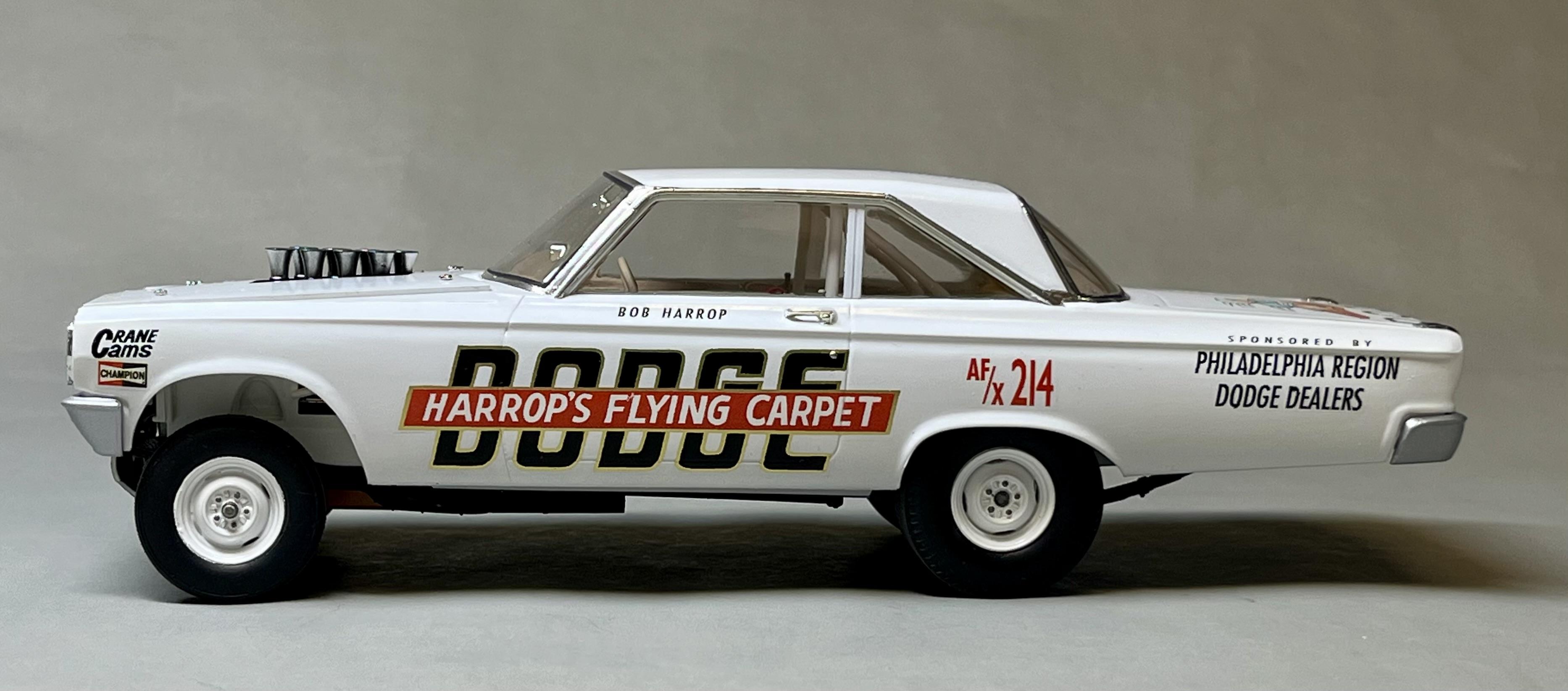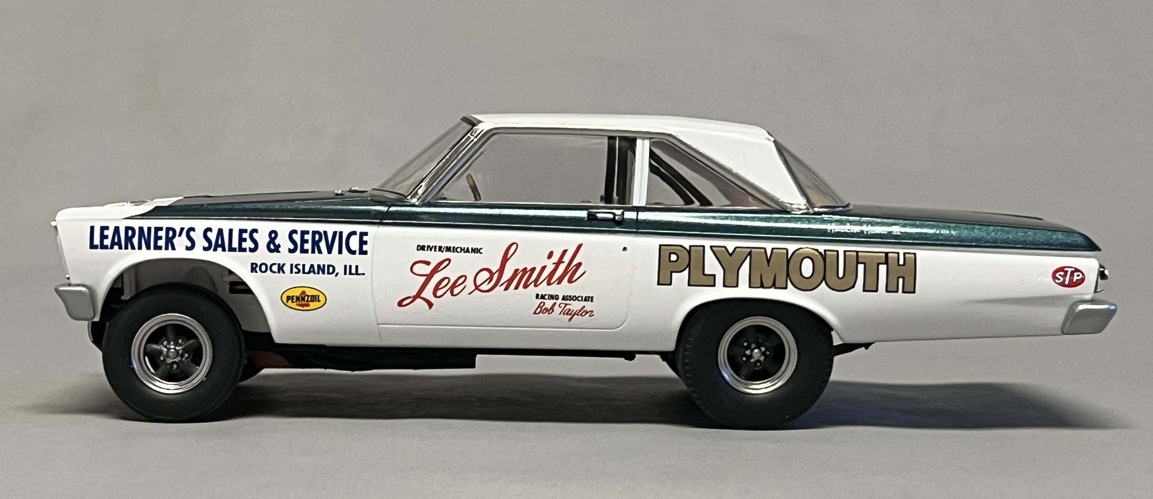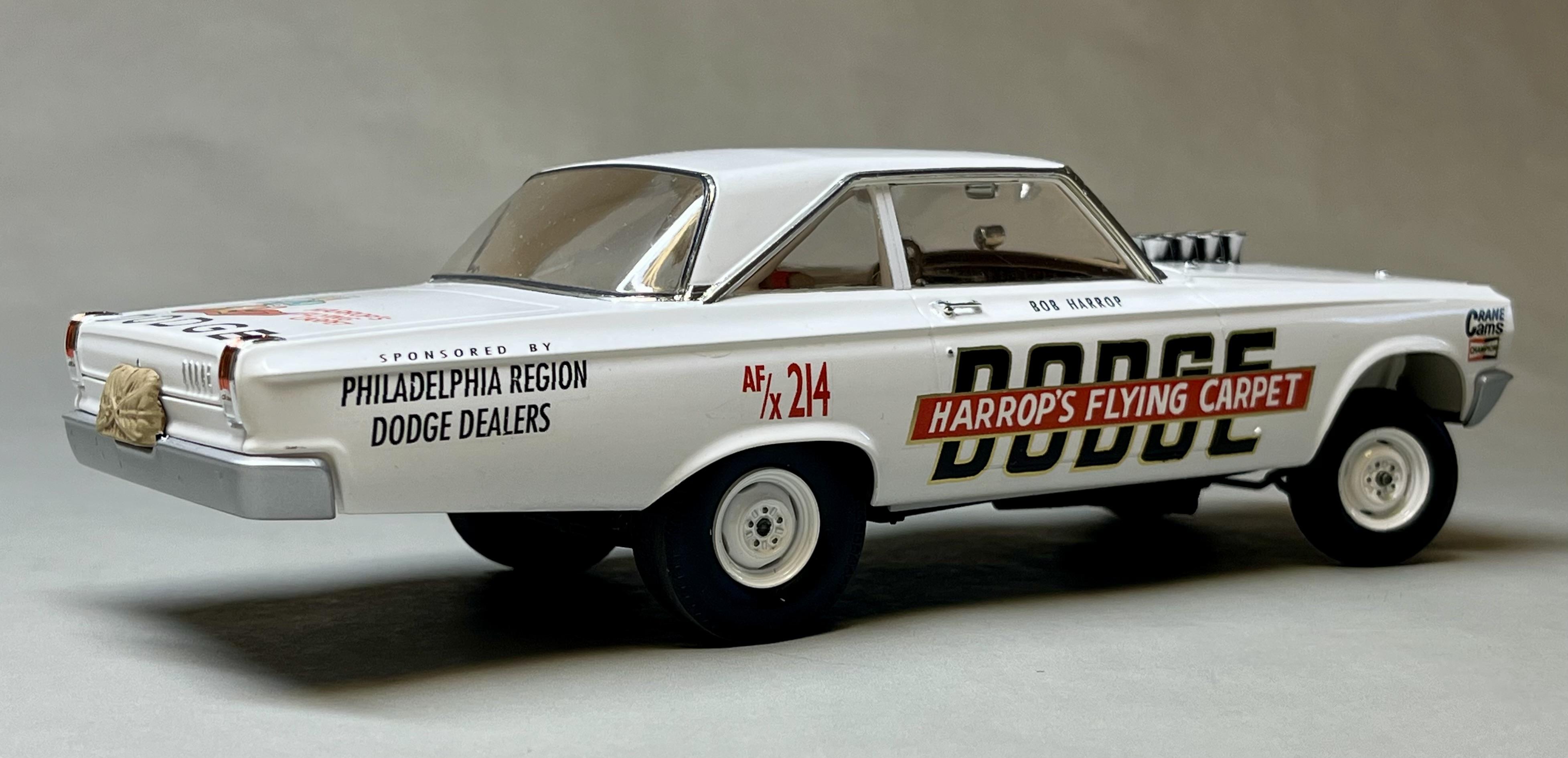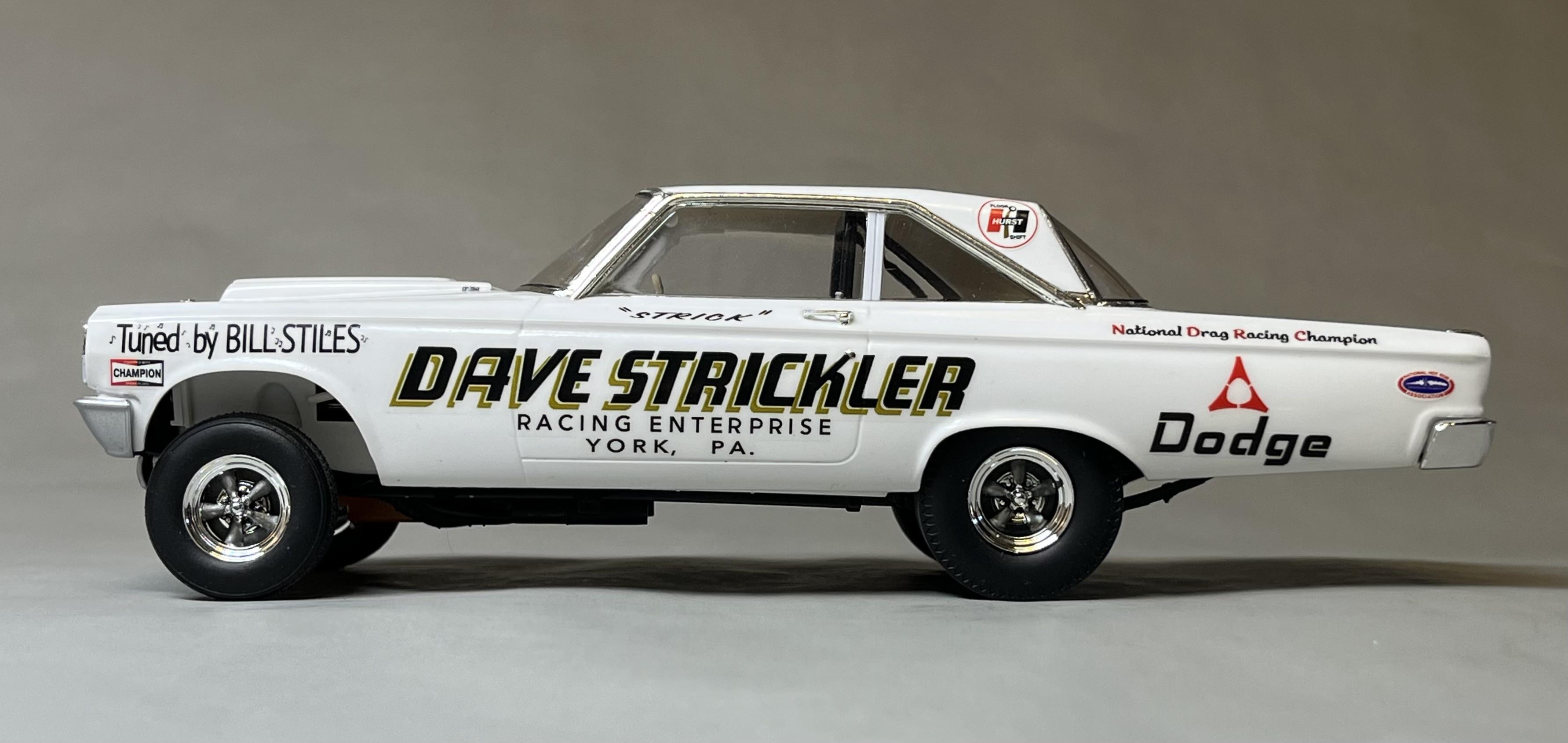 More big decals Mike and you did a great job on this one too! Those long ones along the middle of each side profile must have been a challenge. At this rate you're going to have a 1/25 reproduction of every one of the '65 AWB Mopars.... impressive! Once you've completed everyone on your list, please line 'em all up and post a group pic of them. I would love to browse through your SS magazine collection, it would make for some fun mid-60's drag racing reminiscing! -