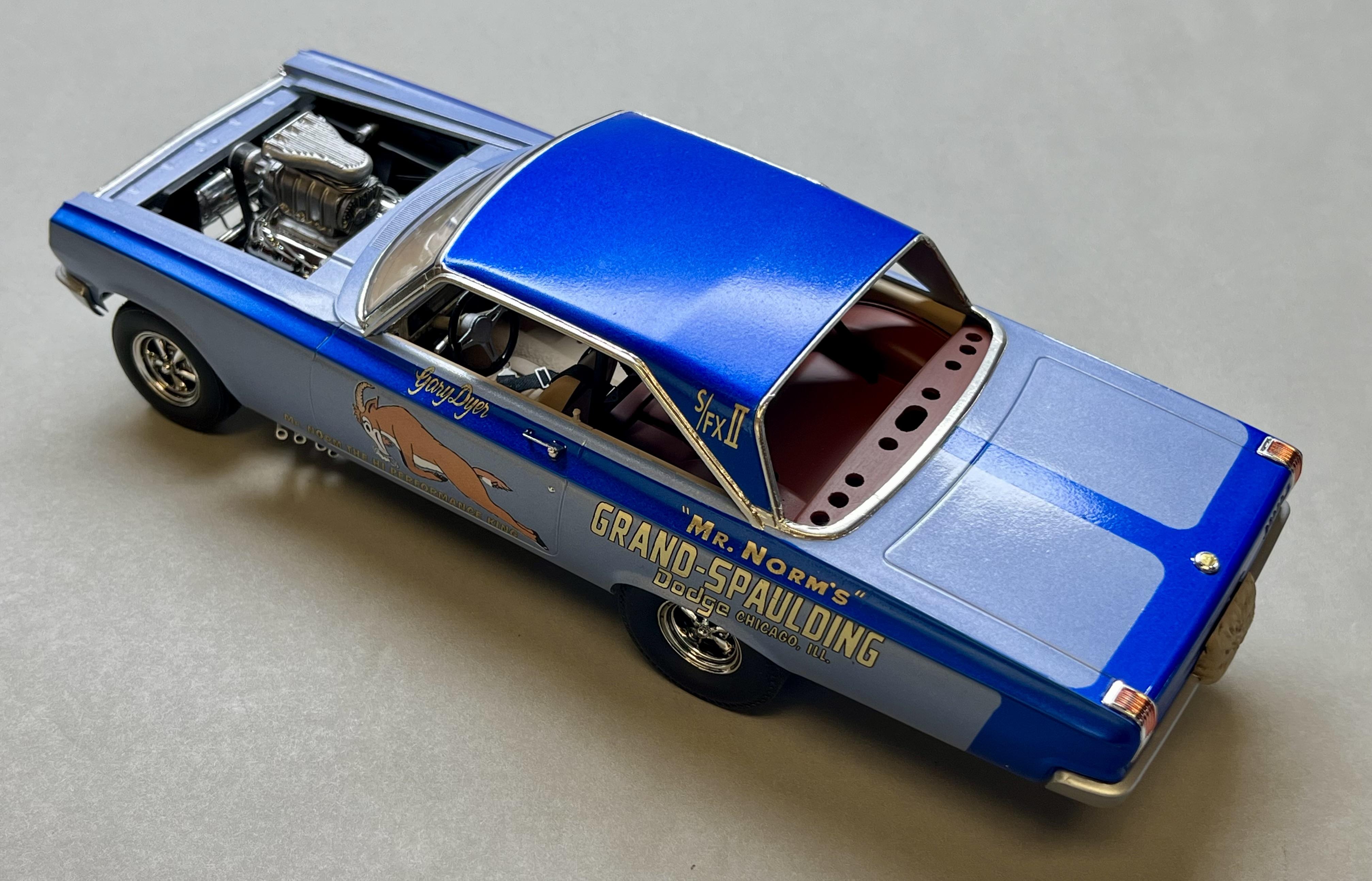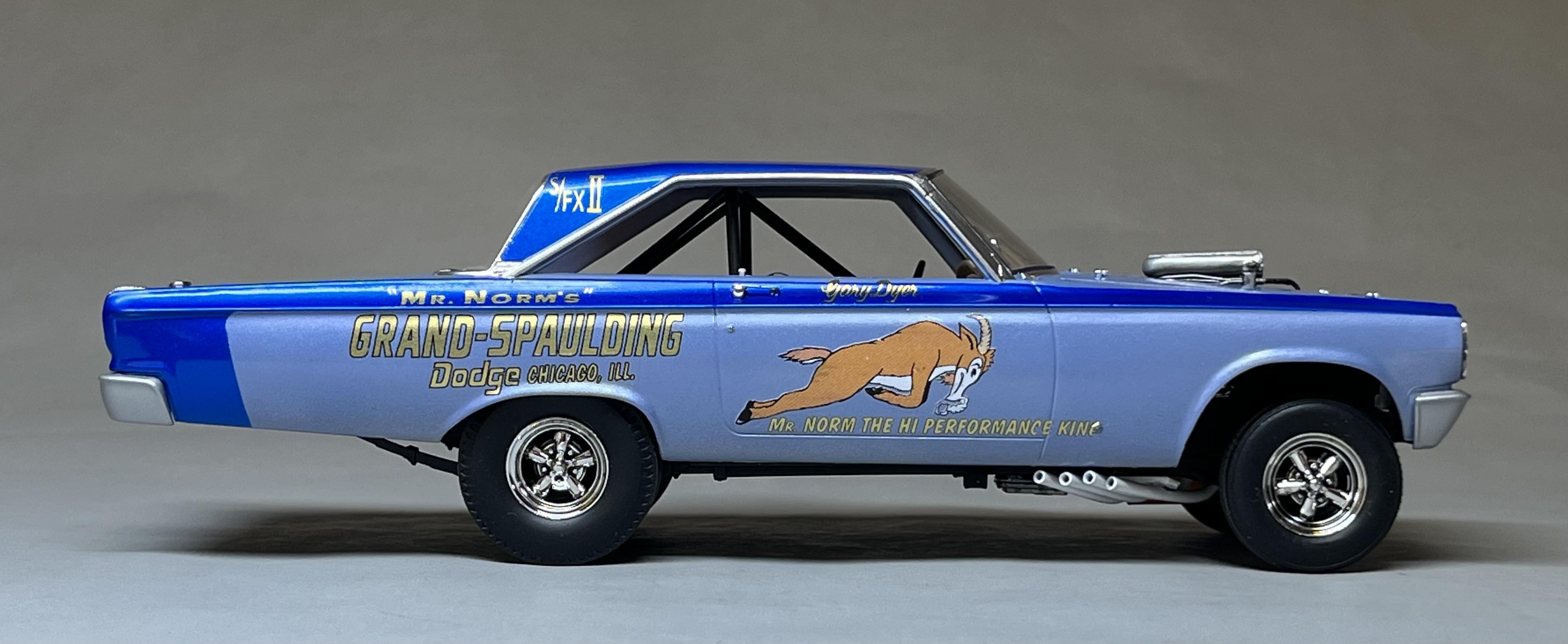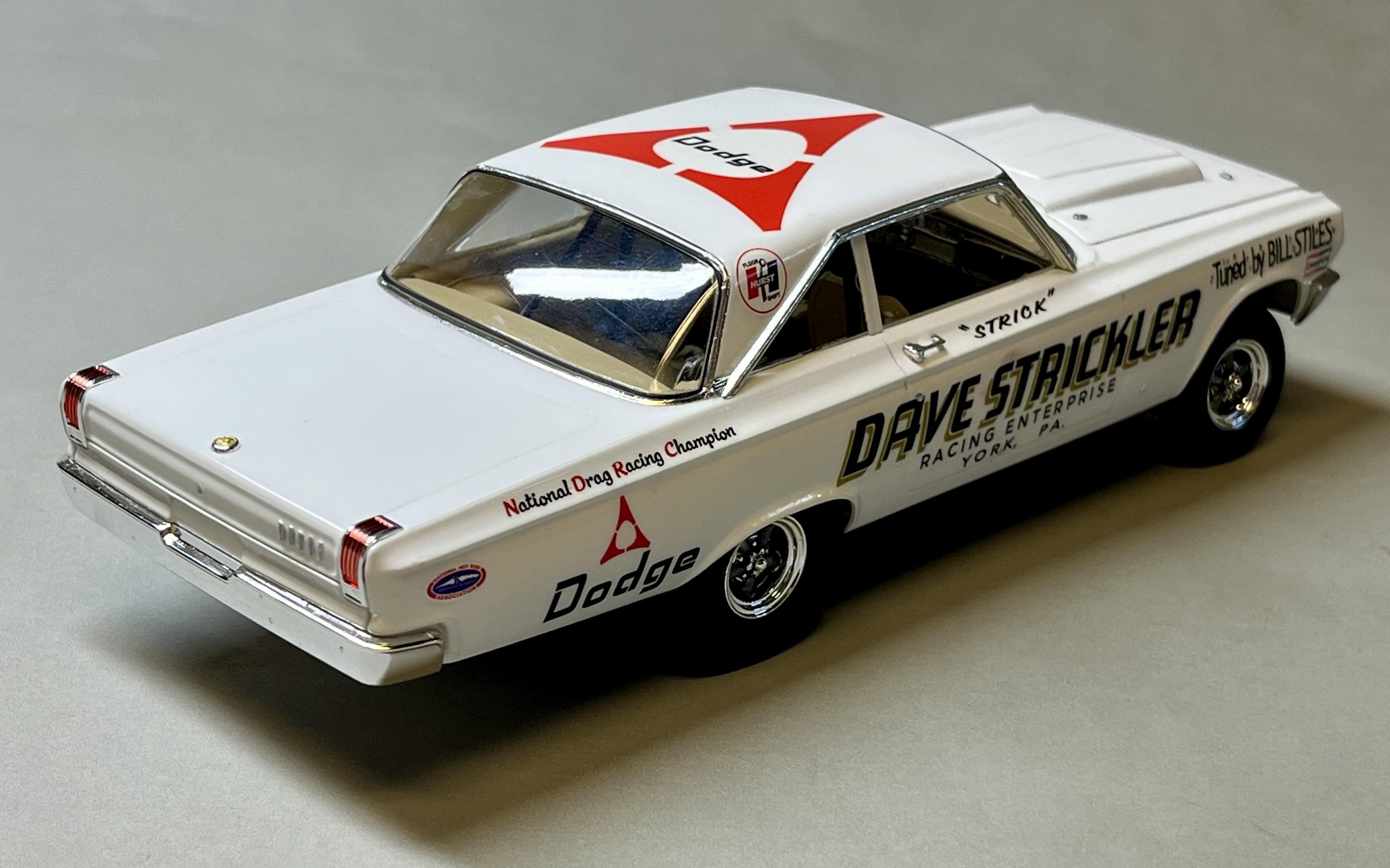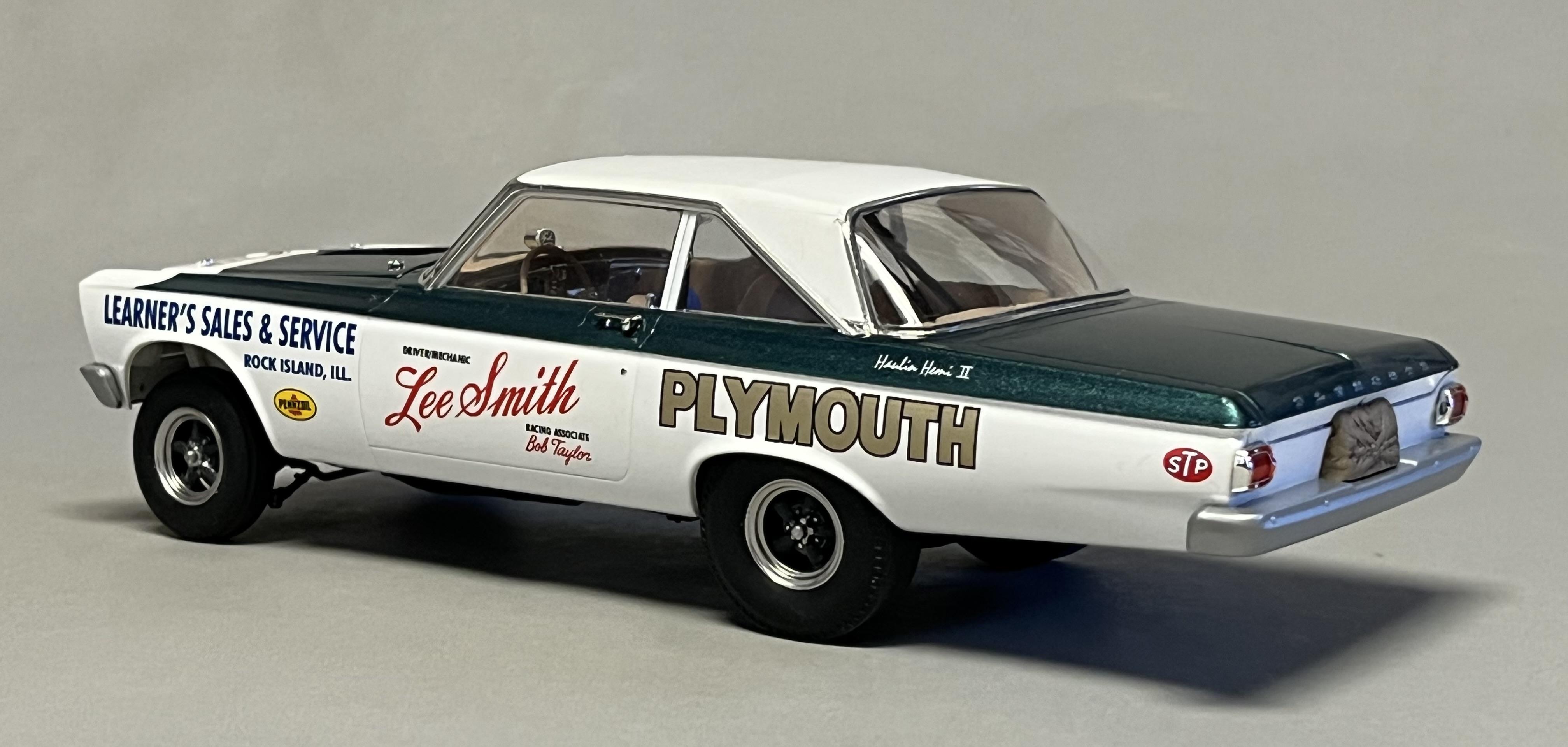 More big decals Mike and you did a great job on this one too! Those long ones along the middle of each side profile must have been a challenge. At this rate you're going to have a 1/25 reproduction of every one of the '65 AWB Mopars.... impressive! Once you've completed everyone on your list, please line 'em all up and post a group pic of them. I would love to browse through your SS magazine collection, it would make for some fun mid-60's drag racing reminiscing! -
