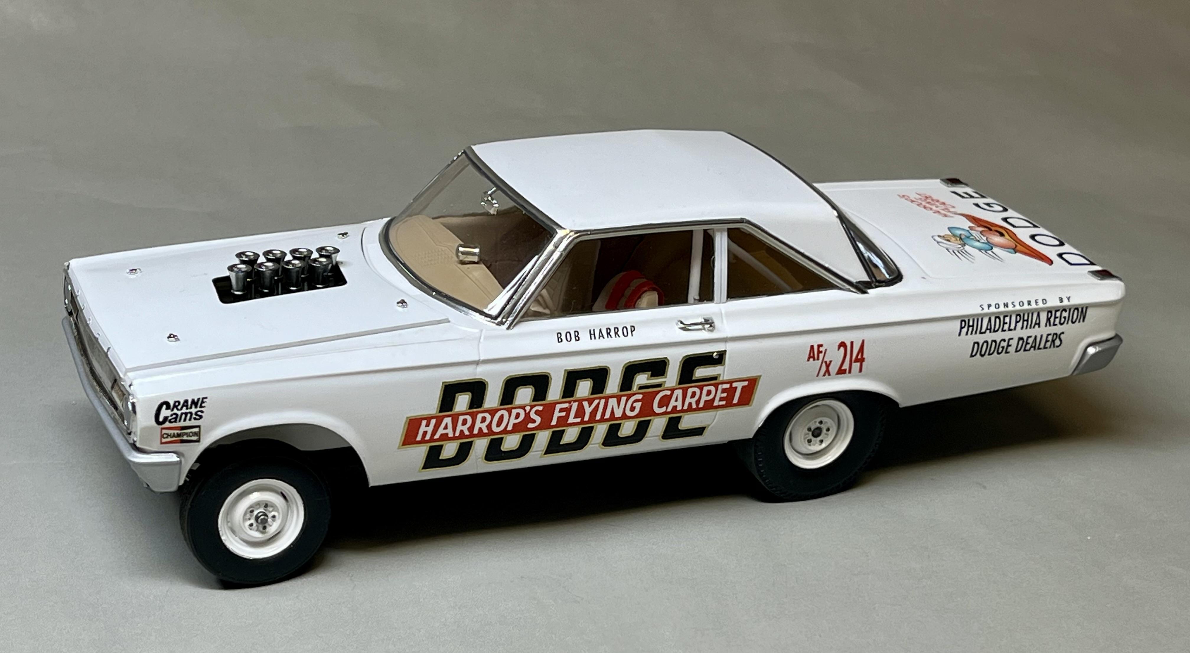This the first of the new Moebius '65 Dodge AWB A/FX cars that I built using the box decals. I used two resin Holley Carbs in place of the kit Hilborn FI to depict an earlier version of this car. I thought I this build would be a "dry-run" of this new Dodge kit but I made mistakes on the other three I subsequently built so sometimes one kits enough! Moebius did a great job on these AWB Dodges but I think the AWB Plymouth is like 10% easier to assemble. I found the chassis to body fit at the rear was really tight and took some finesse and tweezer crow bars to get positioned correctly. I used Gopher four point racing harnesses on all five builds but only on the drivers seat, conventional seal belts on the passenger side. I replaced the thick fuzzy belt material that came with the Gopher belts with finer adhesive-backed fabric from Scale Motorsports. The stainless steel Gopher photoetch was challenging to remove to the frets.