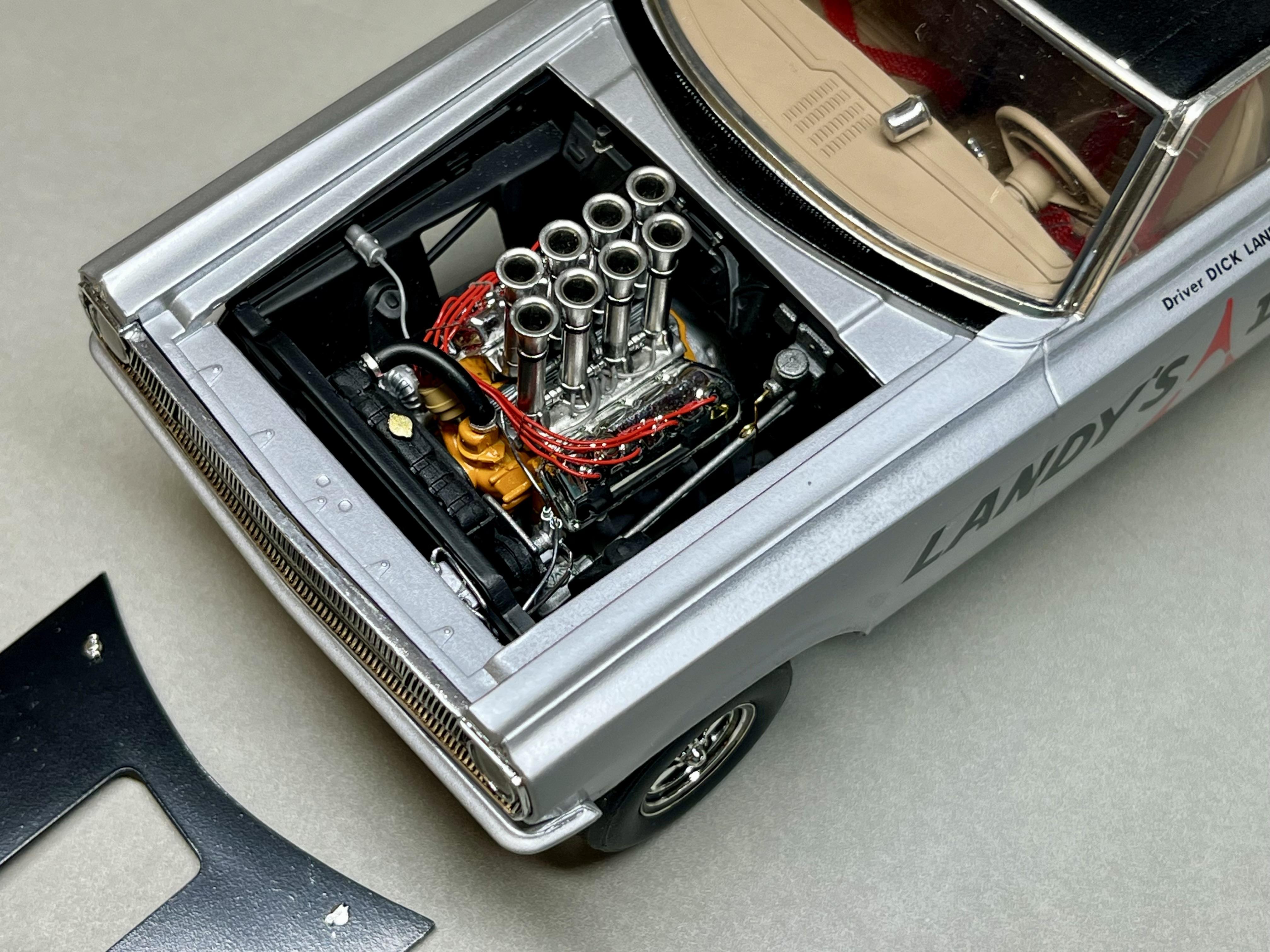 Here's Landy's car, Slixx decal set and painted in Tamiya Silver Leaf lacquer with Tamiya semi-gloss and flat acrylic back. I've always assumed that Landy had a black vinyl roof on this car so I bonded two strips of thin styrene on the roof to indicate seams. Other upgrades are similar to the other builds. I forgot to mention that I had to graft resin TorqueFlite 727 AT's onto the blocks of this car, the Harrop car and the Mr. Norm's car. I'm surprised that Moebius didn't supply an AT version of the hemi with this kit which was more common than the four speed.