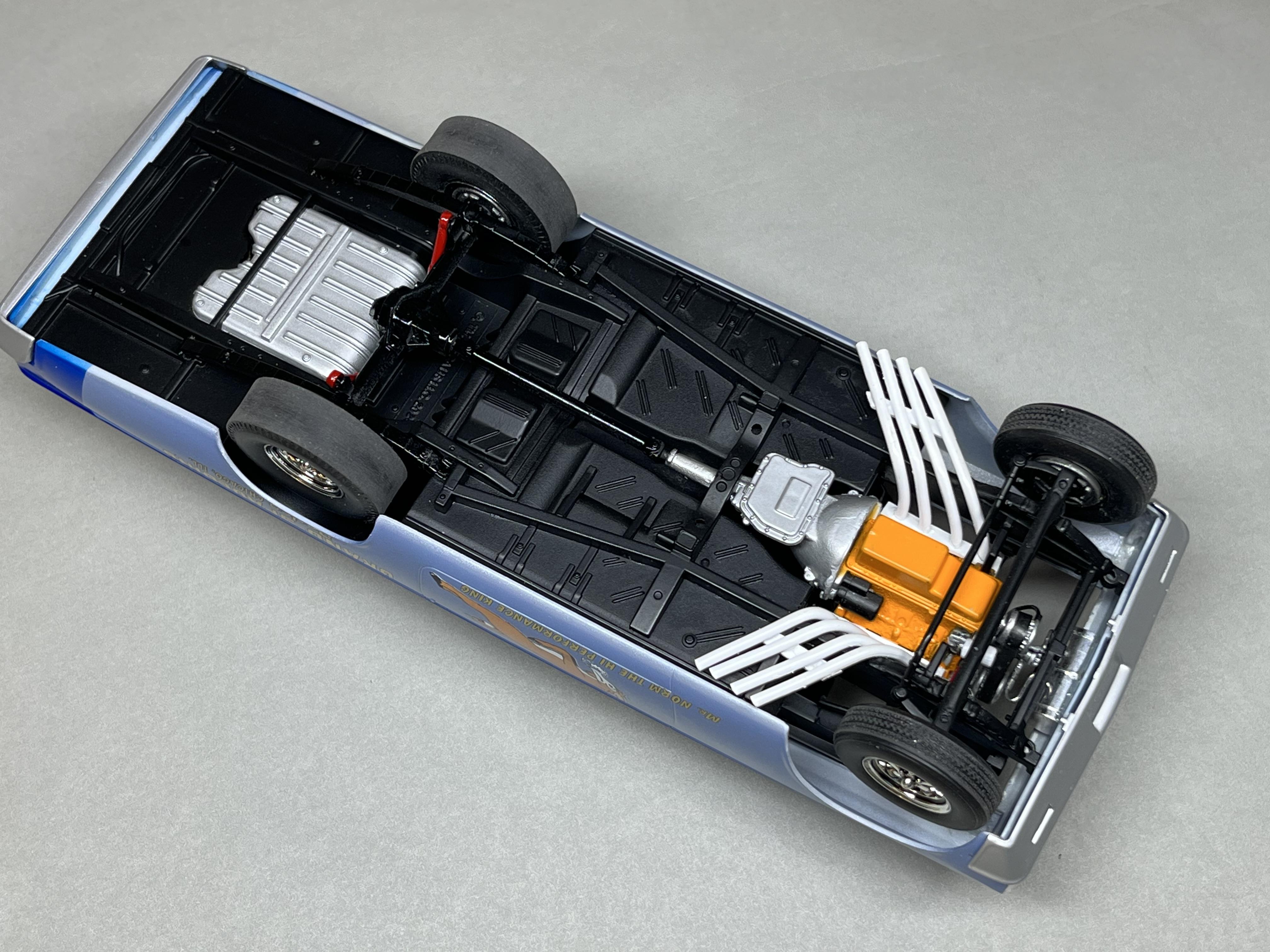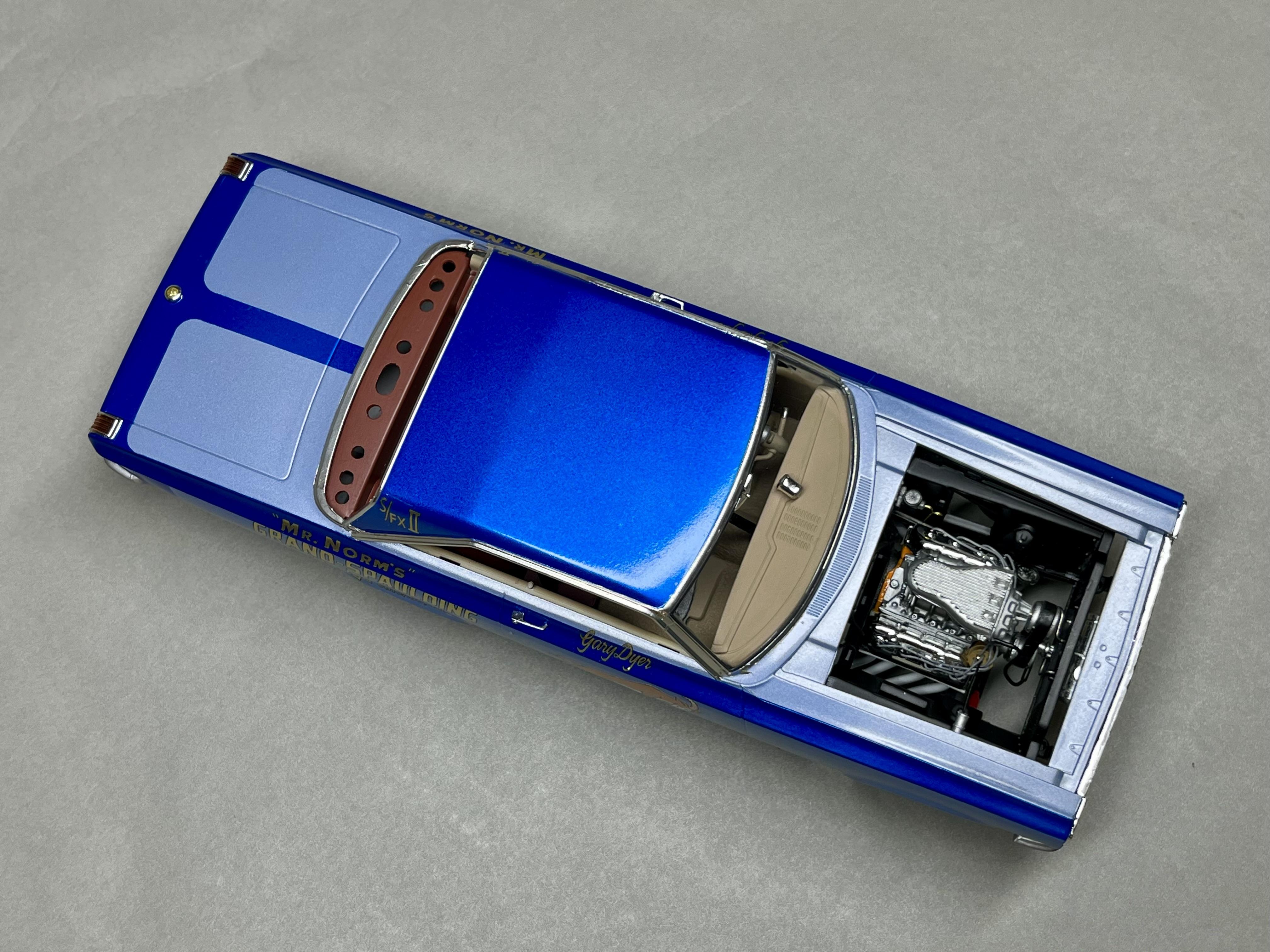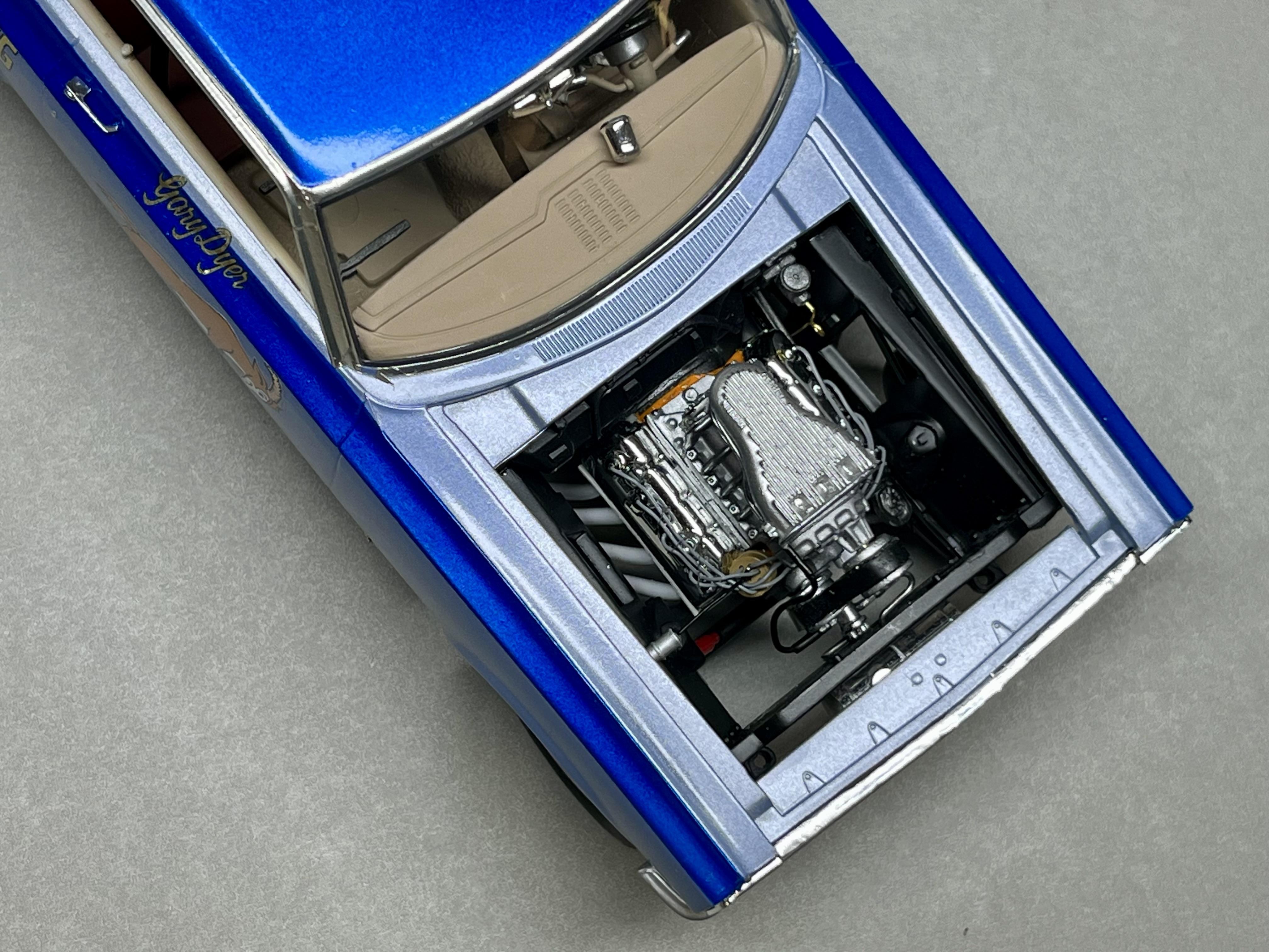 This one was the most challenging, the gutted supercharged NHRA rule-breaking match racer that Gary Dyer briefly held the 1/4 mile record for door slammers in Oct '65 at Lions. I had to scratch-build a straight axle for the front end, probably not accurate but good enough, grafted a resin AT to block and the blower, manifold and bug catcher/ injector are resin parts from Speed City. I also scratch-built the headers and fuel pump and had to do major surgery (after painting and decaling, I hate it when that happens) to get the aluminum nitro fuel tank to fit in front of engine bay. Paints used were ScaleFinishes HOC PBC36 TruBlue base lacquer over Tamiya Pearl Light Blue lacquer. Decals were from Fremont Racing Specialties. Really pleased with how this one came out, it's my favorite of the five. Thanks for looking! Cheers, John