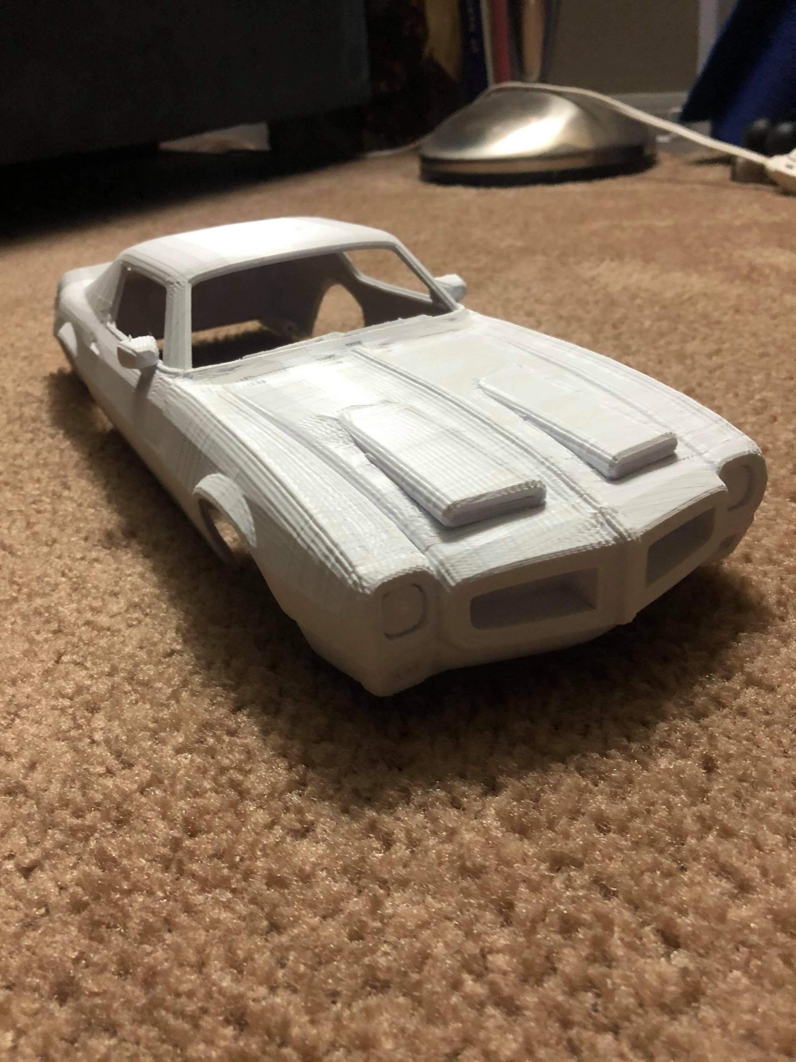 1/10 71 Formula 455 H.O. 3D pla printed from creations3 printer. Body only.. using 1/12 Otaki 455 H.O. trans am parts.. narrowed the chassis.. fire wall.. .. sub frame from a 1/16 kit.A few 1/16 dashes were cut to make this 1/10 dash . Plexiglass and filler for interior panels.some seat work.. front end is flip nose.. 455 h.o. 4 spd non ac with twin carbs. Detailing to the max. Plugs wires fuel and brake lines .. tan flocking carpet... And it will have a vinyl tan top.. emissions decals along with center cap decals.. hood and all decals custom.. Metal honeycomb rims.. With valve stems and lug nuts bolt in as they should. 4 wheel disc. Functional geared rear end. Non opening doors at this time.. Body is not painted. I plan on using tub and tile.. ceramic type coating in white. Tan interior car. 1 of a kind!!