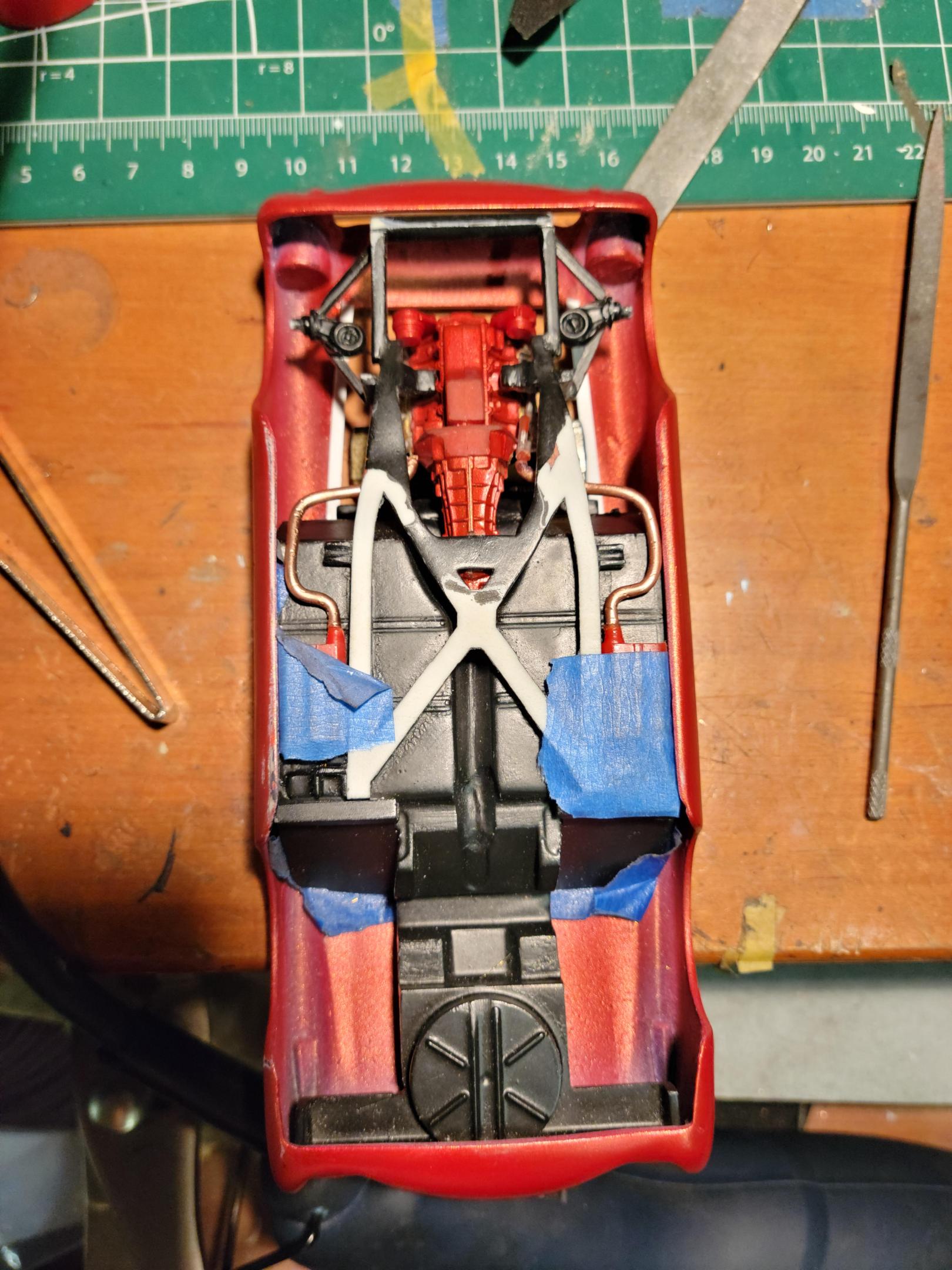Yeah I went to start detailing the dash and I started by adding some accent color, the gold that I had been using throughout the model, but once I got done with the curves it started to look like a tribute car to 'Iron Man' and I just couldn't continue. So I resprayed it in the red and I have the decal set from a Chevy Chezoom kit I did years ago and I think they will fill in those little pods nicely. I didn't mention the Mustang logo etched on the face of the passenger side that I had to remove either but I feel like this interior was meant to be in this vette.