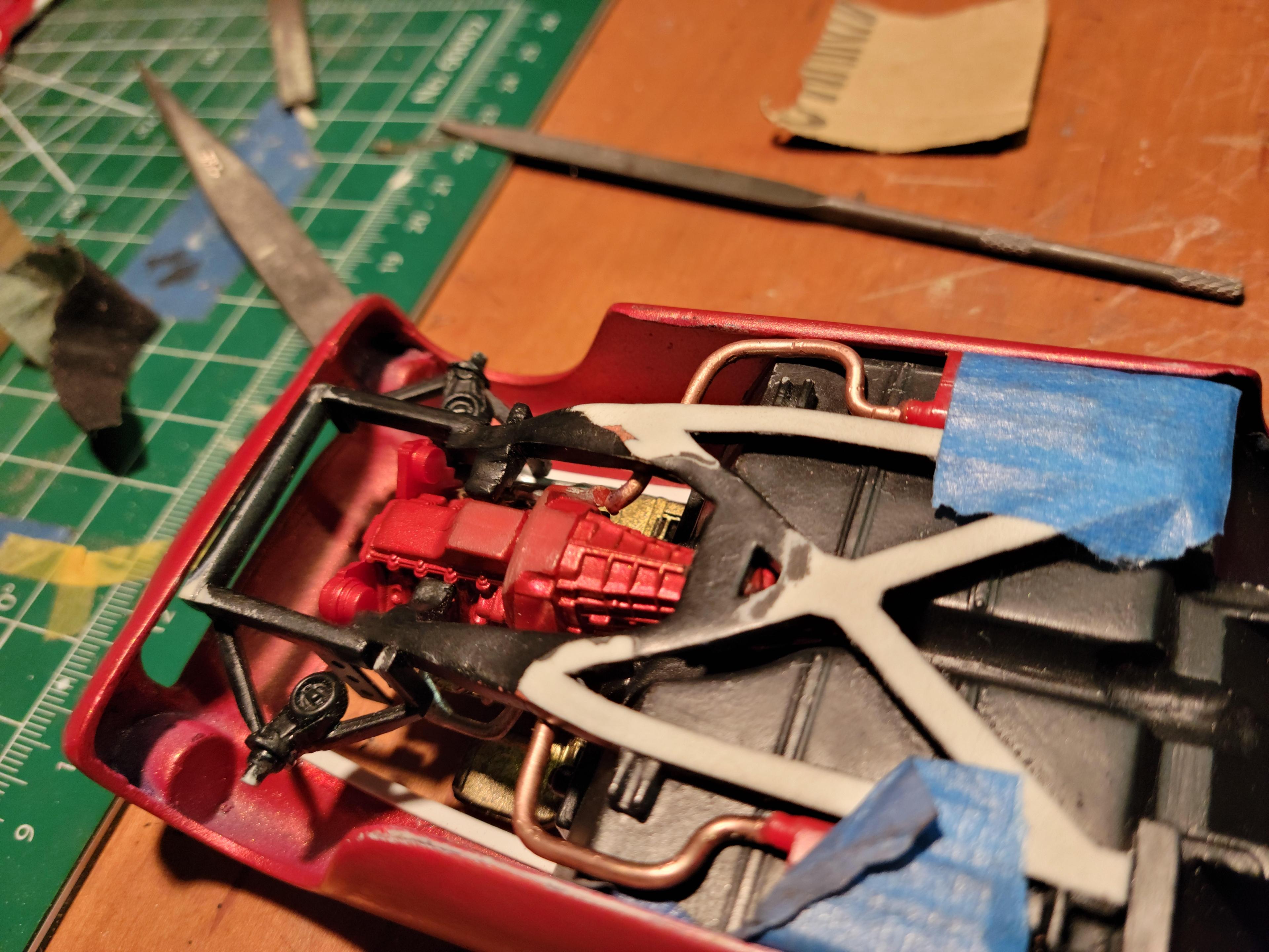 Thanks! I have managed to source a good amount of part and mesh them together for this build up. With the Corvette being from 1953 and Ford debuting this Mustang Concept in 1993 the parts are working well together, at least for my vision. So far I have managed to massage the body of the Corvette by filling in the license plate area, taillights and headlights and some filling in around the front grill opening. I saved the Corvette's original frame and but I am scratch building, and parts bin using, a few bits for the front suspension as this making has a major dislike for gravity. The seats and interior door panels are still stock from the '53 as well. Currently the interior color is area I keep coming back to with no set color scheme or layout that seems satisfying. With the interior comes a major 1993 upgrade in the way of the dash panel. The Mustang dashboard fit well after some trimming and it comes down to the trans tunnel perfectly. The steering wheel is still up in the air but will probably be a few years older than a '93 would have. The motor was sourced from the Ford, the 1993 concept Mustang had a Eaton Supercharged 4.6 V8 backed by a T-56 transmission. Other than making some custom engine mounts, the oil pan had to be shaved some due to clearance. The blower was cut and lengthened for more power and well to be honest, ascetic. The longer intake really shines nicely when the hood is off. The hood was a main bit of focus since I really liked it so much from the original Mustang. Those ram air side openings just snarl at you and the air filters set just right under them to match. The hood was worked from uts original outline and profile to fit the flow of the vette. The rear-end and driveshaft are also Ford and of course both had to be shortened and cut down to fit under the '53s frame. The rear had added disc brakes from the Mach, but the front end received cross drilled disc brakes that were parts bin sourced. I am working in the front radiator from the Mach with hosing hopefully, as well as the exhaust system. I haven't really ever made a pair of pipes from scratch but I'm tried to make a set, I'll attach the photos later, from some copper electrical wiring. The bending and twisting were very trying, and I'm sure some solder wire would have been easier as well as using some properly rounded pliers would have helped with the tool marks... Always learning... I'm probably missing some details here and there with what I've used from which kit so far but the wheels and tires were parts bin as well, from a Nascar kit on the back and a 40 something Ford by Boyd I think for the fronts. I'm thinking the front glass that I will use is from an early 90s Corvette as it gives the car a good raked look that really sets it off. Thanks again for the comments and for these forums. It is always great to look and read what everyone is up to! The type of work everyone puts in on here really shows in these builds and the feedback you give. I don't know when I will get some more bench time as my desk light bulb blew on me today. So now I'm on a mission for a T bulb.