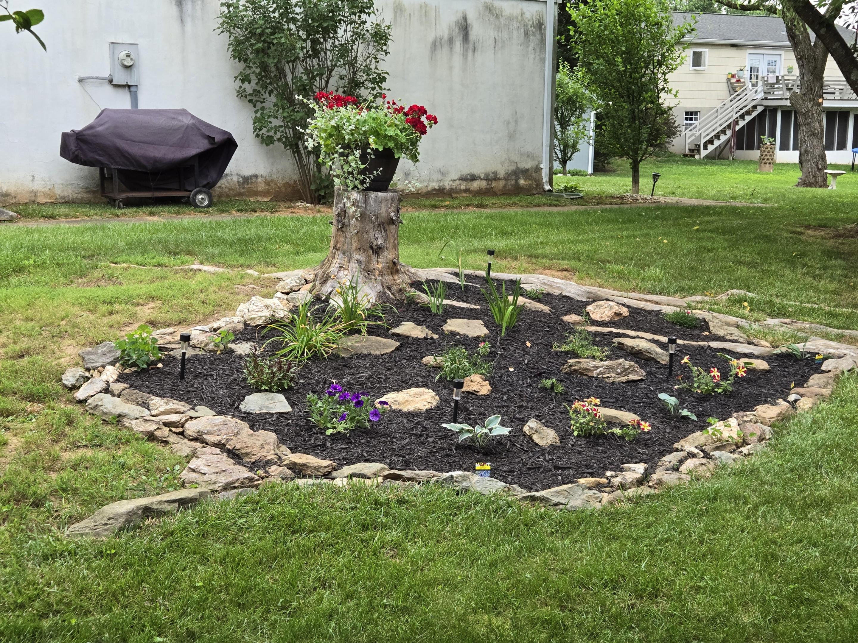 I was finally able to finish a flower garden area that I started approximately 2 years ago at my house before going to live and care for my dad. I had cut down a couple of old dying pines and saved one of the stumps and its topical roots along with various sized rocks to encase the area, which sat with weeds until a week ago. It should look pretty good once everything starts to grow. I still need to sew some grass seed in the grass bare spots and possibly get the neighbors to clean their foundation?