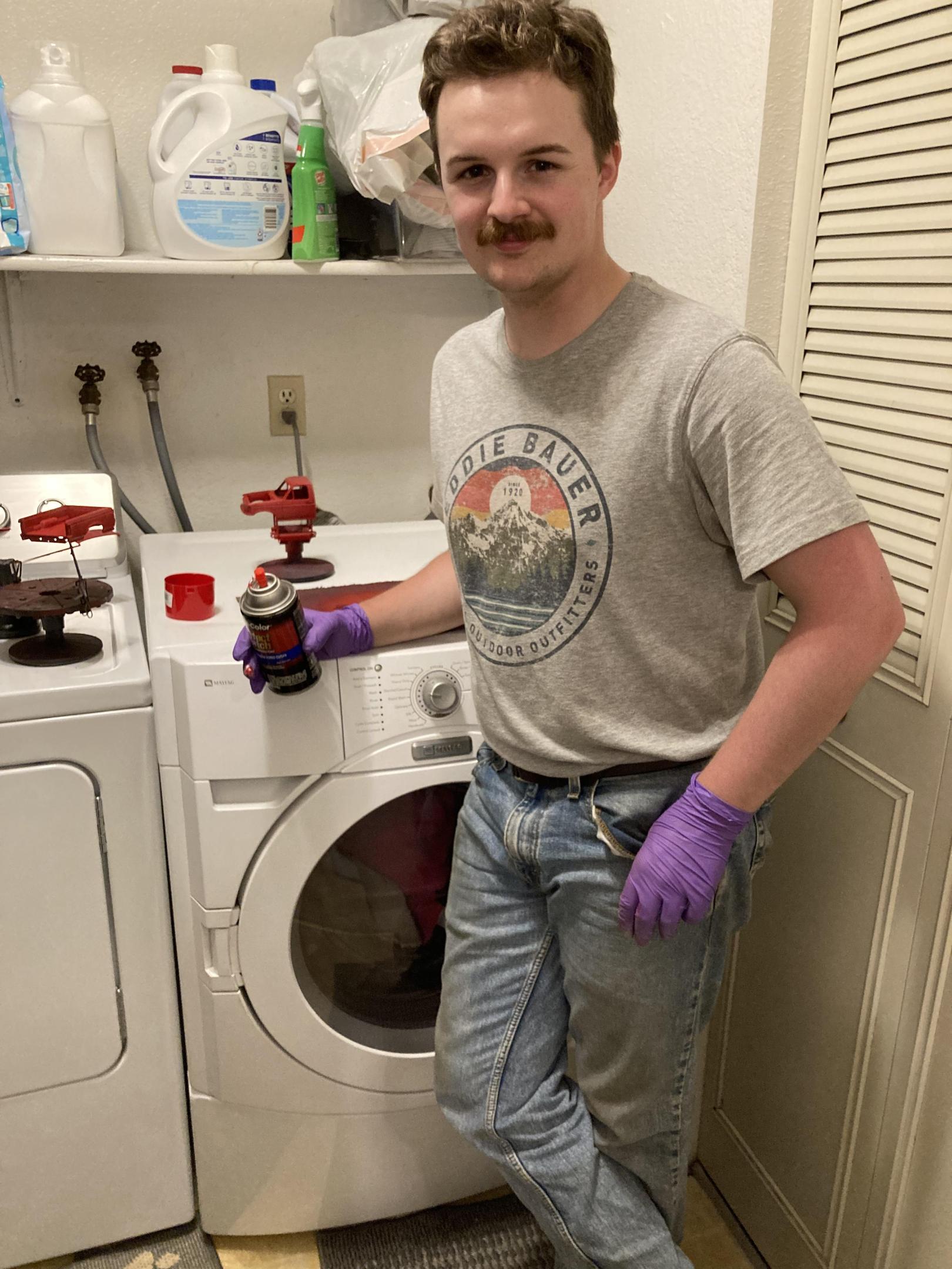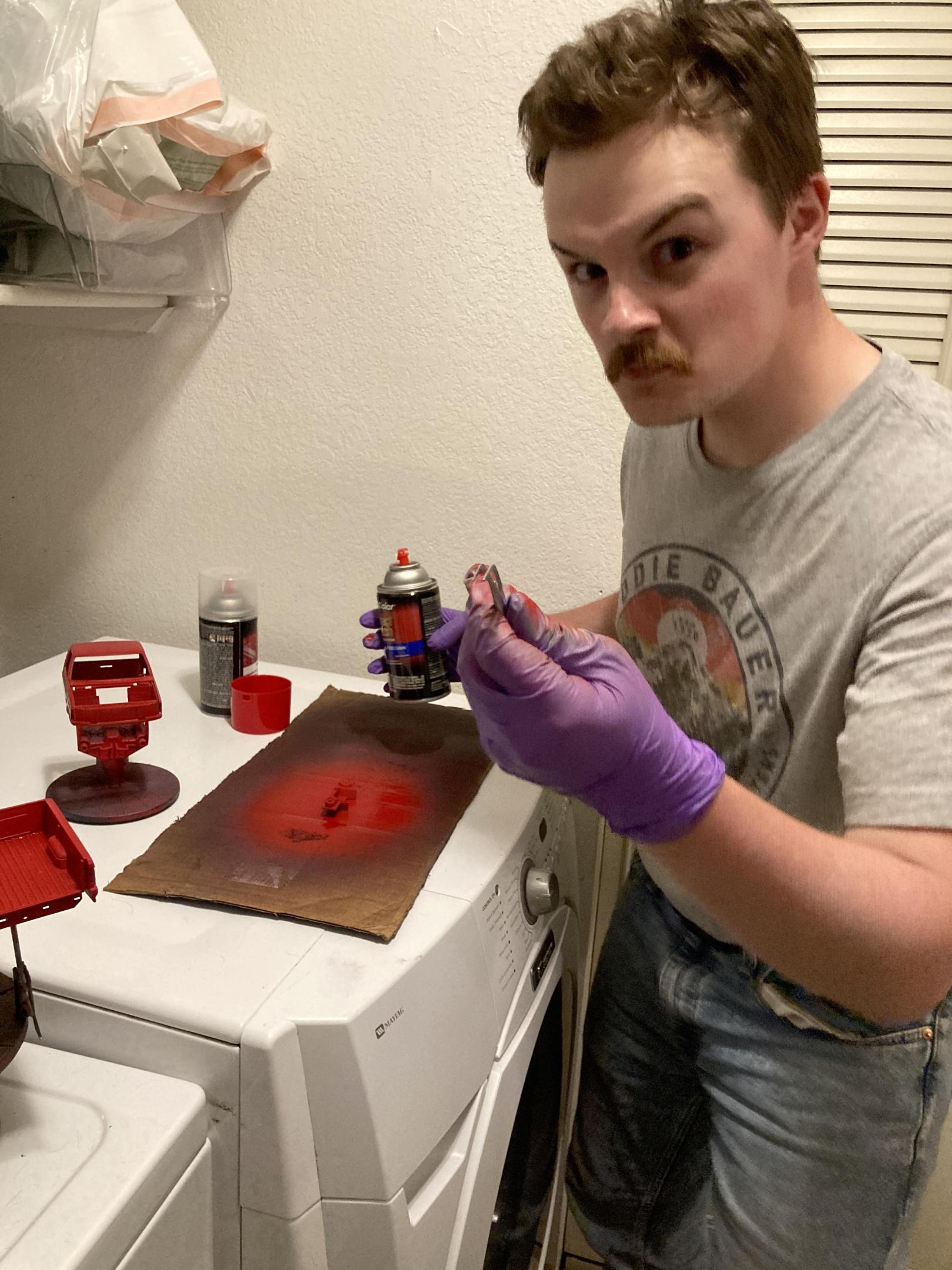 It appears I’m one of the younger guys here from the looks of it. I had the fiancé snap a photo of me posing with some Dupli-Color Vermillion Red. She got a little too close to the ol’ pincers of power though.