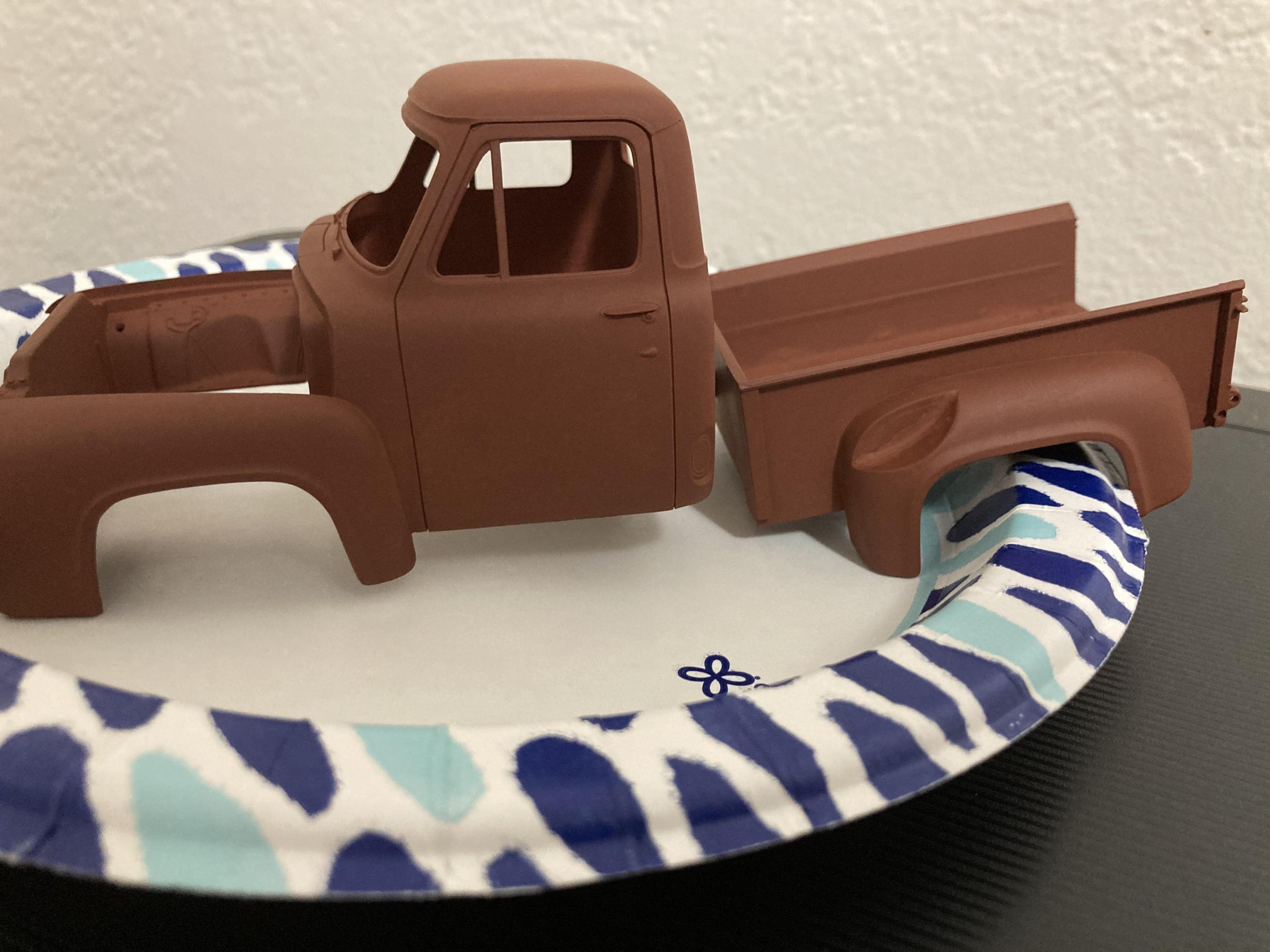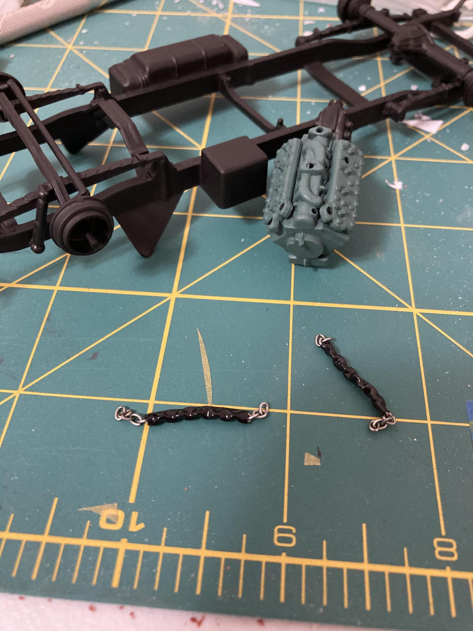 8. With the BRAT finished up and done, there was about a square inch of bare space on my work bench, so I figured I’d remedy that and start another project while working on the other ones. Jokes aside, my intention with multiple projects is to not get burned out focusing on just one. This kit was the Trophy Series reissue that came with the Wildkat decals and mini box. This is a great kit despite its age, the only gripe I have is with the interior, but the frame, engine(s), and detailing under the bed floor more than make up for it. I chose to make it stock, but not a Deluxe, so I hallowed out the grille and took out the Deluxe grille teeth. The grille will be painted a warm white, and I’ll be using Goof-Off to get rid of the white wall pad printing on all of the tires. I modified the driver side rear fender to accept a side-mounted spare after I saw how good an image of it online looked. I also made some tailgate chains out of jewelry chain and electrical tape, we’ll see if those work out or not.