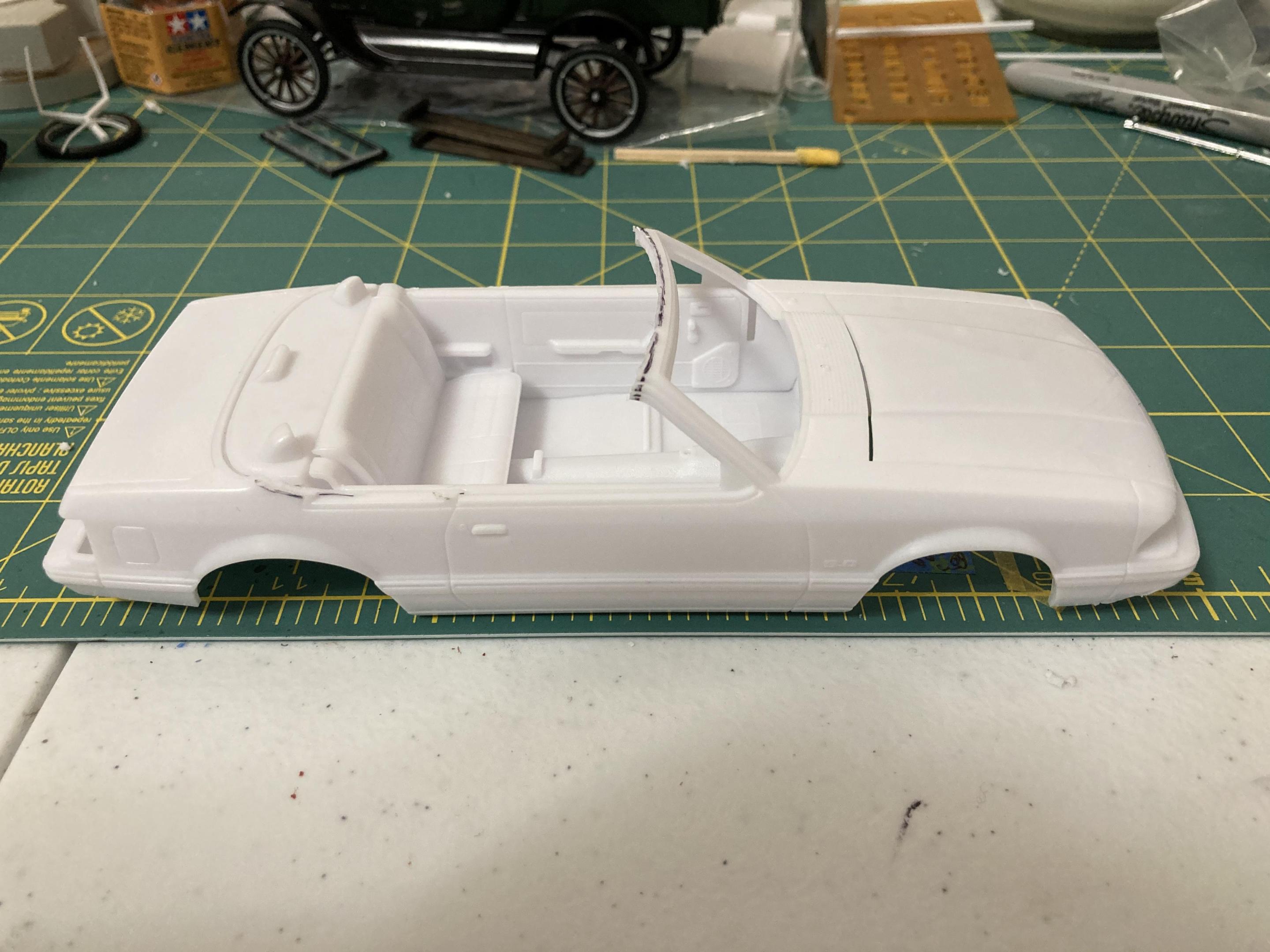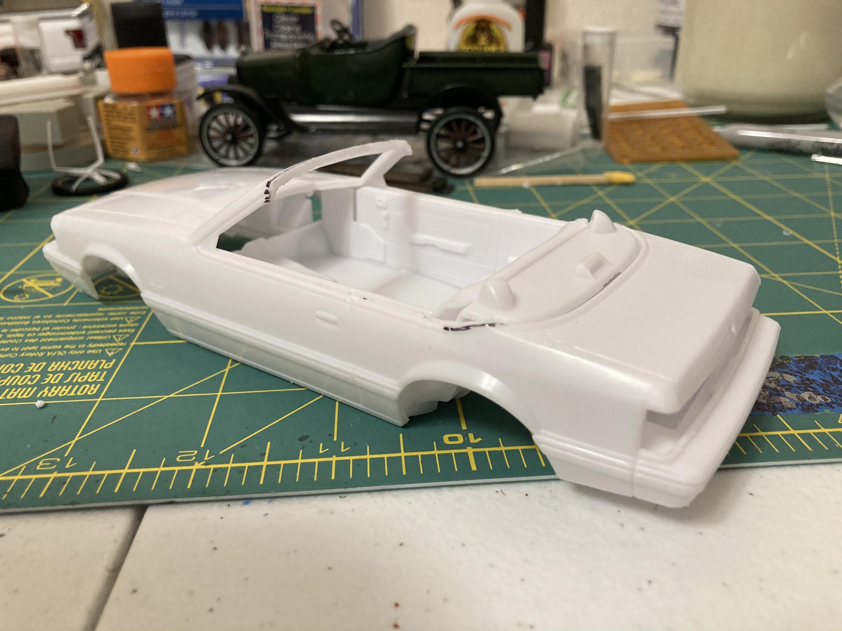 As my AMT Model T is nearing completion, I figured I’d get a head start on my next project. I got the itch to challenge myself a bit and turn a coupe/hardtop kit into a convertible. As my eyes darted sporadically up and down my shelf of kits, I spied my next victim... er... candidate, near the bottom. Given the slight proportion problems with this kits’ roof from the get go, no tears were shed when I picked up my Dremel (and perhaps let out a maniacal laugh as lightning flashed through the window). The high pitched whirl of the Dremel’s cut-off wheel drowned out the Ratt song I had playing in the background. A mock up of what I’ve got so far: I still have quite a ways to go on body and interior work, and will have to source a convertible boot, but I’m digging it so far.