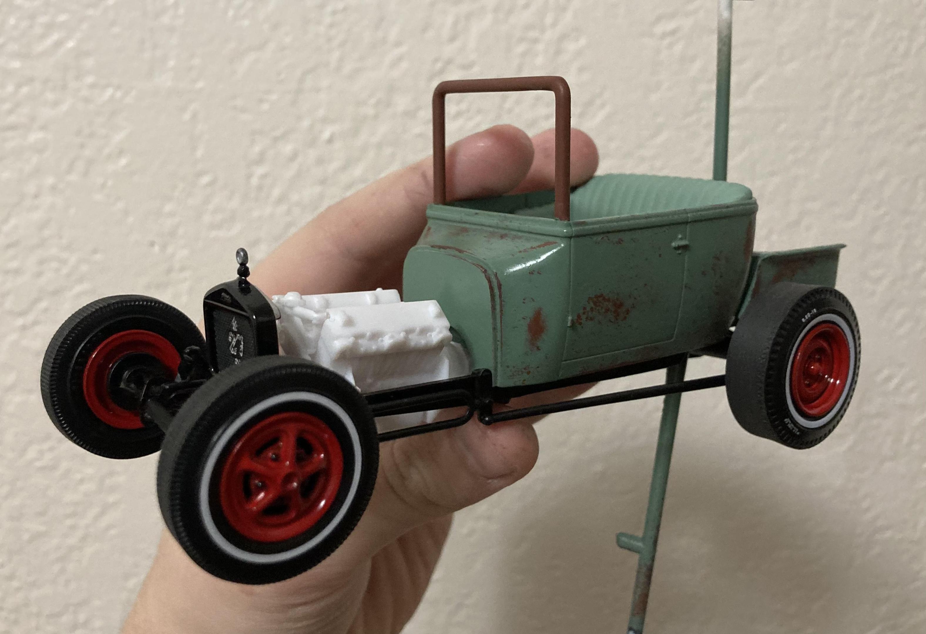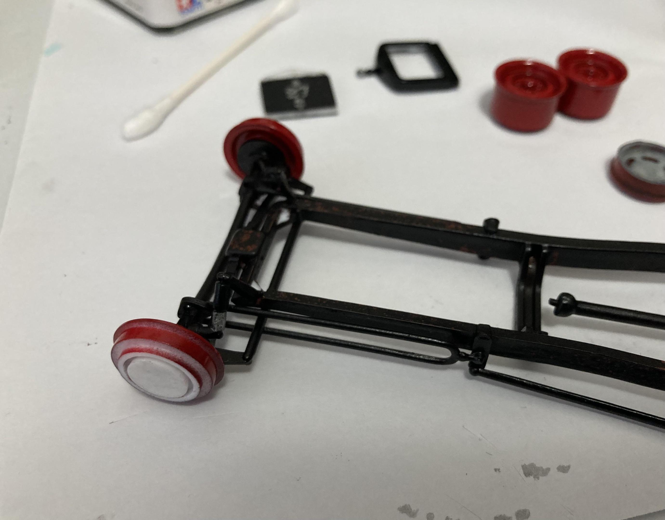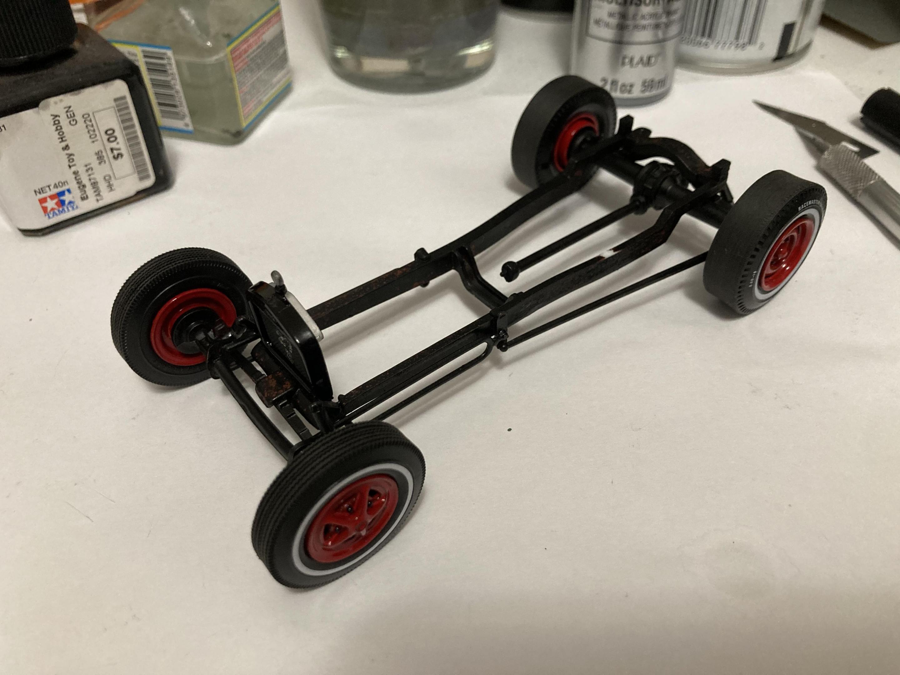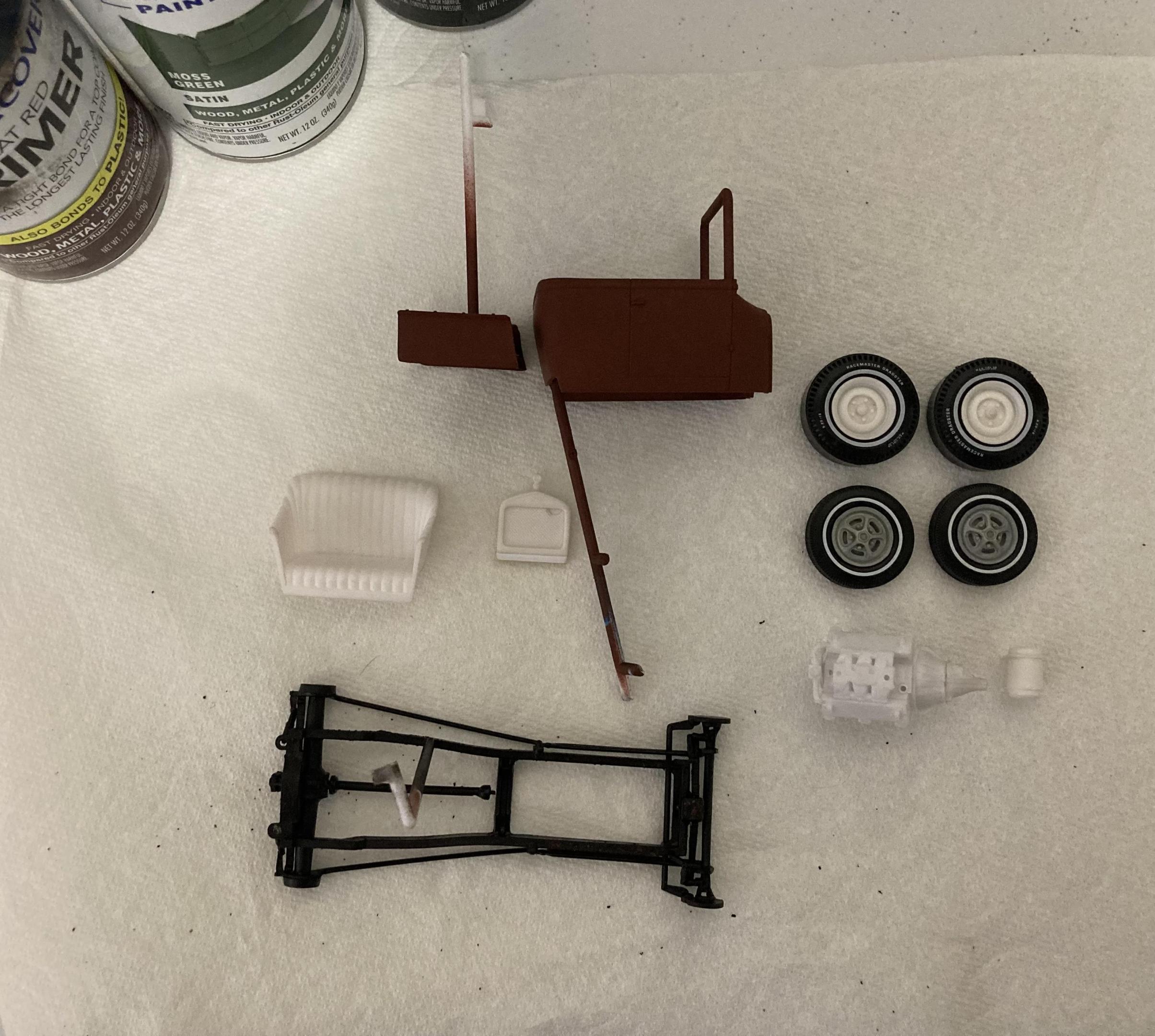 Thanks Carl. Waiting on enamel paint to dry so I can get the wheels on and the chassis rolling. As for the body, I broke through to white plastic in a few spots. Good thing I’m trying to emulate a crust bucket, I can just paint some brown over those spots. I haven’t given names to my builds but I’ve got an urge to name this one “Leapfrog Lizzie”. That oughta be an indicator of how rest of the paint scheme will look.