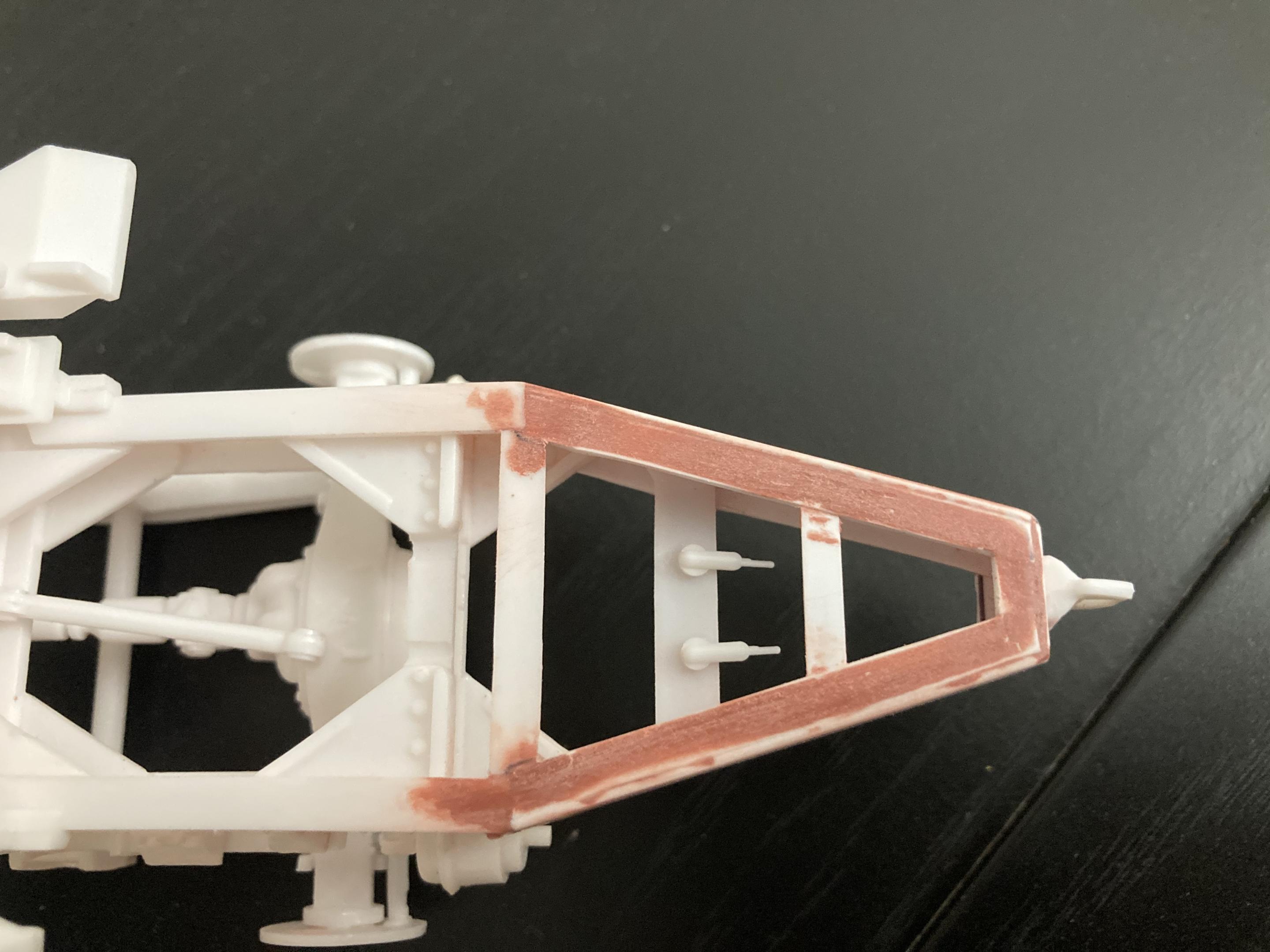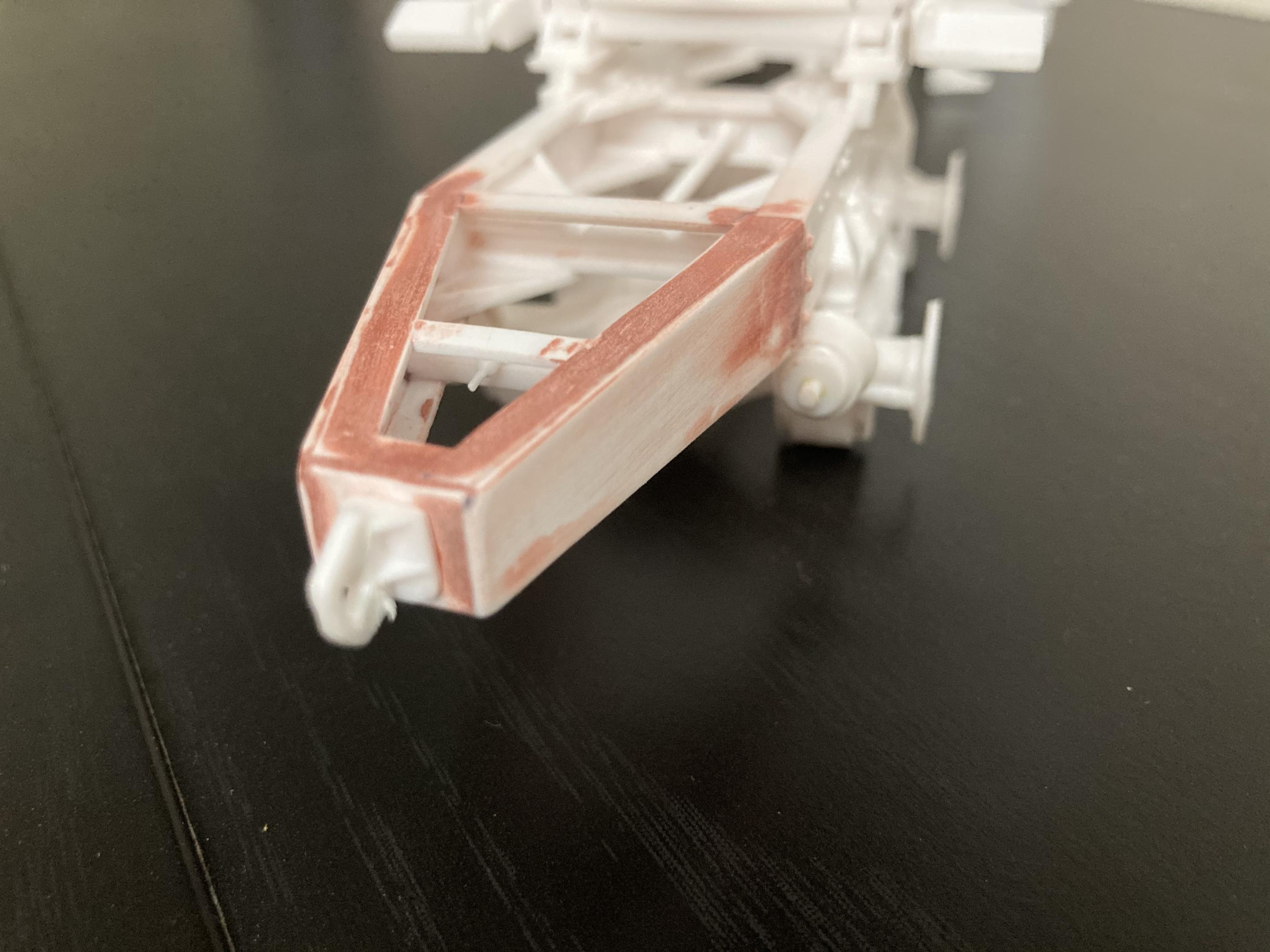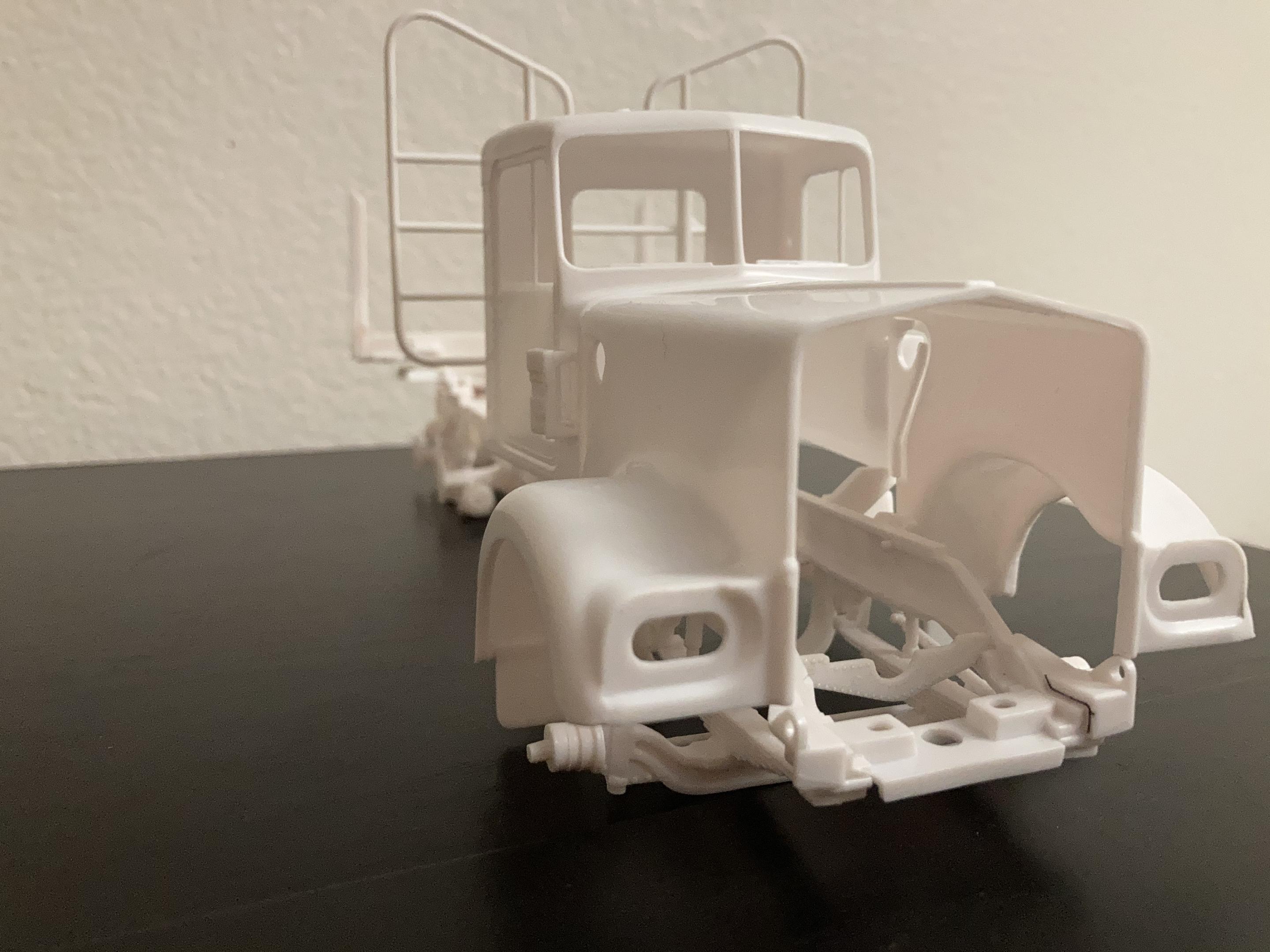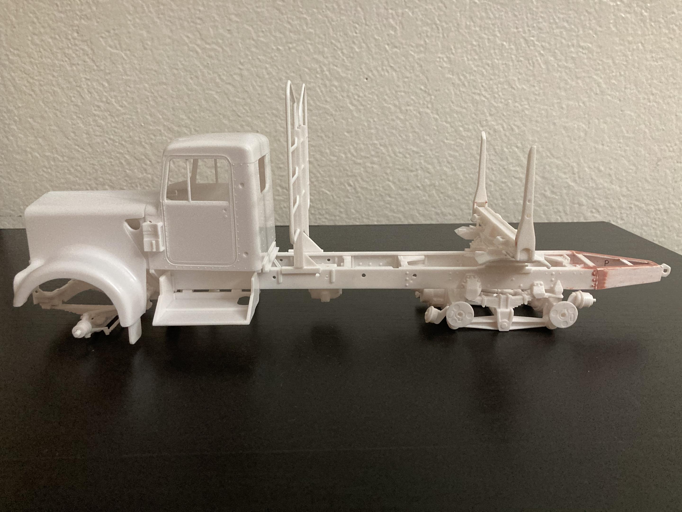 Howdy. This truck started as the reissued AMT Challenge mixer truck, the mixer itself will be going on a modified Ford Louisville truck later on, and this W-923 will be paired with the AMT Peerless logging trailer. I had to slightly modify the Peerless parts to fit on the KW frame, the frame was a sliver too narrow, my guess is that the Peerless parts were designed to go with the Mack R model, given the Peerless box art. I decided to make a stinger for the rear of the frame, as most trucks here have them to aid in cornering on tight logging roads. I went with a tapered design on the stinger. Most sub-assemblies are done, so it’ll be seeing some paint soon.