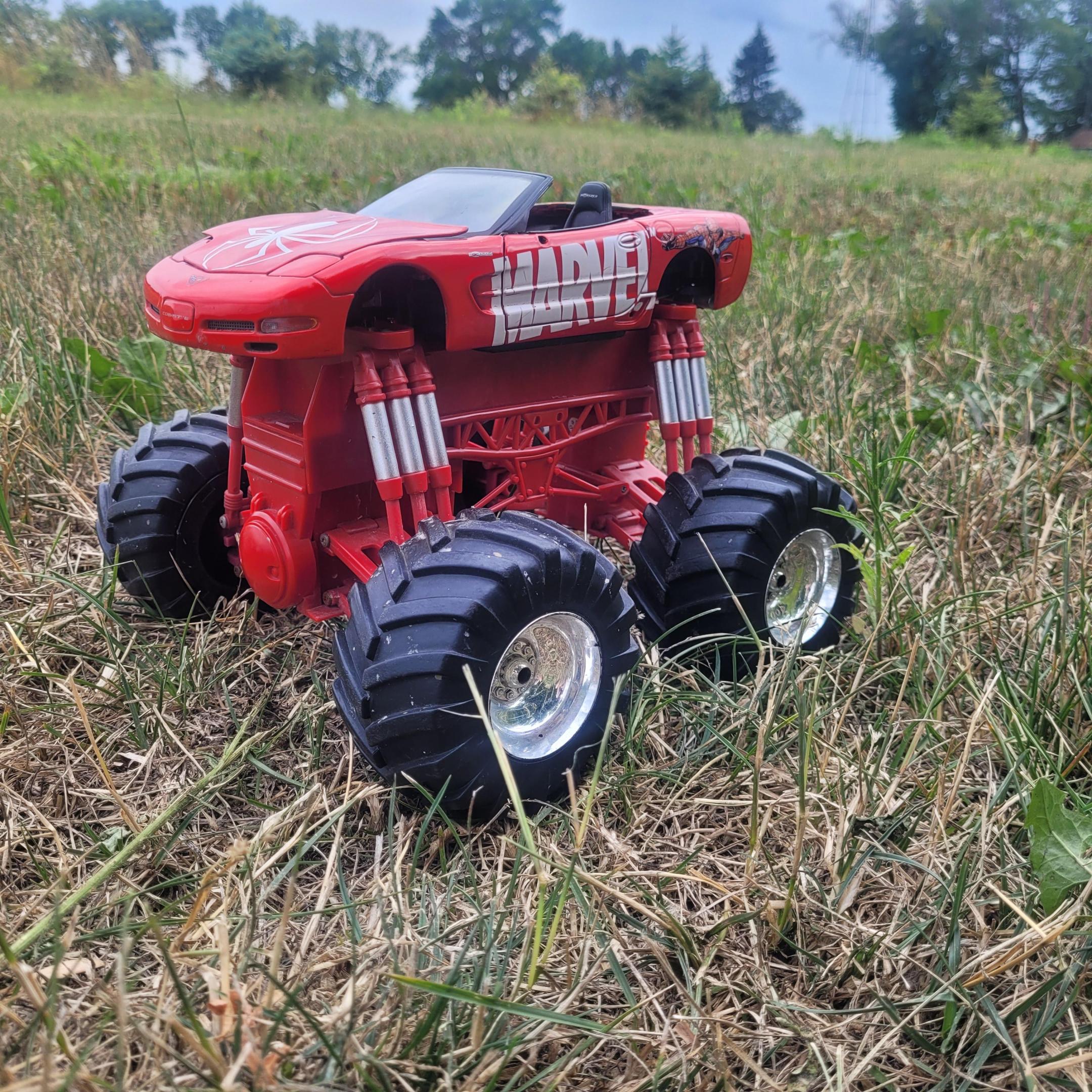 This corvette has lived a rough life. I got it when I was a kid at a yard sale. It wasn't in great shape, even back then. A few years after, I wasn't paying attention and stepped on it. The passenger door broke off. I've glued the door back on multiple times. A couple years ago, I got the idea to make it into a dirt racer. I Dremeled the air dam off and went to the mud. A few minutes in, the rear right wheel broke off. Fast forward to today, as a teenager with nothing to do, I put a cheap monster truck frame under it. Thanks for looking. I'll answer any questions you have.