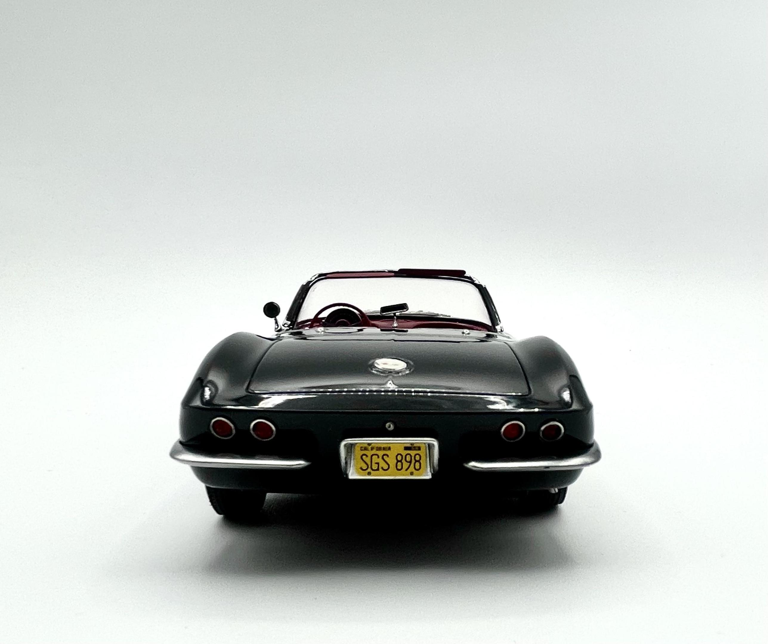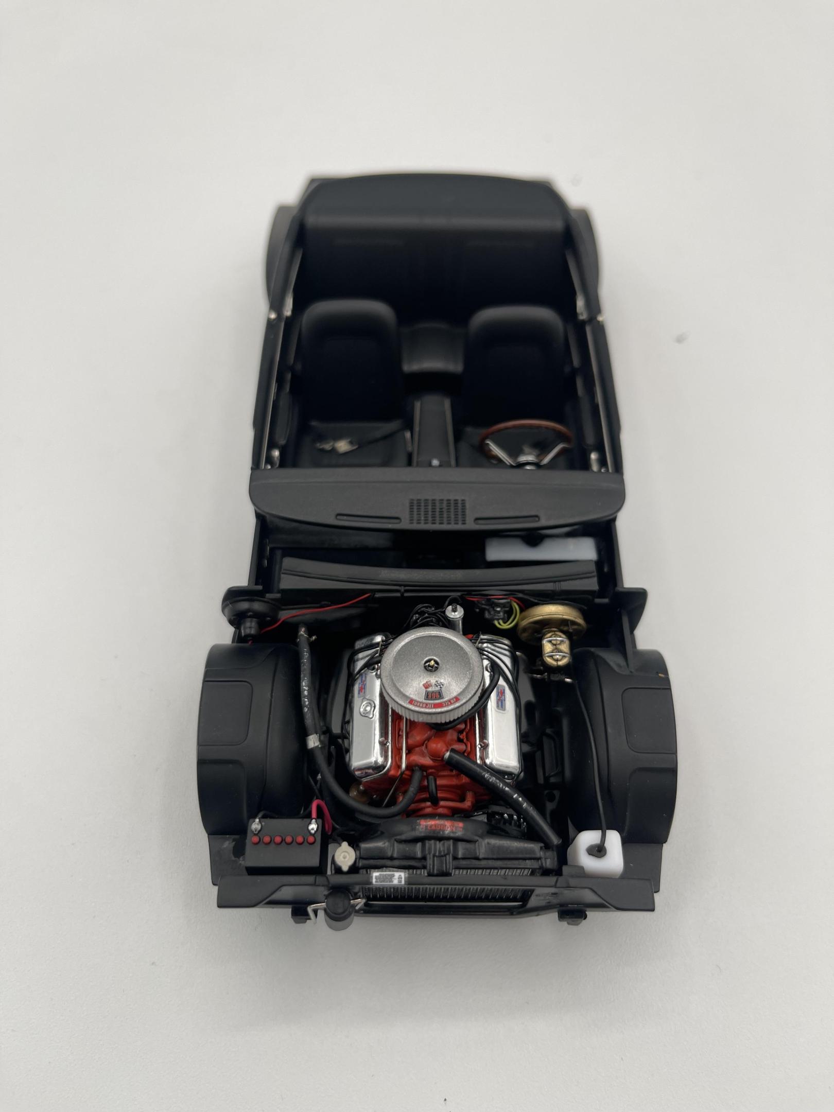 The exterior paint is Alclad gloss black base under Mr Super Clear UV Cut gloss. Interior is Ferrari Anny Red by splash paints with some matte, semi, and gloss clear coats. Interior trim is BMF. I used some rivets for the dash knobs but they’re tough to see in the pics. I opened the front grill and chromed the bumpers and side mirror with Alclad. I added some side brackets to the windshield to give it better definition, before hitting that with Alclad as well. The rest of the chrome is BMF. The grill, emblems and some interior detail come from the model car garage photo etch set. The tail lights were scratch built with polished aluminum tubing and clear plastic. It’s hard to see, but I also had to scratch a better steering wheel attachment point and graft the Speedometer dome to the dash, since on the 1:1 it comes in one piece (the dash, steering wheel, and windshield looked really toyish to me without some big adjustments). The front and rear suspension had to be shortened and lowered significantly to fit the wheels (I think they’re from Pegasus). I attached them with white glue as I may end up changing them out at some point. I found the hard top pieces on eBay. And I think that’s about it! Gonna take a crack at a ‘67 Camaro next ??