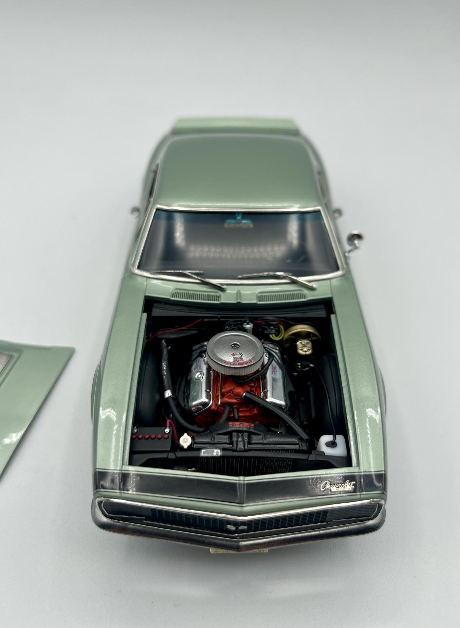 If you’ve built this one before, you’re well aware of the kit’s inaccuracies. I tried to address most of them, but I left the seats as is…we’ll say the owner replaced the originals with a kit set ??♂️ I built it as an rs/ss because I didn’t want to fuss with the side trim. The body was a mess out of the box and required significant amounts of scribing, sanding, and puddy - this is my only real complaint aside from the obvious part omissions. The steering wheel, badges and grill are from the model car garage photo etch set. I made good use of various gauge insect pins for trim on the grill and interior. I found the pins are much easier to work with than the jewelry wire I’ve used on previous builds. I also added some random detail to the engine bay and had to restructure the fan because the kit fan had the alternator on the wrong side for some reason. The carpet was done with black jewelry box liner with a dusting of gray primer sprayed across it. A method I’ll be using for all black carpet moving forward. Super easy. The bumper chrome, hub caps, and some engine bits were done with Alclad and the rest of the trim is BMF. The body paint is Splash Paints Mountain Green under Mr Hobby UV Cut gloss clear. Been loving every bottle of Splash i’ve used so far - especially their well-scaled metallics. The interior was done with Mr Hobby black primer and various glosses of clear coat. The wheels and carburetor (not pictured) are from fireball. Had to scratch build the front and rear lights with clear plastic since the kit didn’t come with any. And that’s about it…overall, an amazing little kit. I didn’t take any of my usual outdoor pics because I haven’t had time but I will eventually. Planning on bringing this and a couple others to NNL East on Saturday so we’ll see how it goes… Have a great week everybody!