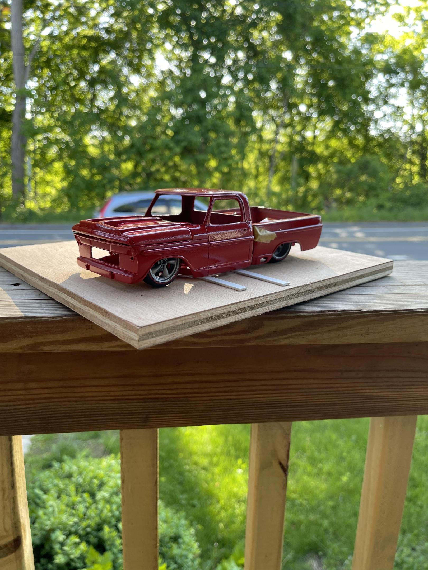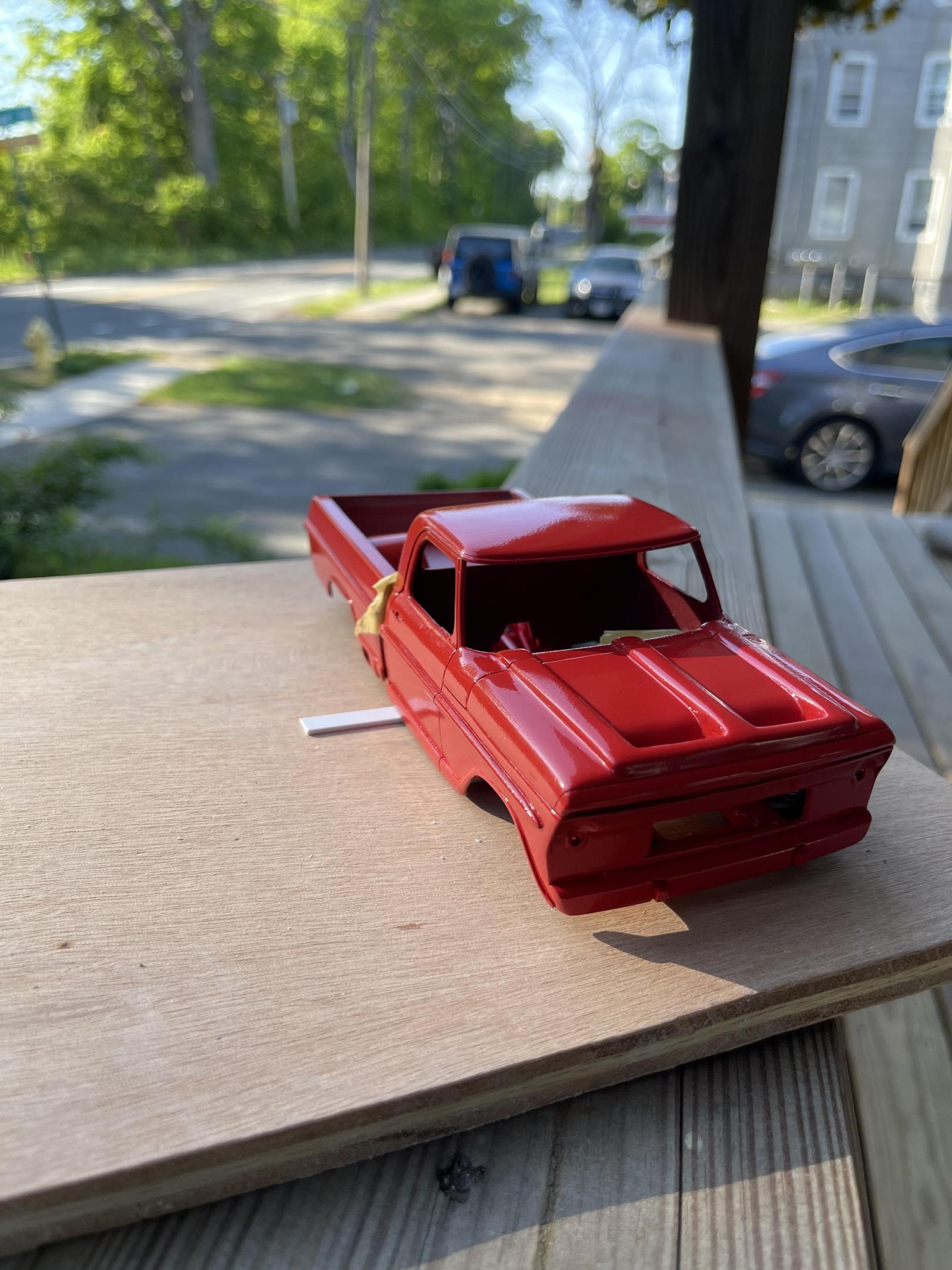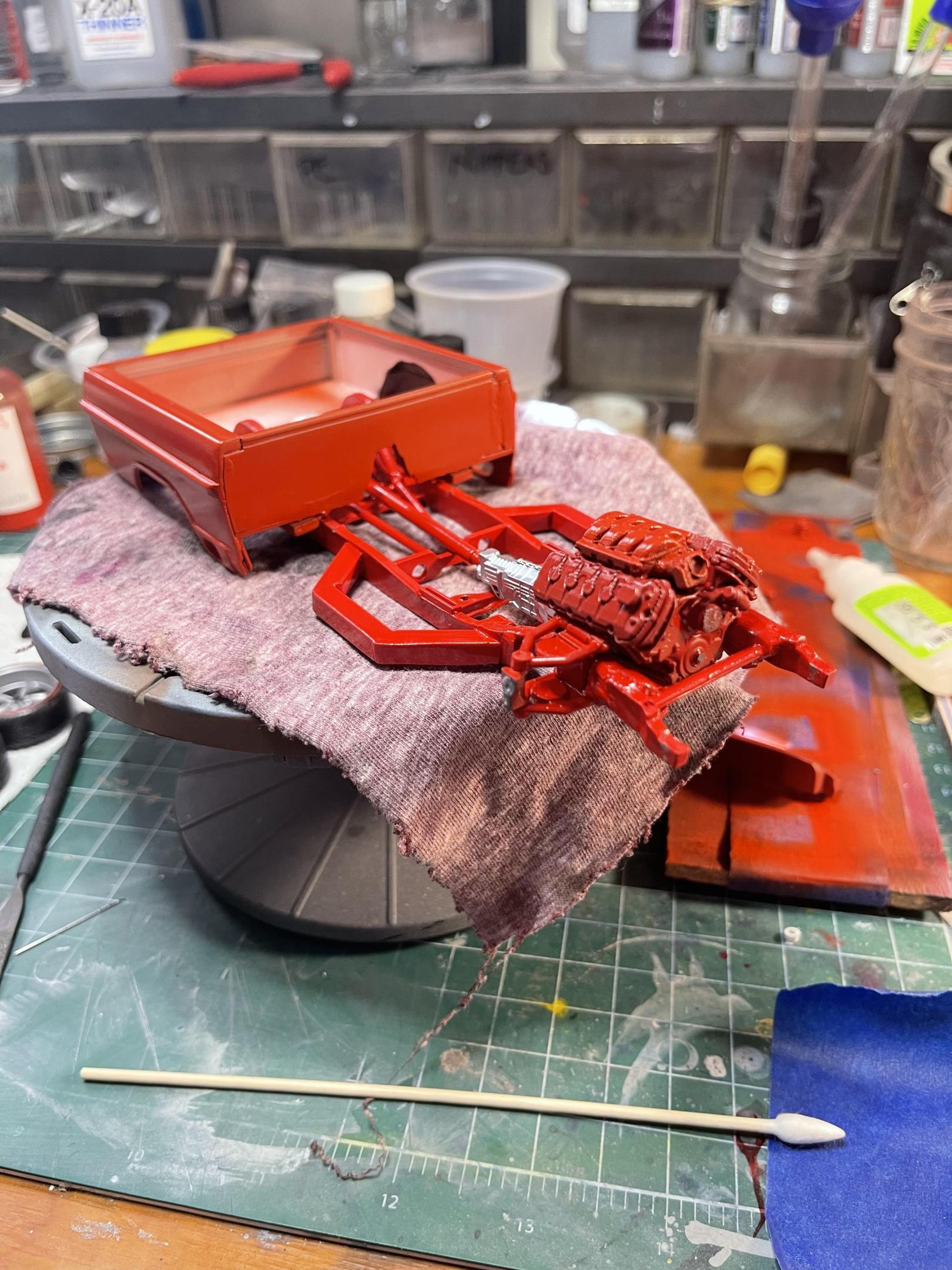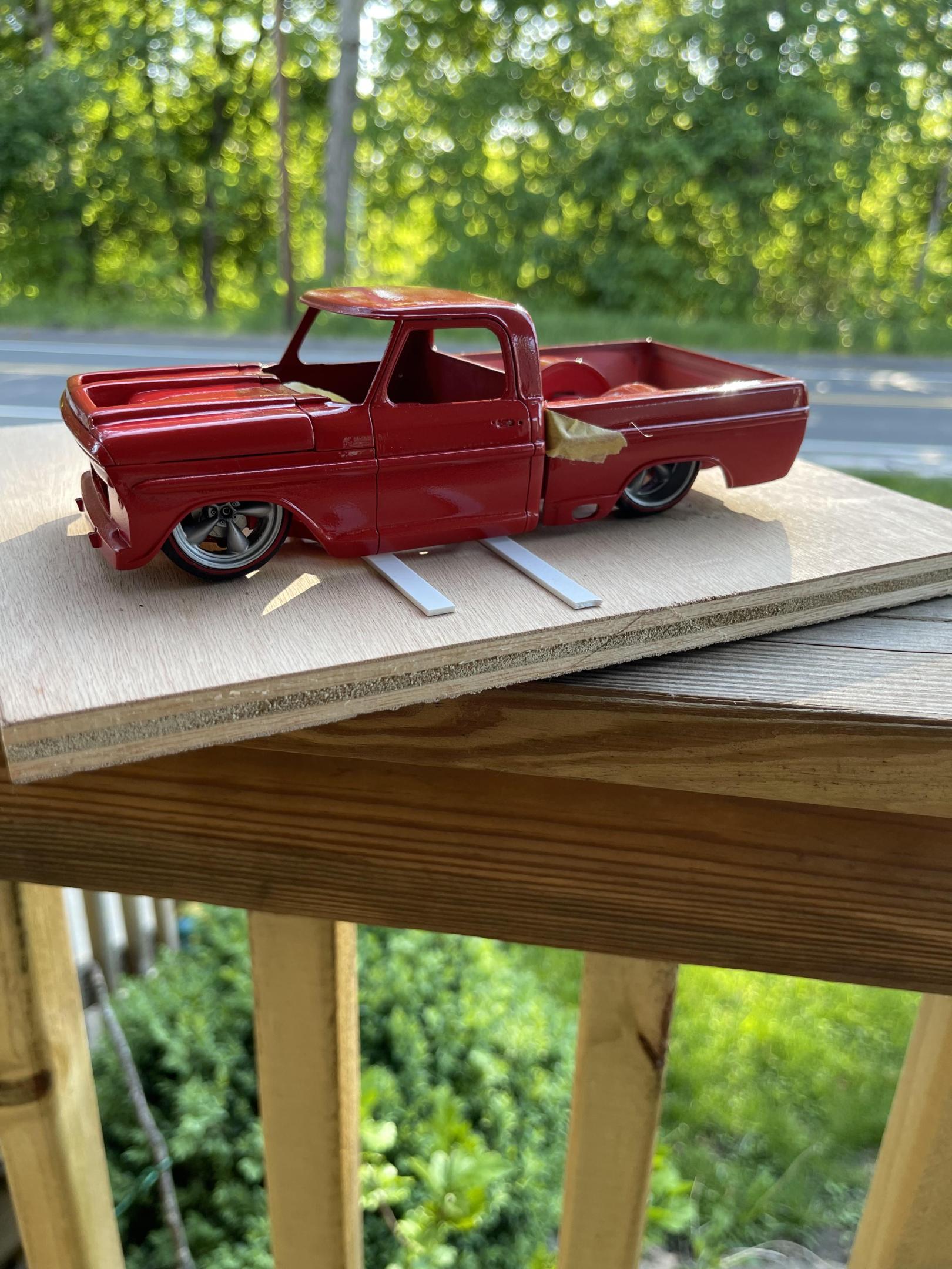 So here’s a little update. I have switched from a candy red to Ferrari Rosso #304(original). The candy was nice, but I did the hood& cab think I over sprayed it, as it came out a scarlet/burgundy color, which didn’t fly. I went with OG Ferrari red and happy with choice. 2k clear applied as well. I finished the body mods, except the bed, which I am doing a real wood bed, elevated to hide the frame work, fuel cell and air ride equipment. Fab’d the basswood strips, styrene for bed rails. Hoping to have it open and close. got most of trim done and got some trim in dash to complete. Engine is getting there and mounted. Squeezing that monster into the engine compartment was tight, but made a custom firewall and squeezed it in. Stance is set and wheels are painted and added the redline stripe on tires. That’s all for now , peace out and model on!!! -