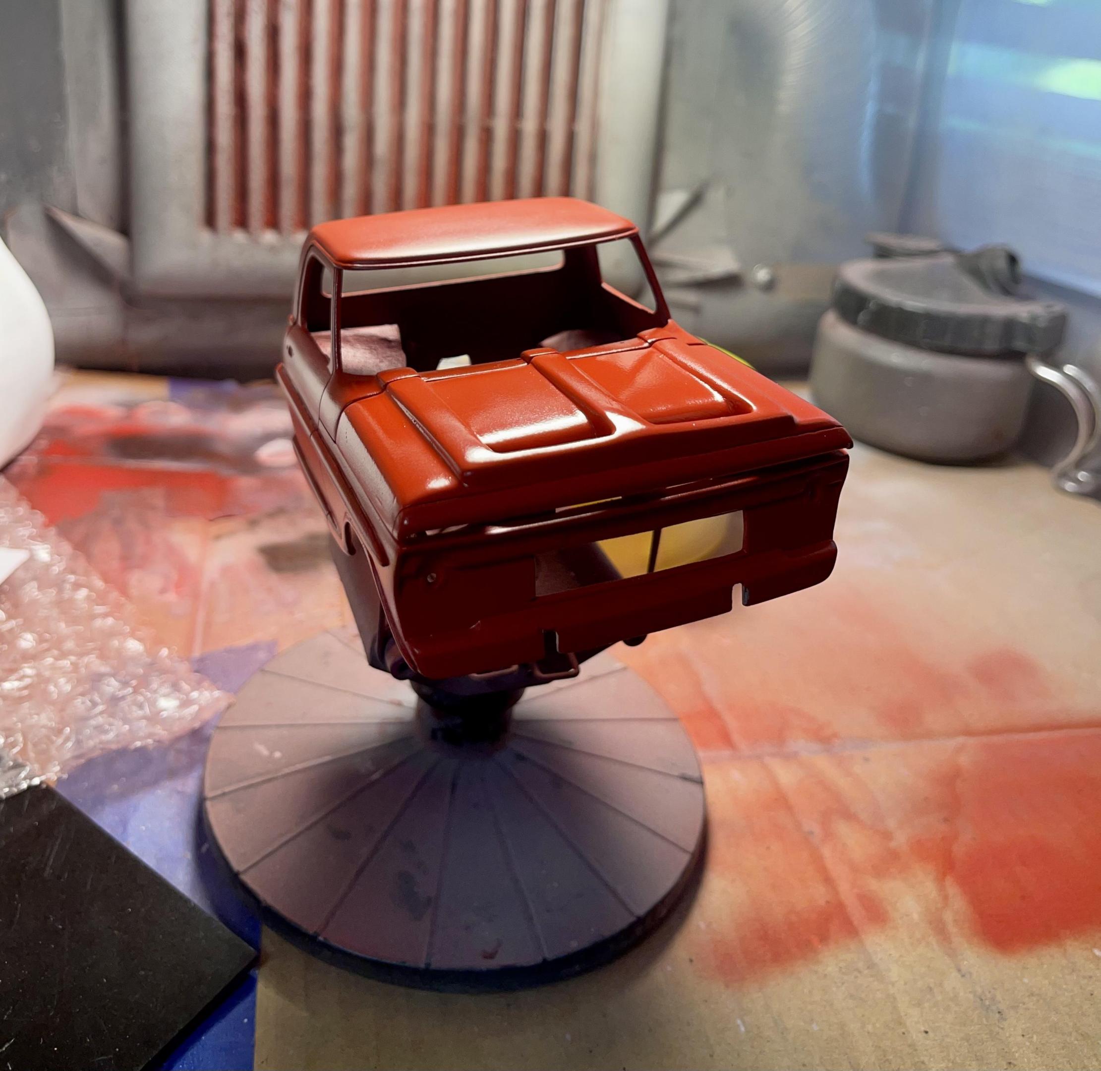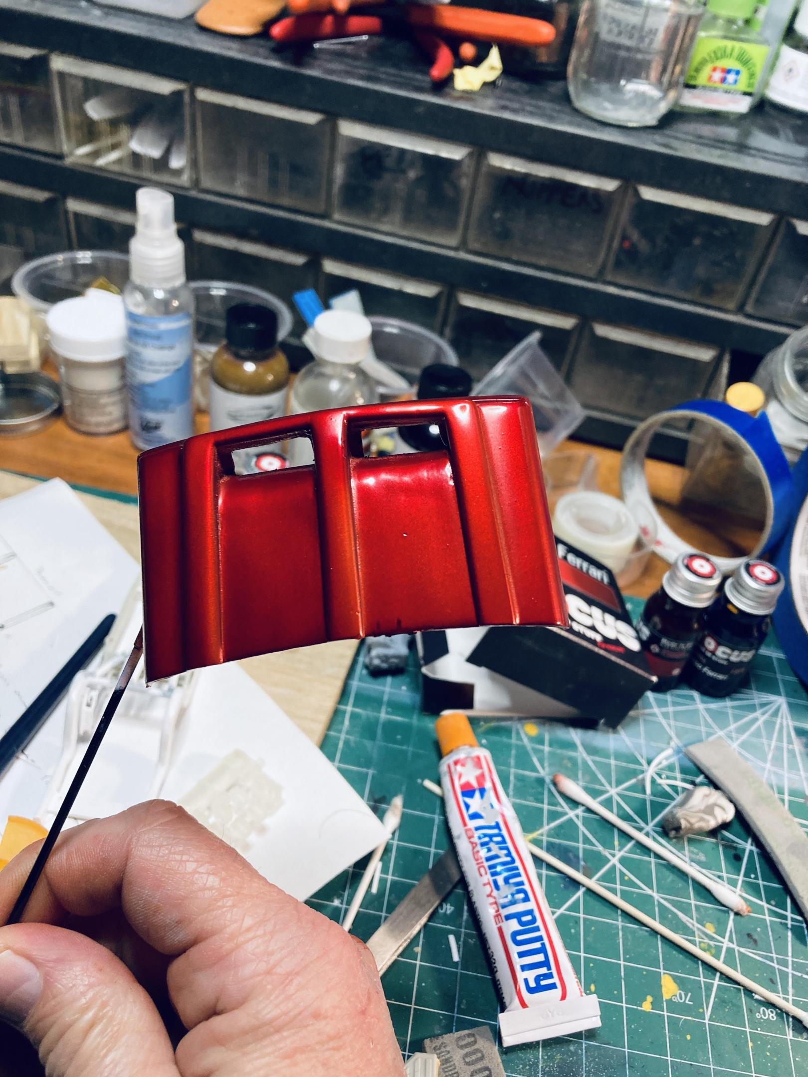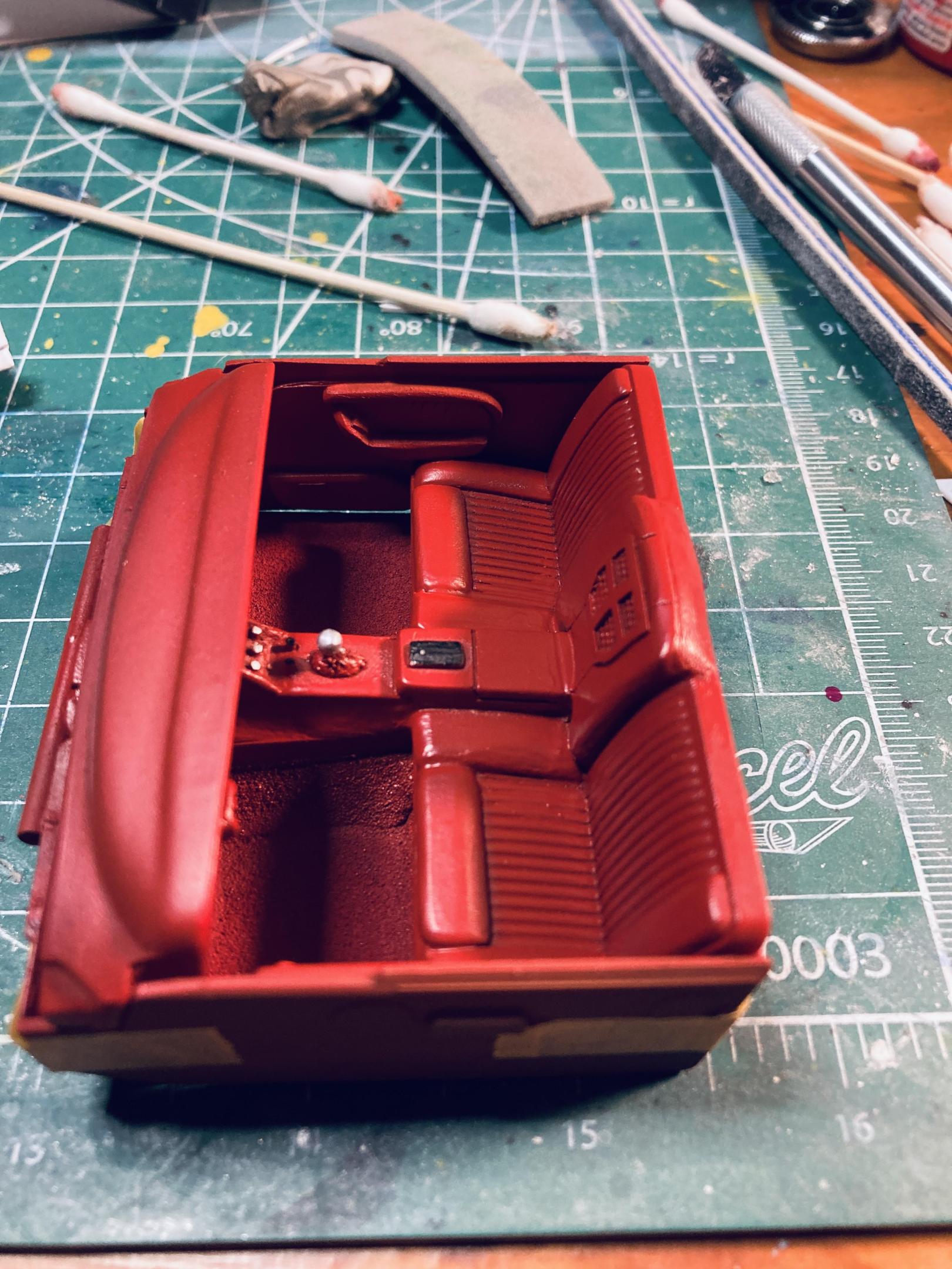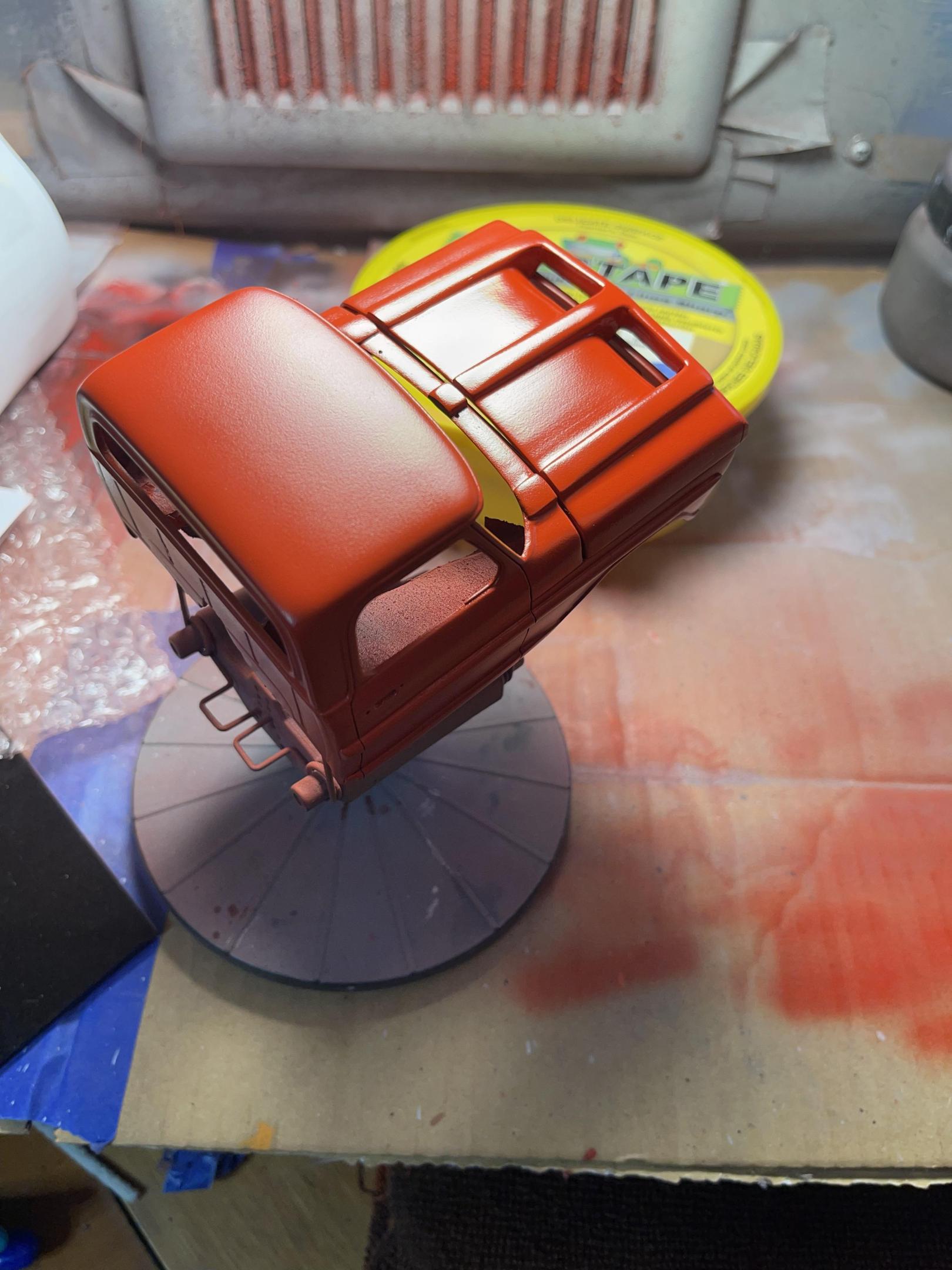 So here’s a little update. I have switched from a candy red to Ferrari Rosso #304(original). The candy was nice, but I did the hood& cab think I over sprayed it, as it came out a scarlet/burgundy color, which didn’t fly. I went with OG Ferrari red and happy with choice. 2k clear applied as well. I finished the body mods, except the bed, which I am doing a real wood bed, elevated to hide the frame work, fuel cell and air ride equipment. Fab’d the basswood strips, styrene for bed rails. Hoping to have it open and close. got most of trim done and got some trim in dash to complete. Engine is getting there and mounted. Squeezing that monster into the engine compartment was tight, but made a custom firewall and squeezed it in. Stance is set and wheels are painted and added the redline stripe on tires. That’s all for now , peace out and model on!!! -