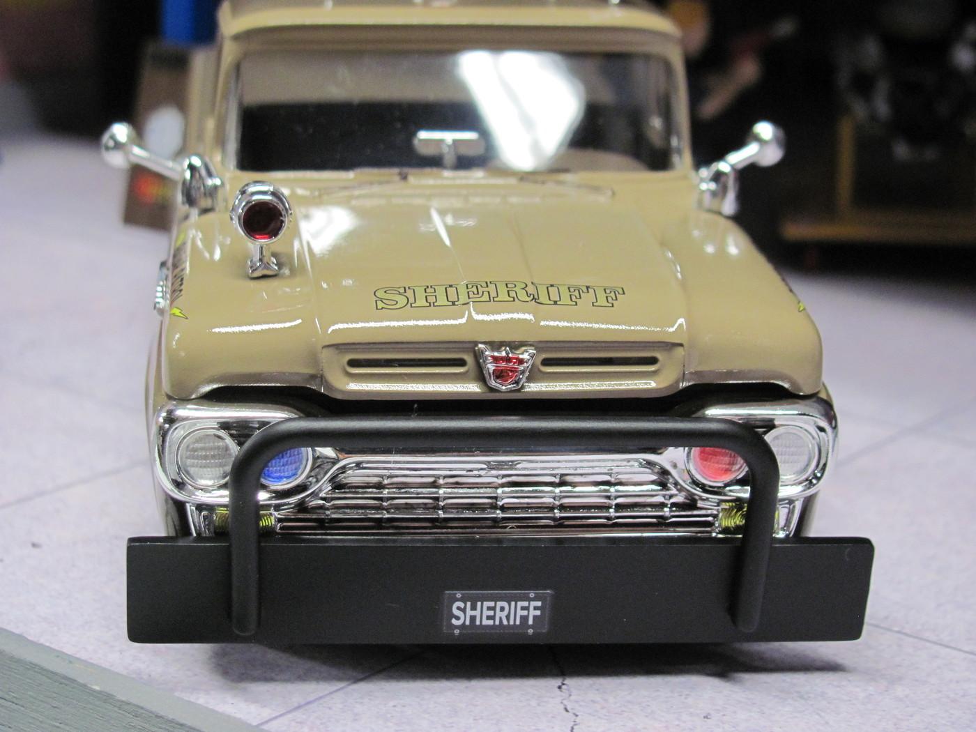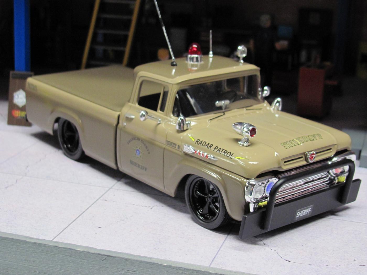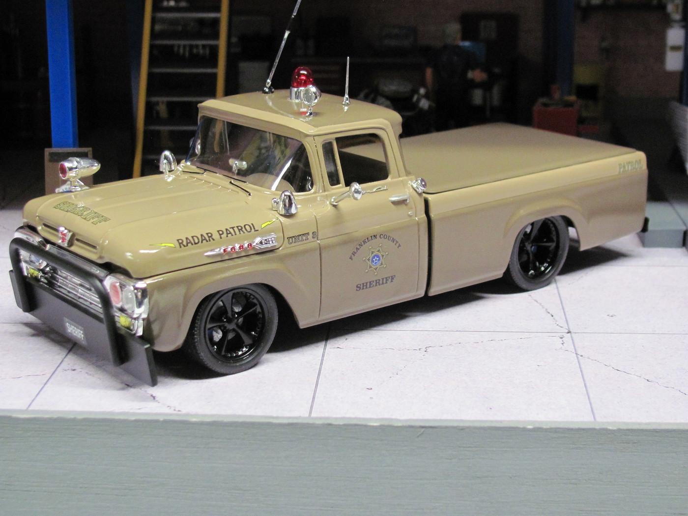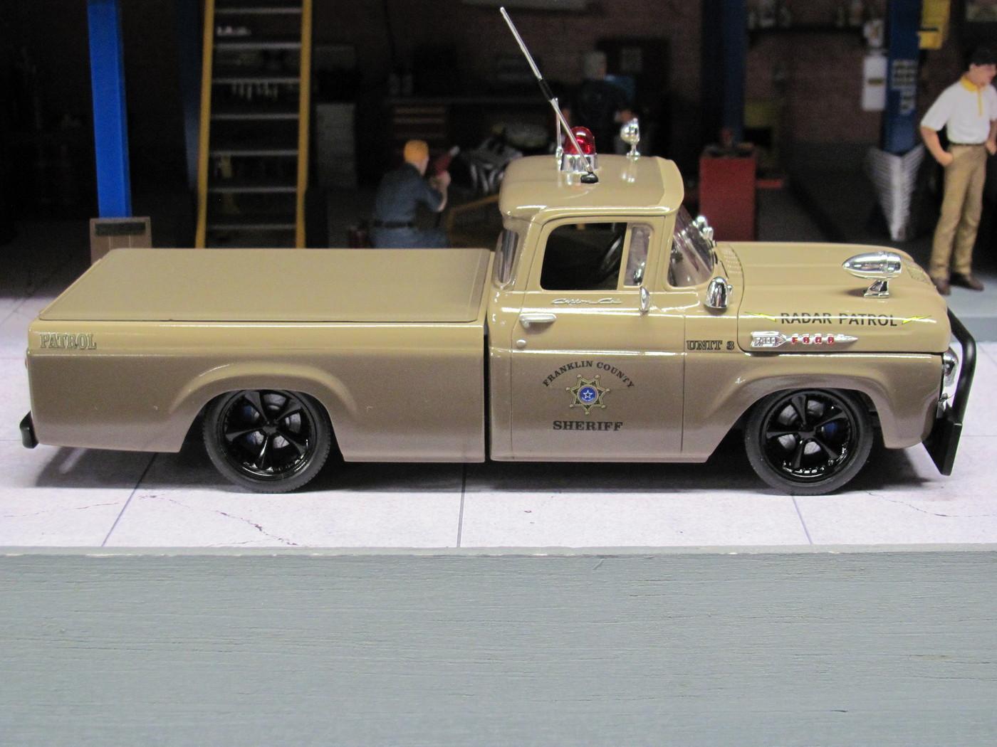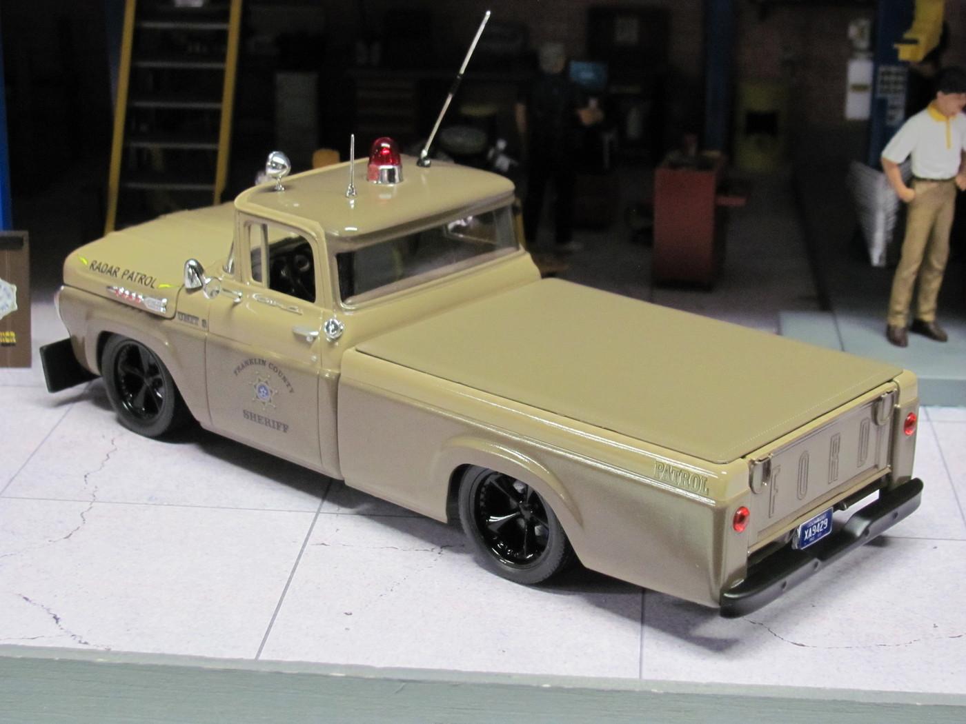 There is a new Sheriff in the town of Speedville who's done playing games with the hotrodders in town....lol. All Tamiya colors,used the Foose wheels and tires from the 56 pickup,police equipment came from the revell 57 ford Del Rio wagon and the parts box. Made the front bumper from a push bumper from the AMT '60 Chevy El Camino and some sprue that so happened to be shaped the way that you see here
