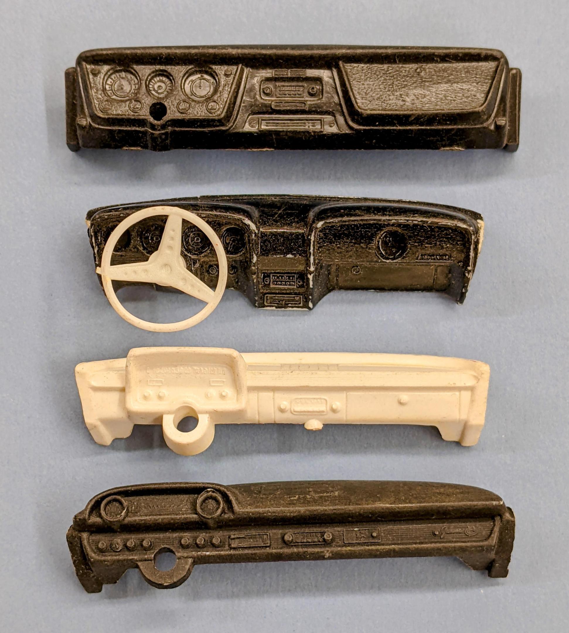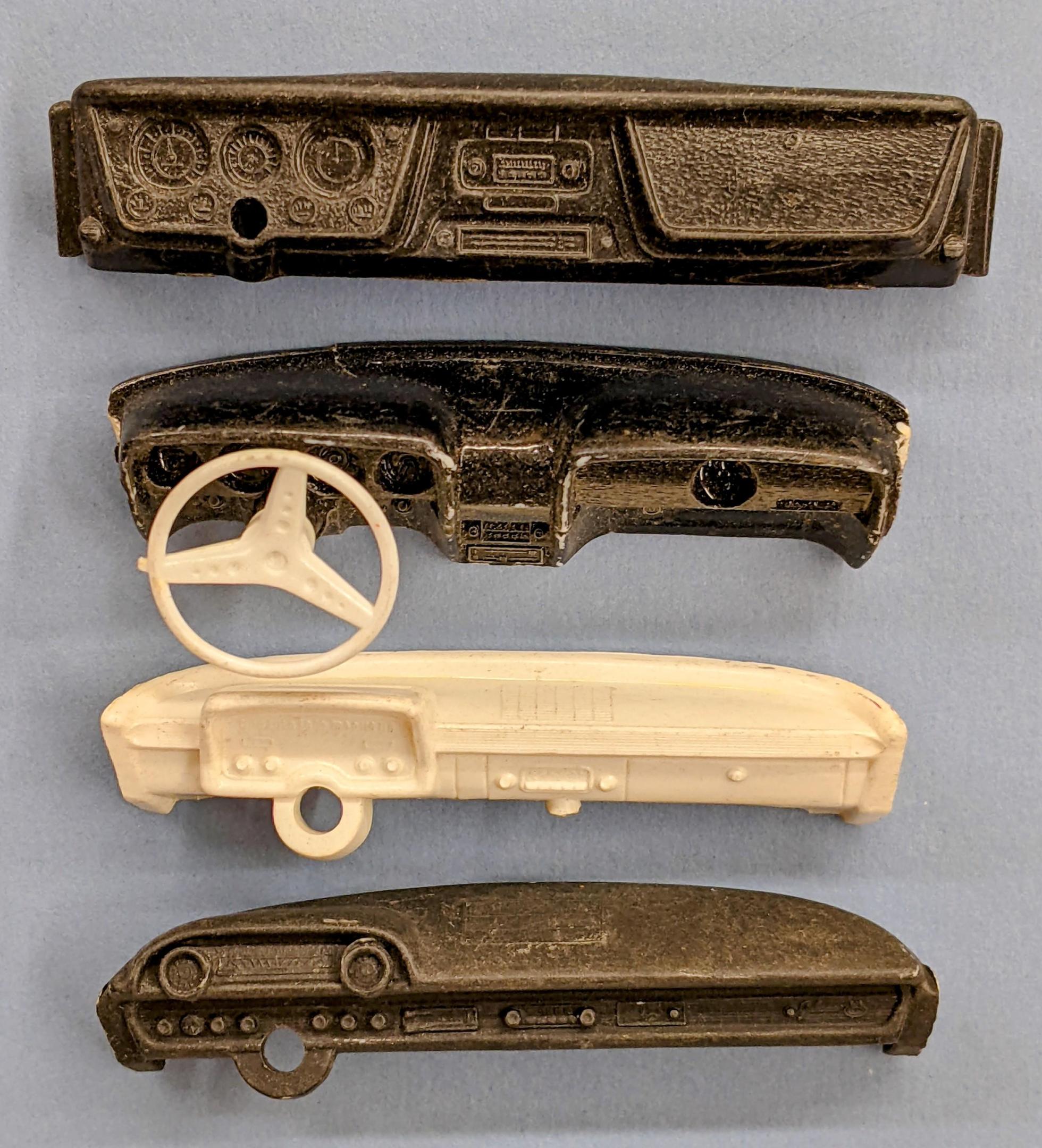 I have a few dashboards I could use help identifying. Top black dash is MPC '67-'72 Chevy I believe, likely from the "Heavy Pedal" issue? Second is '70 Cougar? Pretty sure that tiny script on the glovebox says Cougar, not Mustang. White dash, no clue...late '50s GM? Bottom dash, in flat black, does have a script, too, but too unclear to make out.