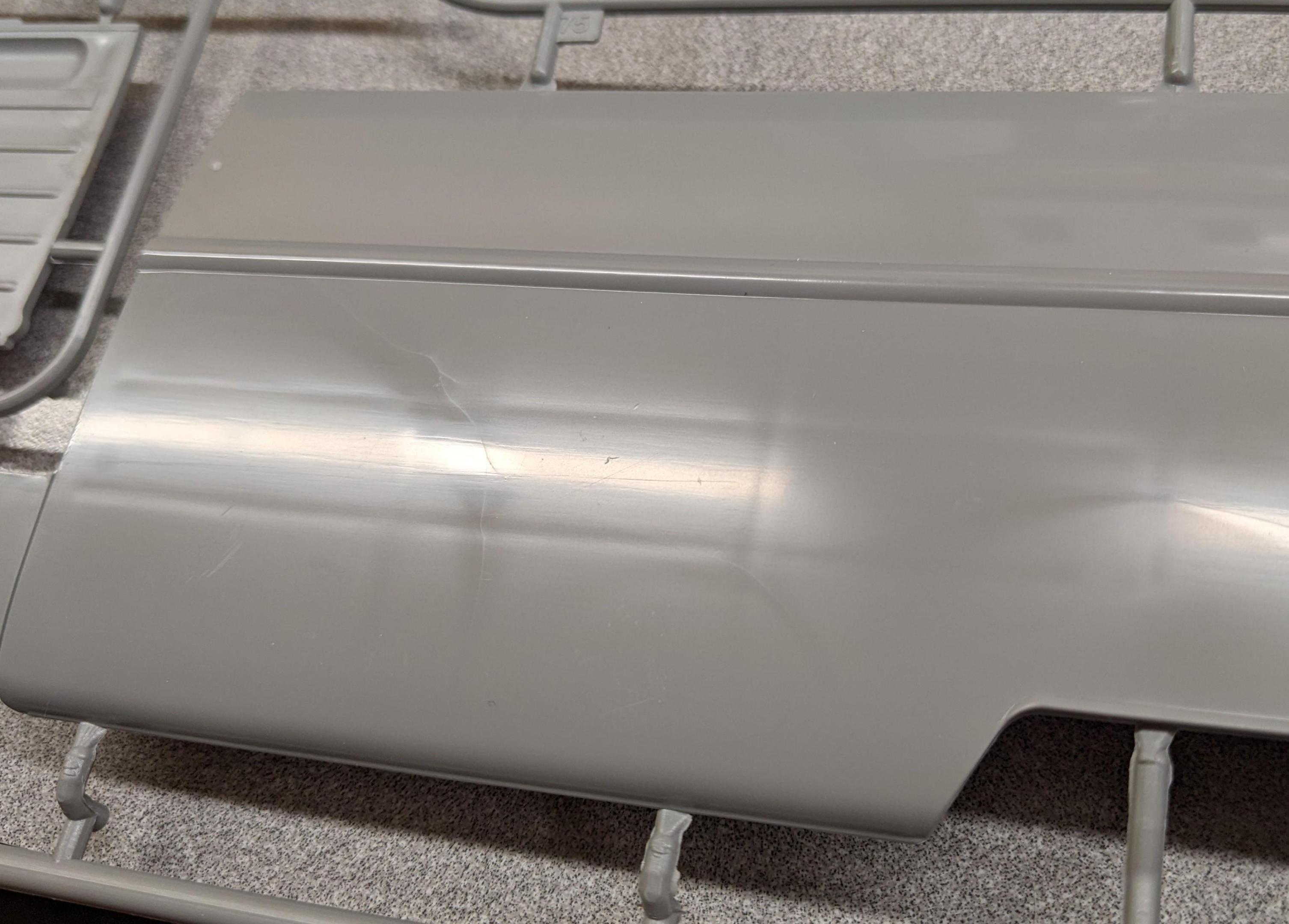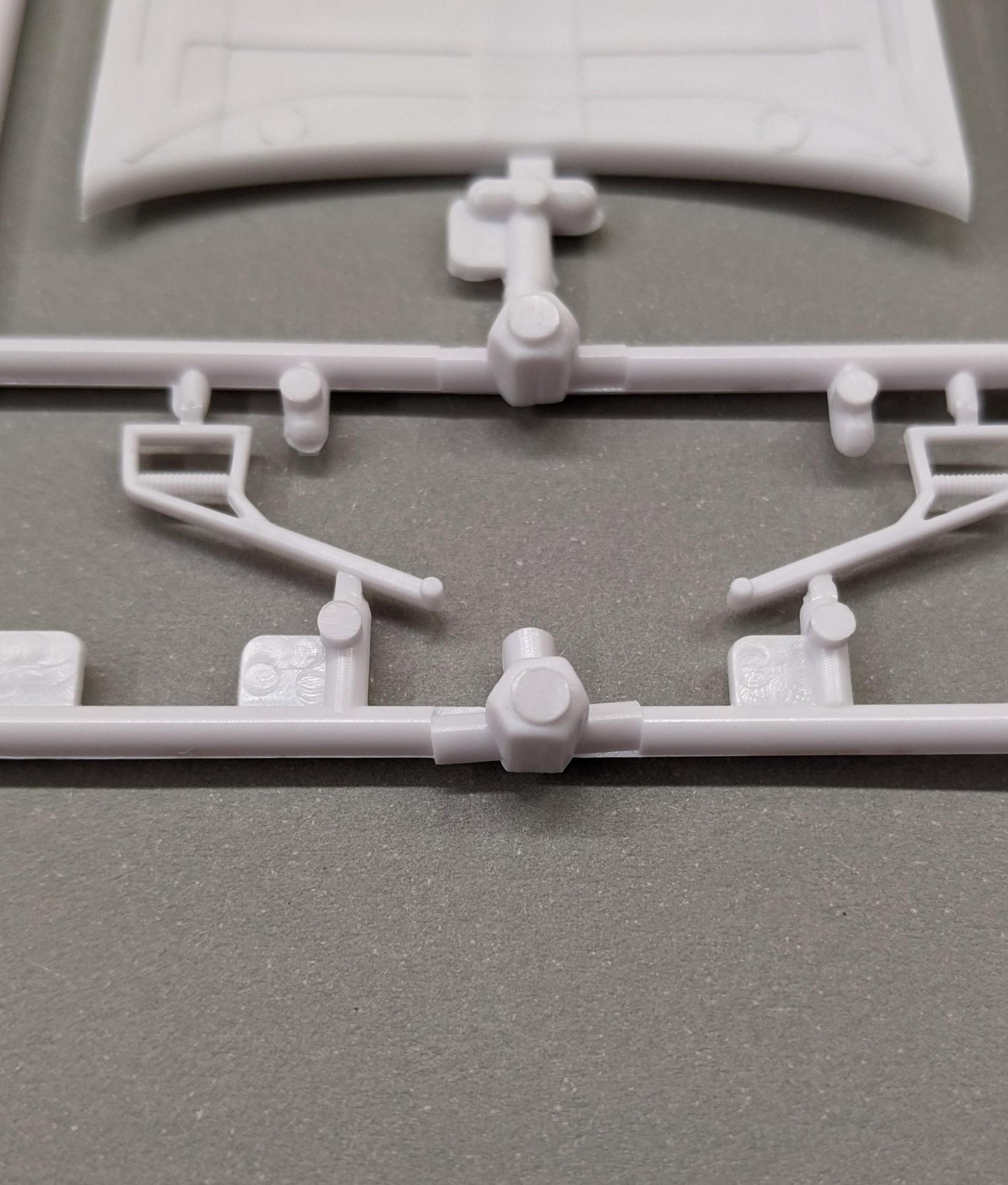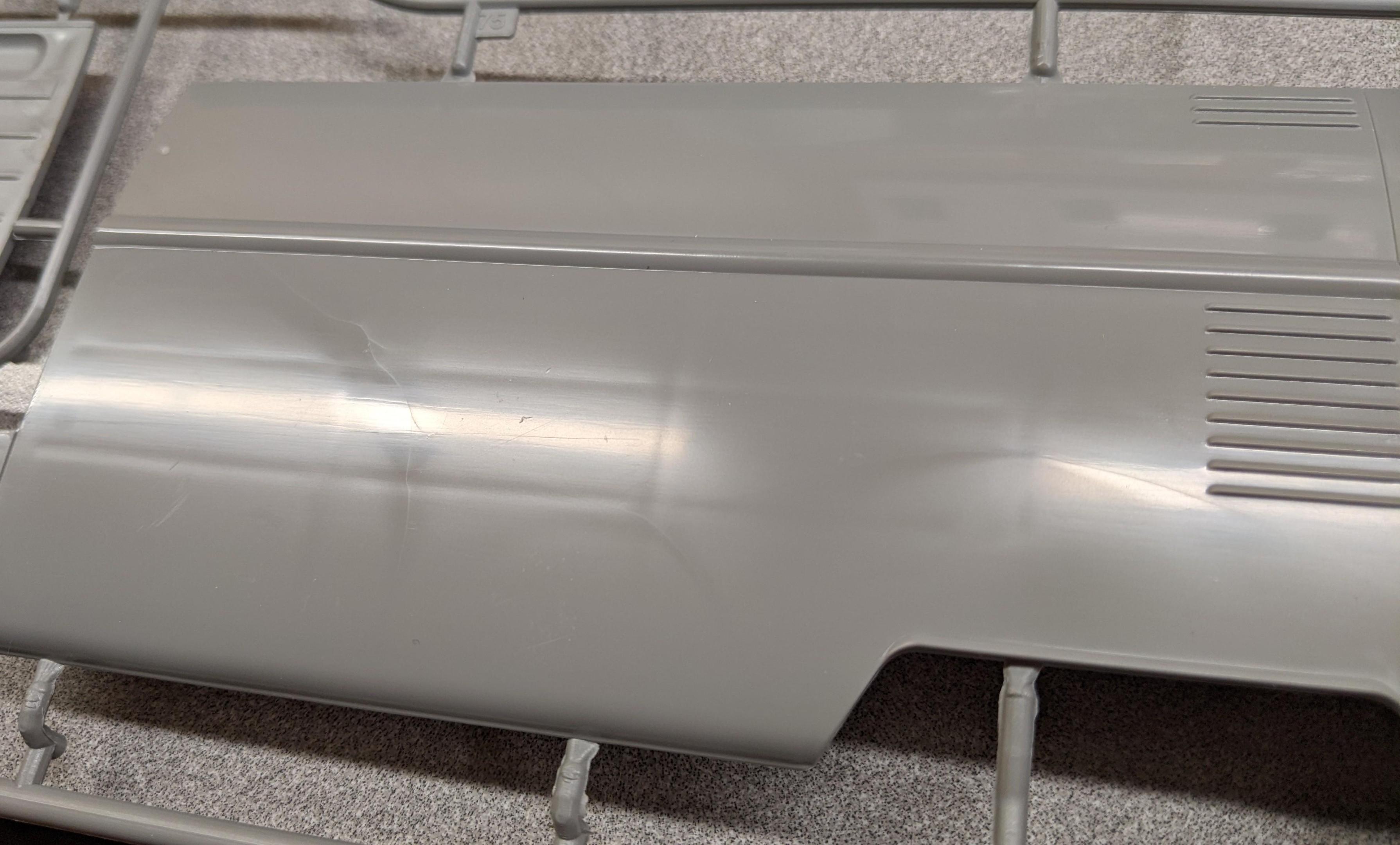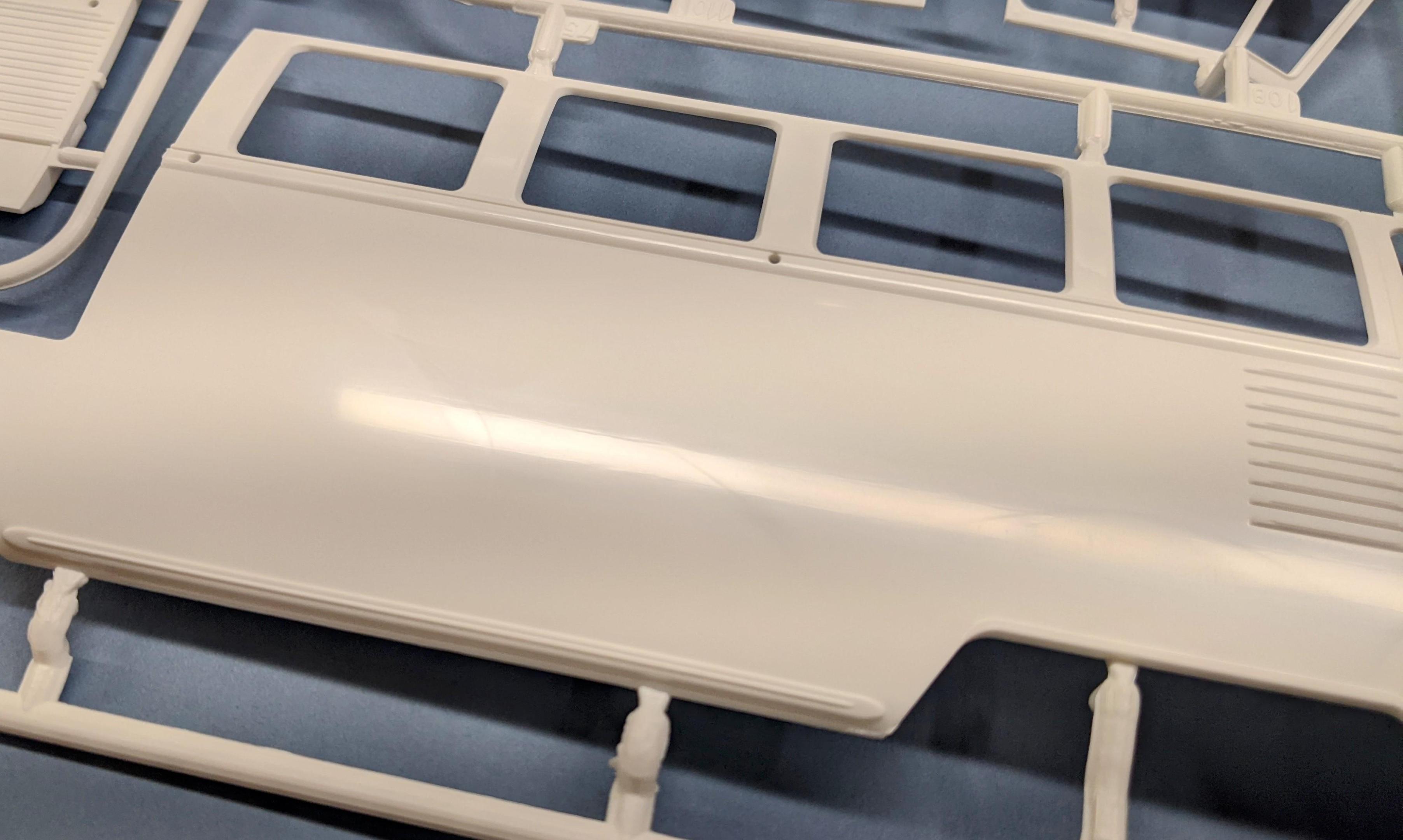 There are very few, but also consider many of the larger panels mate to a second piece, so only one side of each piece is visible. That said, I did just now look over the parts again, searching and feeling for sink marks, and why not typical of the rest of the kit's parts, the left rear body piece does have quite a few sink marks, like so: There is another faint sink mark in the floorpan between the wheelhouses, but that will not be visible once assembled. Other than those two, everything else appears sink mark free. -