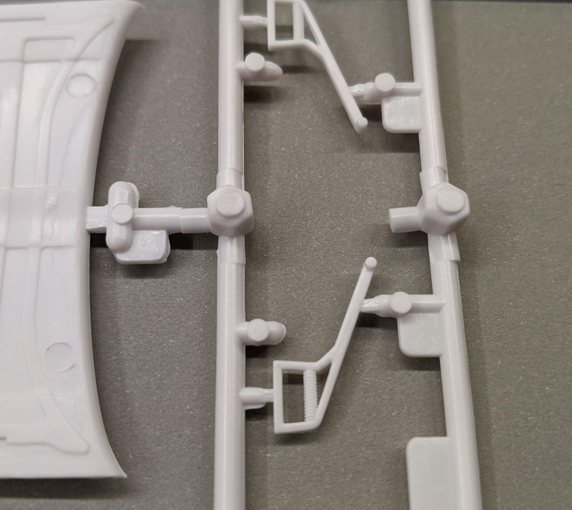 Adding the image again: While taking pictures of the 1/25 Revell '72 Olds Cutlass Custom (convertible) kit's parts, I took a few extra shots of the area occupied by both the standard and W-30 dual scoop hood. You can make out the half-valve(?, not sure what this specific union is referred to as, in this context) which can be rotated to either allow or forbid molten plastic to flow into each specific hood cavity, while still allowing plastic to flow through half of the runner. In the above mentioned kit, only the standard hood is included, and is shown below next to an empty spot where the W-30 hood would be located. Here's the group of parts: Close-up of both (slightly misaligned) open and closed half-valve inserts(?):