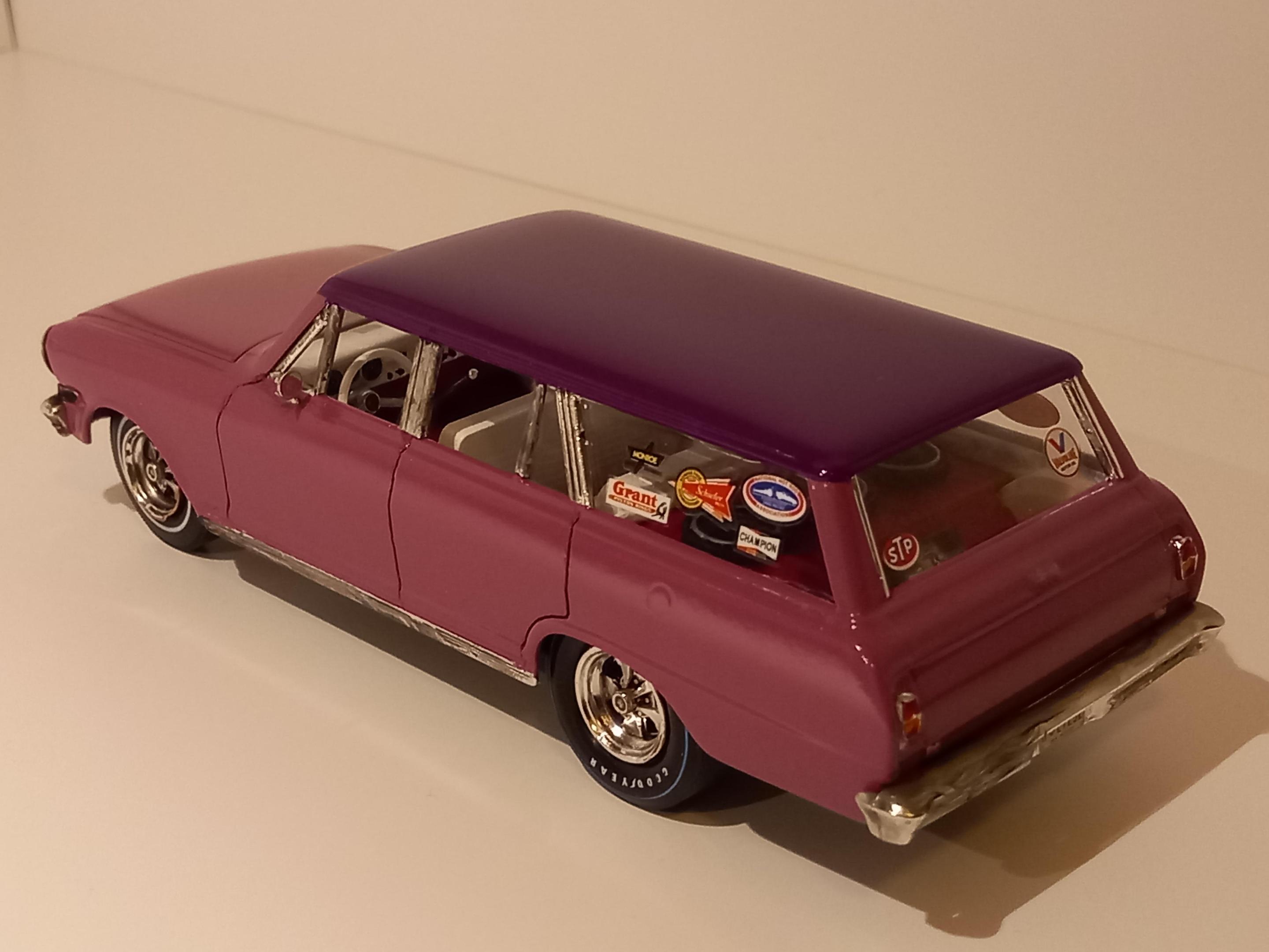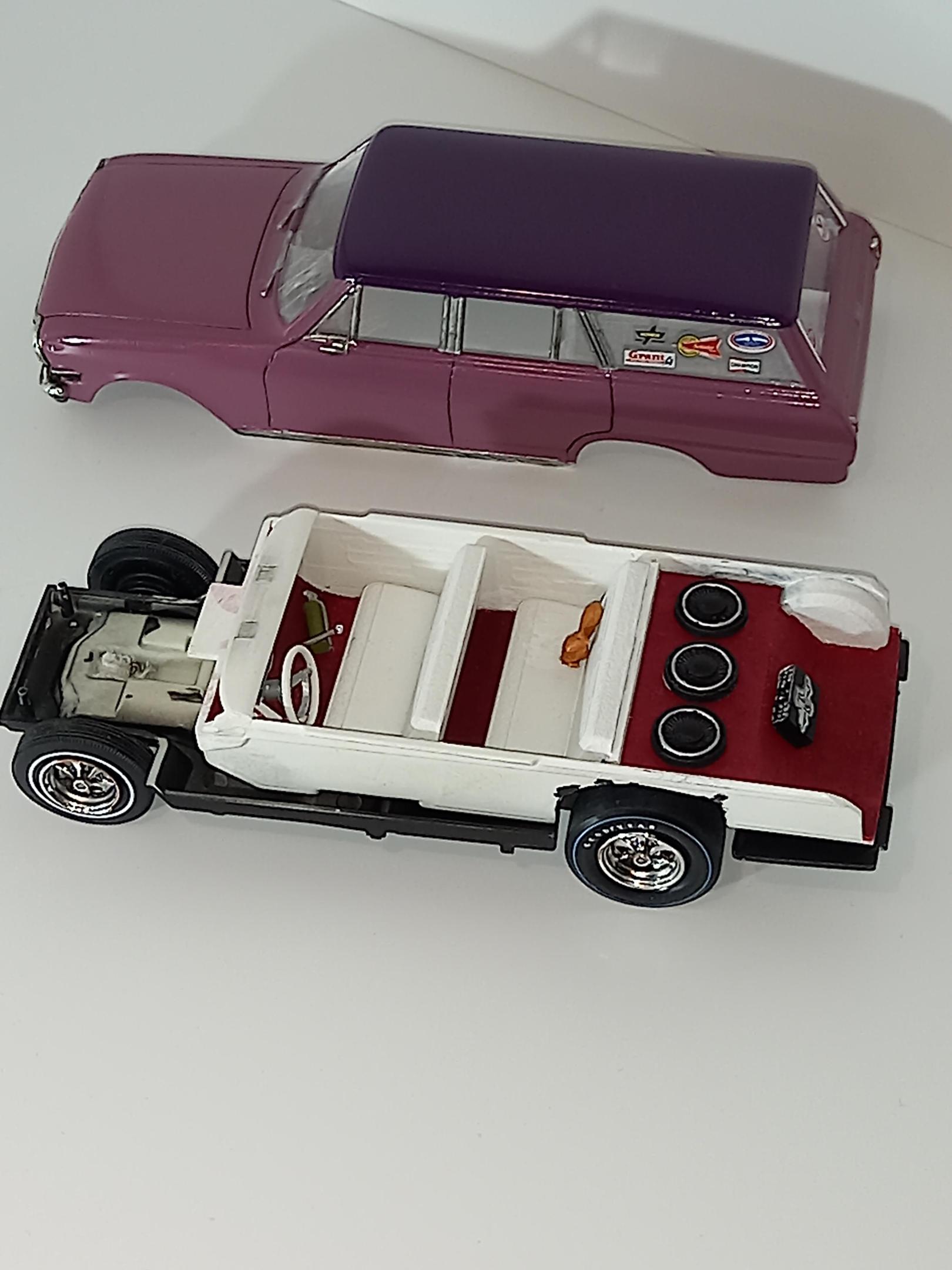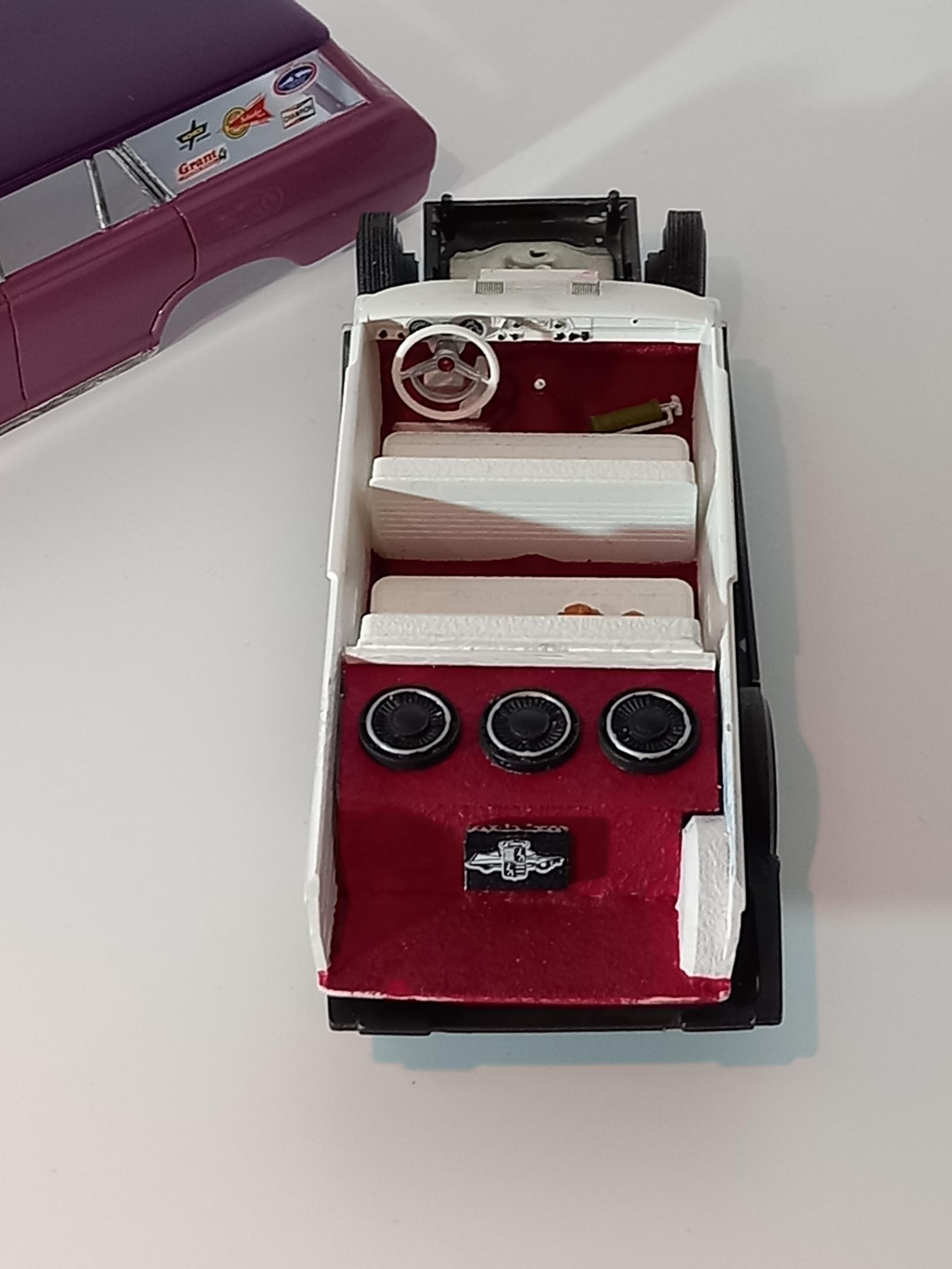My first finished kit, started half 2021. Tried to do several tricks, shaving, two-tone, other wheels, new axels, lowering, decals, interior with speakers (this was a must to fit the big tires). Not curtain what style it is...sleeper, drag, taildragger...its a mix of everything haha. Shaving the sides was a real hard job, after every paintjob they popped up again. So learnt alot about sanding, primer etc etc
