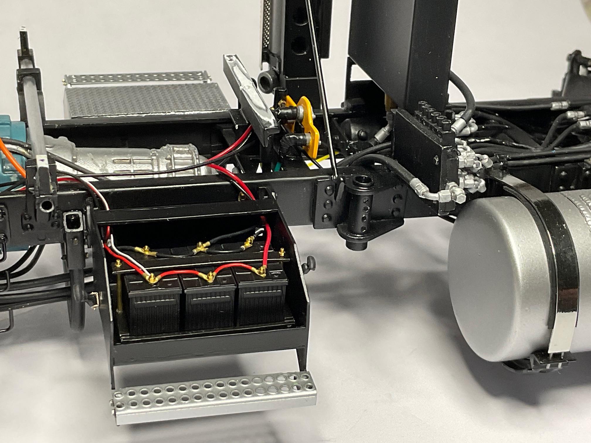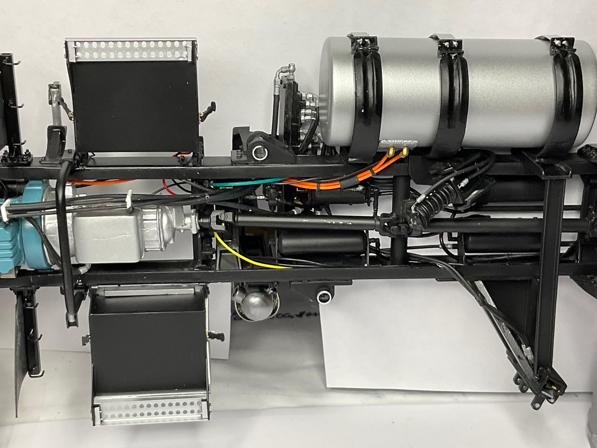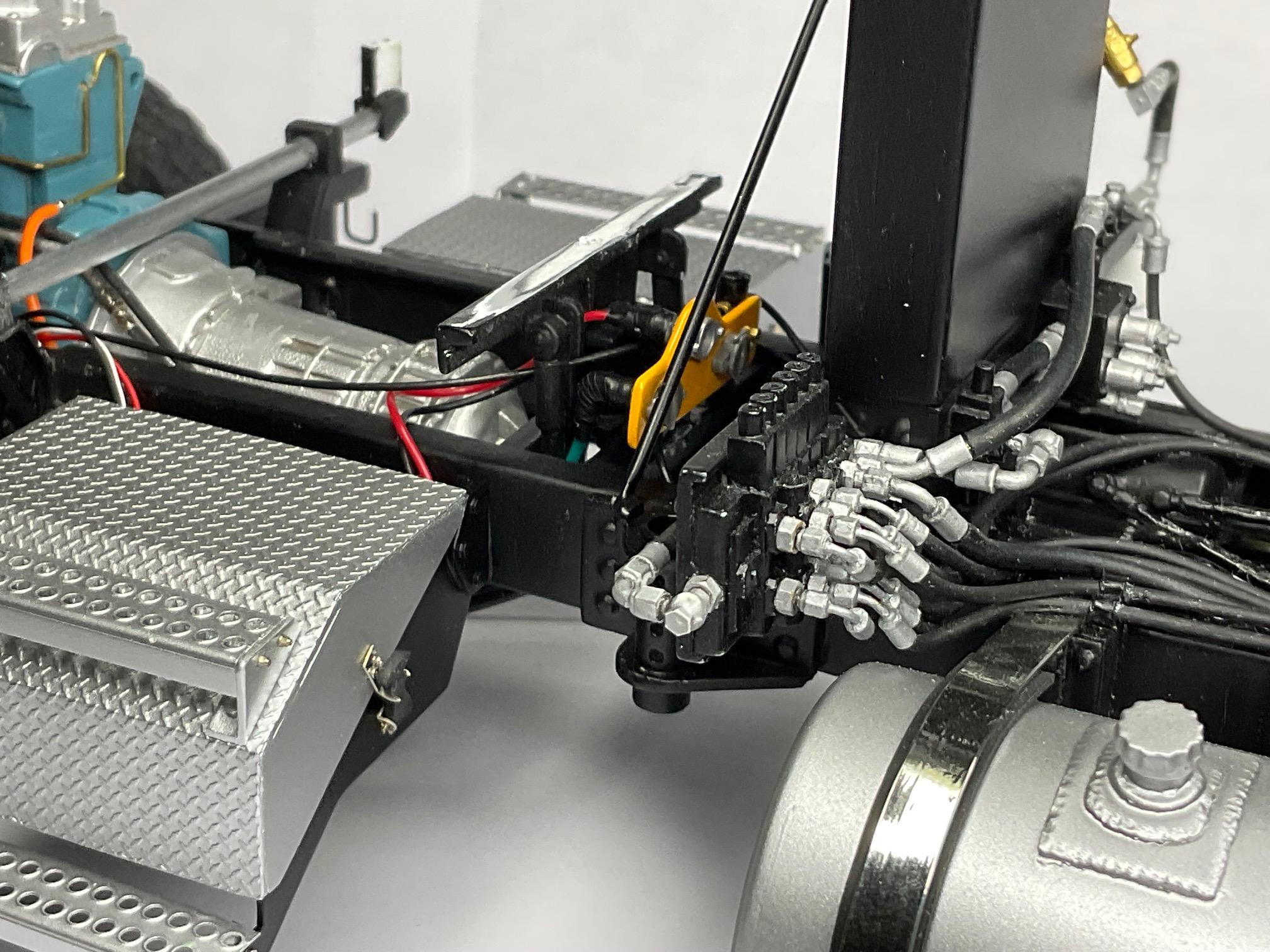 After a couple trial runs, threading the tubing where they needed to go, and positioning the connections plate on the cross member, I got the plate assembly CA glued to the cross member, and didn't break anything! Yellow plate glued in place - had to make up two battery cable ends for the sander connection and attach them to the wires before gluing plate in place. Then, fed them into battery box and bolted them in place - I just ran the trailer wiring, ABS wiring and trailer air line runs along the frame and ended them 'out of sight'. They can be partially seen from above and that's what matters most - Will be a tight fit, using tweezers, to get sander cable glued into the top connector, without making a mess - Showing the tractor protection valve a bit better. I took some liberties while fabricating it, but it looks the part - Still don't have my last order of chrome paint to test with. Next, finally, I need to make the air cleaner and then chrome it and all the other cab/hood bits when I decide which chrome paint to use. Hope to get the rest of the paint soon! -