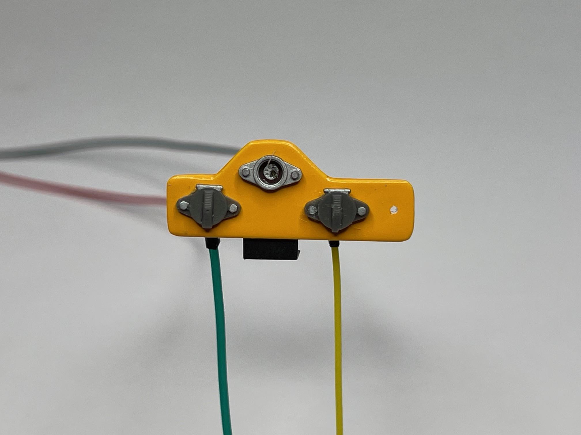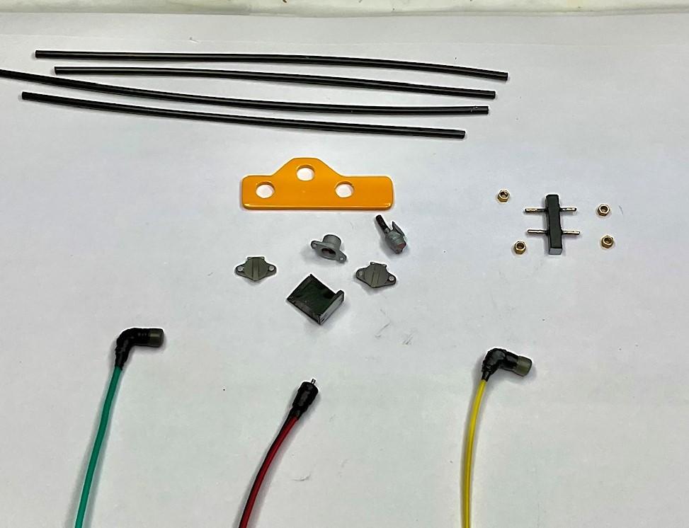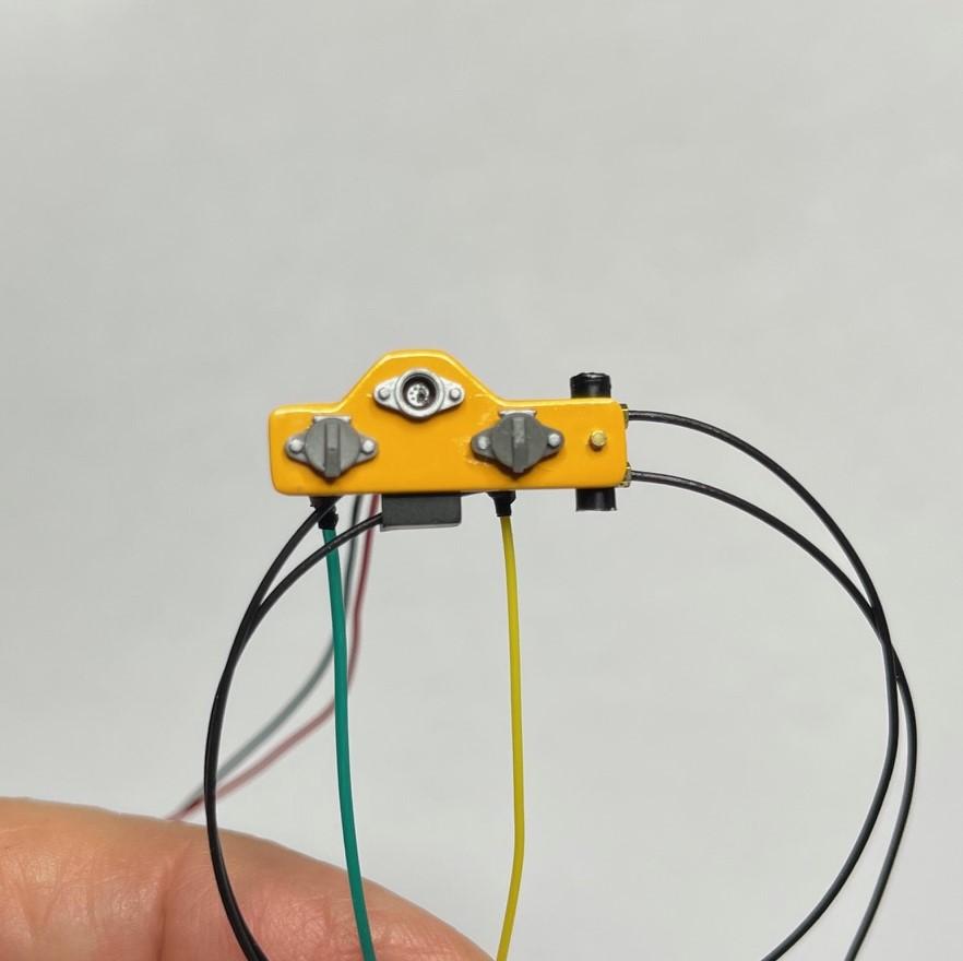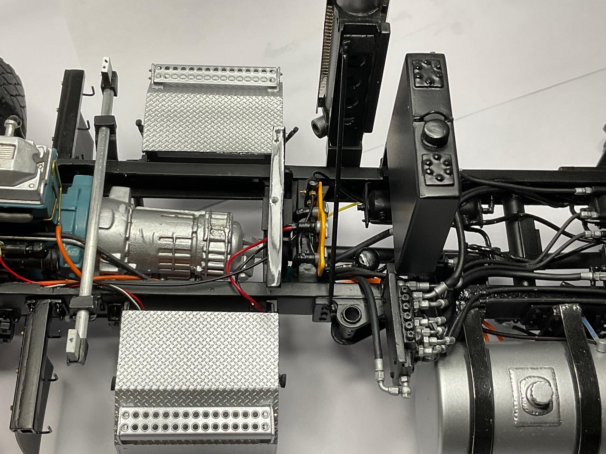 After a couple trial runs, threading the tubing where they needed to go, and positioning the connections plate on the cross member, I got the plate assembly CA glued to the cross member, and didn't break anything! Yellow plate glued in place - had to make up two battery cable ends for the sander connection and attach them to the wires before gluing plate in place. Then, fed them into battery box and bolted them in place - I just ran the trailer wiring, ABS wiring and trailer air line runs along the frame and ended them 'out of sight'. They can be partially seen from above and that's what matters most - Will be a tight fit, using tweezers, to get sander cable glued into the top connector, without making a mess - Showing the tractor protection valve a bit better. I took some liberties while fabricating it, but it looks the part - Still don't have my last order of chrome paint to test with. Next, finally, I need to make the air cleaner and then chrome it and all the other cab/hood bits when I decide which chrome paint to use. Hope to get the rest of the paint soon! -