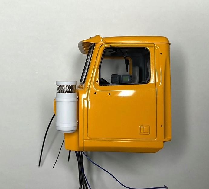 Jurgen - thanks a lot. Just trying to get as much into this as I can. Daniel - always problems to overcome when scratch building, as you well know! Thanks. Much appreciated, Jeff, as always. Lots of those 'problems' are of my own making! Made some more progress with air cleaner. Got some straps attached and trimmed up a silicone air pipe connector, from Moluminum, to begin the air intake piping. And, had to fuss with a couple mock up pics. . . Started attaching 0.25mm x 2 mm strap to cannister mounts - Added four, photo etch bolt heads; pinned the trimmed silicone connector to match the angle coming from the air cleaner outlet - I now have everything lined up, to continue the under hood intake piping, once cannister (and other cab parts!) are chromed and attached. The gap between the cannister and the side of the cab fairing should, hopefully, allow the hood to close ok. I must have checked how far down the cannister could go, and not obstruct the hood, many times - I will have to check a couple more before the CA glue comes out! - I chickened out on the strap attachment on this side of the cannister - on the full size truck, the straps attach to the vertical edge of the cab. I just continued my straps around to the mount - I didn't want to risk a screw up after all this. . . Going to spend the next hour, or so, spraying some chrome paint tests - finally have some decent enough weather! Will let you know what happens. -