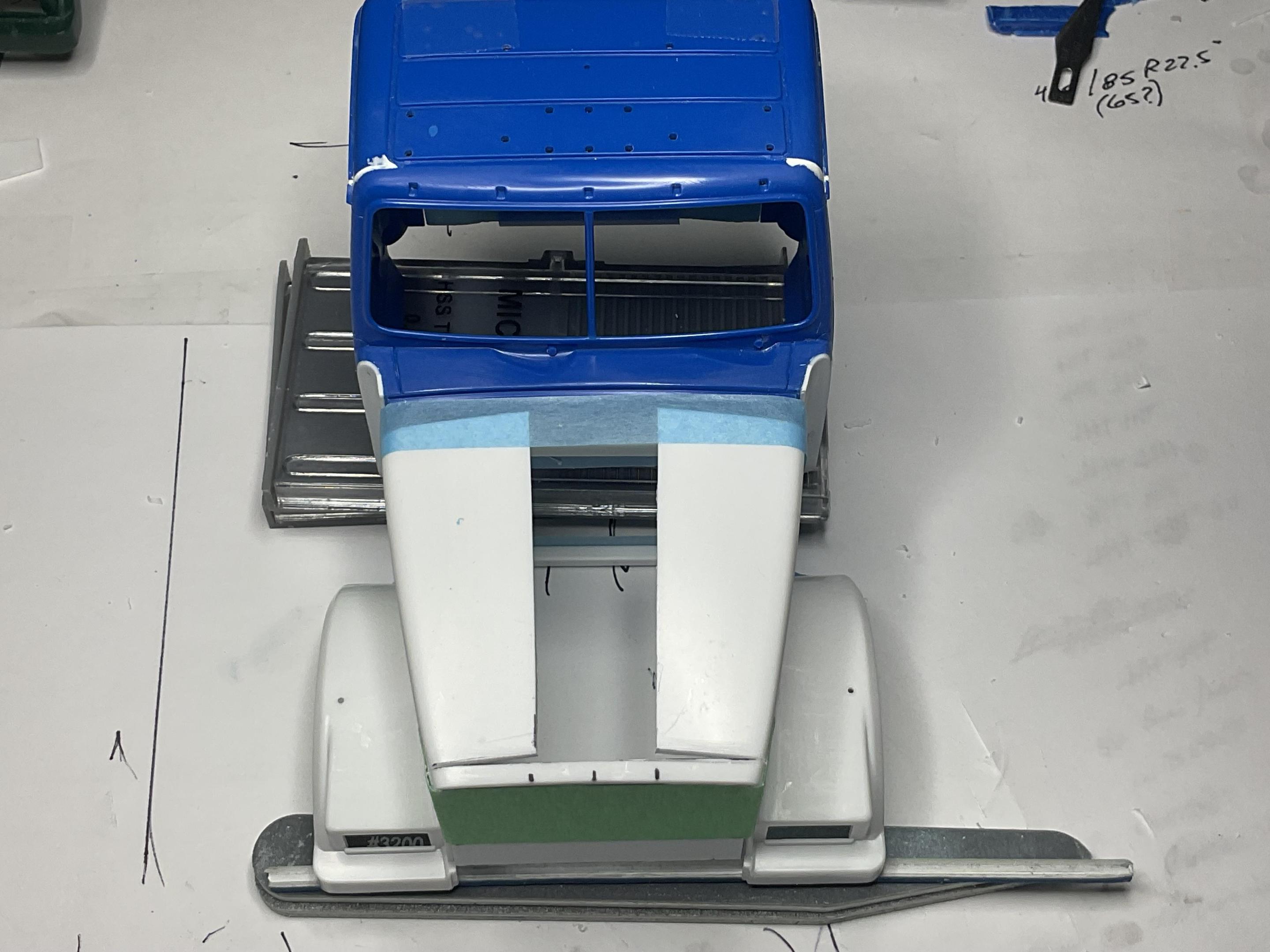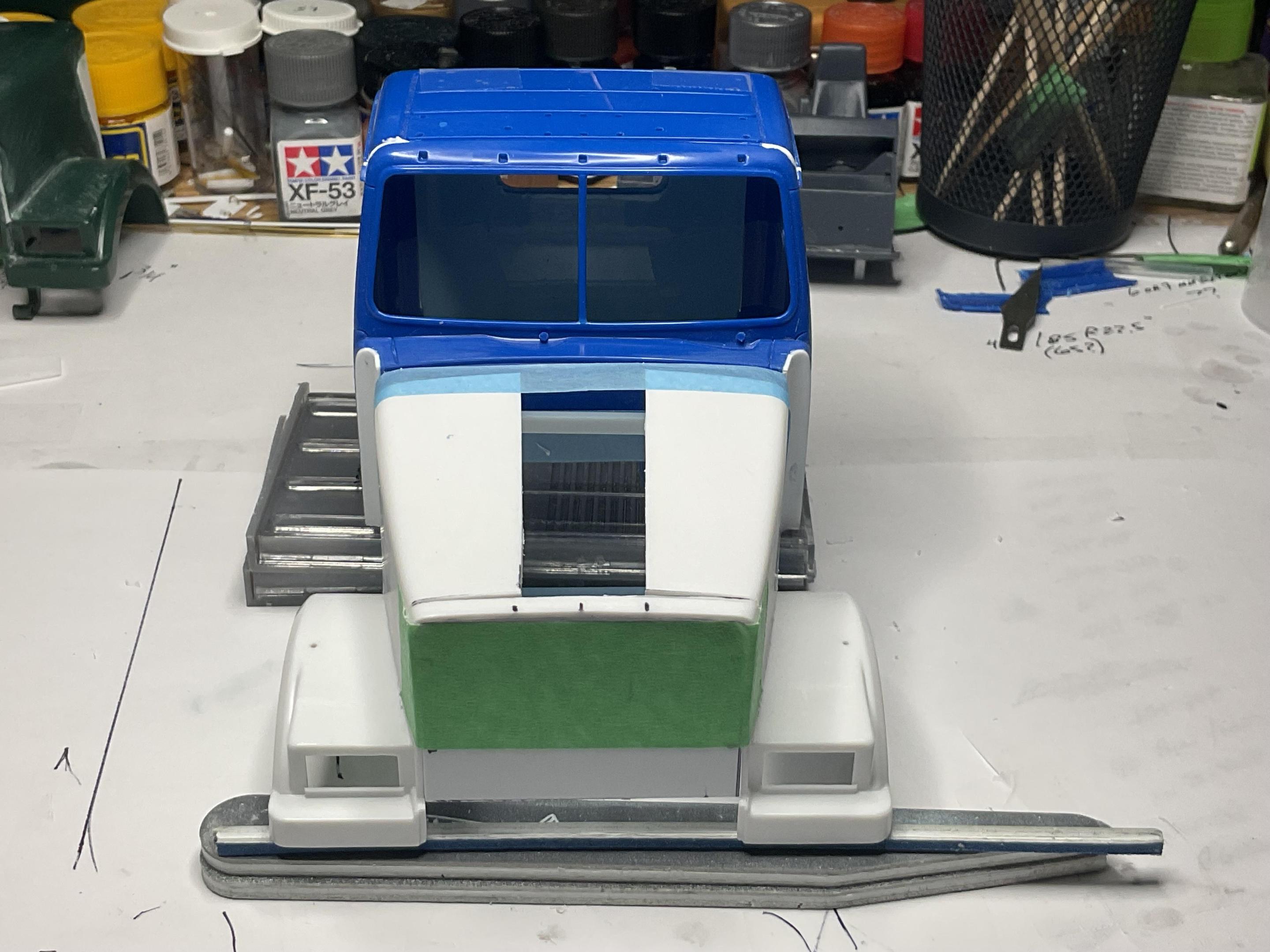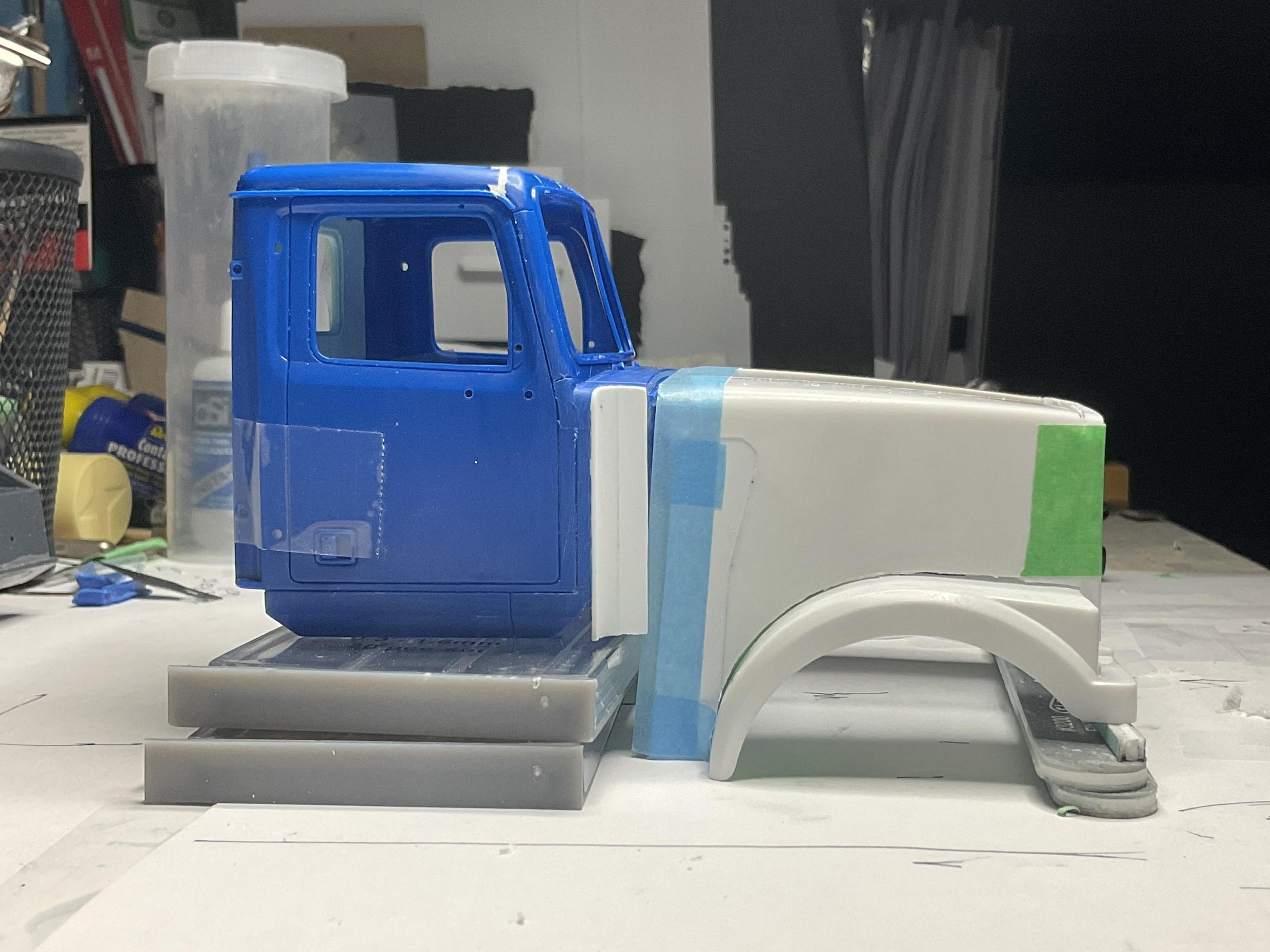 Western Star 4900 FA plow truckBK9300 replied to BK9300's topic in WIP: Model Trucks: Big Rigs and Heavy Equipment Finished making the cuts on the hood and gently bent the hood halves apart, and taped them down fairly close to their final position. A few repeat looking pics, but after all the cutting. Cuts made where fenders meet side panels, a wedge cut out of top and a relief line cut across top, front edge Fenders separated and taped down to desired width. The entire back edge of the hood will need to be cut approximately along the line defined by the blue tape Very close, not perfect, to the look/width of this year of 4900FA. It remains for me to do a decent job of gluing it all back together strong enough to put up with the puttying and sanding that will be needed to finish it off properly You can see better in this pic the need for the relief line across the top, front of the hood, to allow for the front edge of the hood halves to pull away when the back edge was spread apart. Happy with where the hood is at for now - still have to work on keeping the slight curvature of the back edge of the hood. May need to make a little styrene jig, with the needed curve, to set the hood on while filler styrene is glued in place. Hopefully, I can get this looking pretty good in the next few days. Take care!